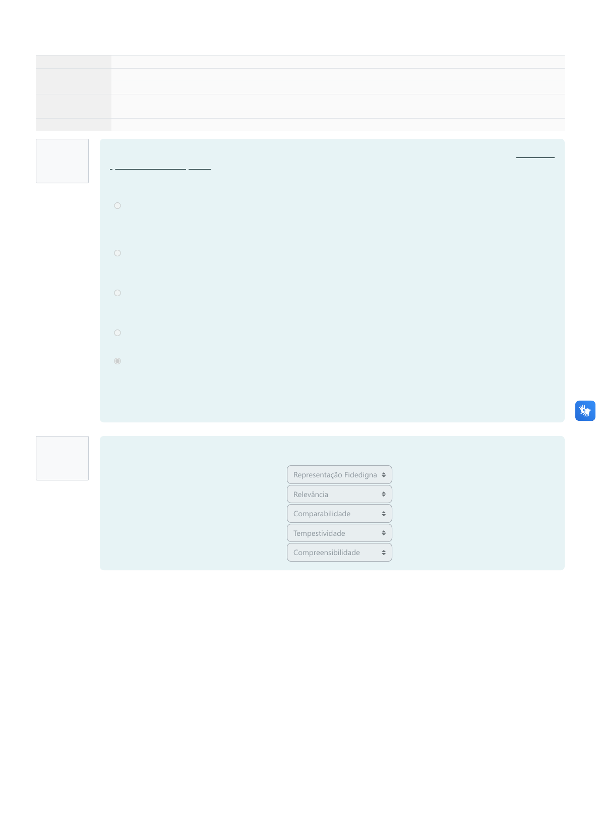 Questão 1 Completo Atingiu 2 de 2 Questão 2 Completo Atingiu 2 de 2 Iniciado em sábado, 28 out. 2023, 08:45 Estado Finalizada Concluída em sábado, 28 out. 2023, 09:29 Tempo empregado 43 minutos 25 segundos Avaliar 15 de um máximo de 15(100%) No plano de contas padronizado aplicado ao setor público, as contas contábeis são agrupadas em três grupos. Assinale a alternativa que o conceito corresponde ao grupo de natureza da conta contábil correta. a. Contas de natureza orçamentária - São contas que registram controles diversos da gestão pública. Dentre o grupo de contas classificadas nesta natureza, temos atos potenciais, execução da administração financeira e execução da dívida ativa. b. Contas de natureza de controle - São contas que registram o controle da execução do planejamento e do orçamento público. Dentre o grupo de contas classificadas nesta natureza, temos planejamento aprovado, orçamento aprovado, inscrição e execução de restos a pagar e execução do orçamento. c. Contas de natureza de controle - São contas que registram as variações patrimoniais aumentativas e diminutivas do ente federado. Dentre os grupos de contas classificadas nesta natureza, temos pessoas e encargos, impostos e contribuições de melhorias. d. Contas de natureza patrimonial - São contas que registram controles diversos da gestão pública. Dentre o grupo de contas classificadas nesta natureza, temos execução de atos potenciais, execução de riscos fiscais e apuração de custos. e. Contas de natureza patrimonial - São contas que registram os bens, direitos e obrigações do ente federado. Dentre os grupos de contas classificadas nesta natureza, temos ativo e passivo circulante, ativo e passivo não circulante e o patrimônio líquido. Associe corretamente as características qualitativas da informação contábil: Neutra, completa e livre de erro. Importante para os usuários tomarem decisões. Utilizar mesmo métodos, outras entidades similares. Rápidez para tomada decisão. Clareza e concisão. Representação Fidedigna Relevância Comparabilidade Tempestividade Compreensibilidade Questão 3 Completo Atingiu 2 de 2 Questão 4 Completo Atingiu 2 de 2 Quanto aos princípios contábeis, marque abaixo a reposta que representa a sequência correta dos princípios conforme os conceitos abaixo apresentados: 1) Indica que o setor público possuirá continuidade enquanto durar a destinação social de seu patrimônio, isto é, sua finalidade; 2) Afirma-se, para o ente público, pela autonomia e responsabilização do patrimônio a ele pertencente; 3) A informação contábil deve ser íntegra (total) e tempestiva (registrada no momento em que ocorrer). Escolha uma opção: a. Regime de competência; regime orçamentário; principio da oportunidade; princípio da prudência; principio da continuidade. b. Regime misto; regime orçamentário; principio da oportunidade; princípio da prudência; regime da competência. c. Regime de caixa; Regime de misto; regime competência; Princípio da entidade; princípio da continuidade d. Princípio da Continuidade; Princípio da Entidade e Princípio da Oportunidade. e. Regime patrimonial; regime orçamentário; principio da oportunidade; princípio da prudência; regime da competência. Assinale abaixo a alternativa que consta a entidade que é facultativo a utilização das normas e princípios da contabilidade aplicada ao setor público: Escolha uma ou mais: a. Entidades sem fins lucrativos que gerenciem recursos públicos e Conselhos Federais (CFC, OAB, CRF, etc). b. Administração Indireta: Entidades Autárquicas, Entidades Fundacionais, Estatais dependentes e Entidades do OF e do OSS. c. No âmbito estadual: poder executivo, assembleia legislativa, poder judiciário, instituto de previdência dos servidores estaduais, autarquias, fundações, órgãos autônomos (exemplo: tribunal de contas), estatais dependentes e entidades que recebem recursos do orçamento fiscal e da seguridade social. d. No âmbito federal: poder executivo, poder legislativo, poder judiciário, instituto de previdência dos servidores federais, autarquias, fundações, órgãos autônomos (exemplo: tribunal de contas da União), estatais dependentes e entidades que recebem recursos do orçamento fiscal e da seguridade social. e. No âmbito municipal: prefeituras, câmaras, instituto de previdência dos servidores municipais, autarquias, fundações, órgãos autônomos (exemplo: tribunal de contas municipal), estatais dependentes e entidades que recebem recursos do orçamento fiscal e da seguridade social. Questão 5 Completo Atingiu 2 de 2 São vários os dispositivos legais que norteiam o sistema de contabilidade aplicado ao setor público. Relacione o dispositivo legal às melhorias inseridas no sistema contábil brasileiro. Destacam-se os arts. 50 e 51; Escrituração individualizada das disponibilidades de caixa de recursos vinculados a órgãos e fundos; Sistema de custos Edição pela União de normas para consolidação das contas públicas; Contas anuais para consolidação. Surgem no contexto de convergência das Normas Brasileiras de Contabilidade aos padrões internacionais. Editadas pelo Conselho Federal de Contabilidade (CFC) Regulamenta em um único manual os procedimentos contábeis sobre execução do orçamento público, mensuração, registros específicos e controle do patrimônio, plano de contas padronizado e demonstrações contábeis que devem ser elaboradas pelos entes federados. Lei Complementar 101/2000: Lei de Responsabilidade Fiscal NBCASP/NBC TSP Manual de Contabilidade aplicado ao Setor Público (MCASP), 2018 Questão 6 Completo Atingiu 2 de 2 Questão 7 Completo Atingiu 2 de 2 Questão 8 Completo Atingiu 1 de 1 Estatui Normas Gerais de Direito Financeiro para elaboração e controle dos orçamentos e balanços da União, dos Estados, dos Municípios e do Distrito Federal. Lei 4.320/64: institui normas gerais de direito finan