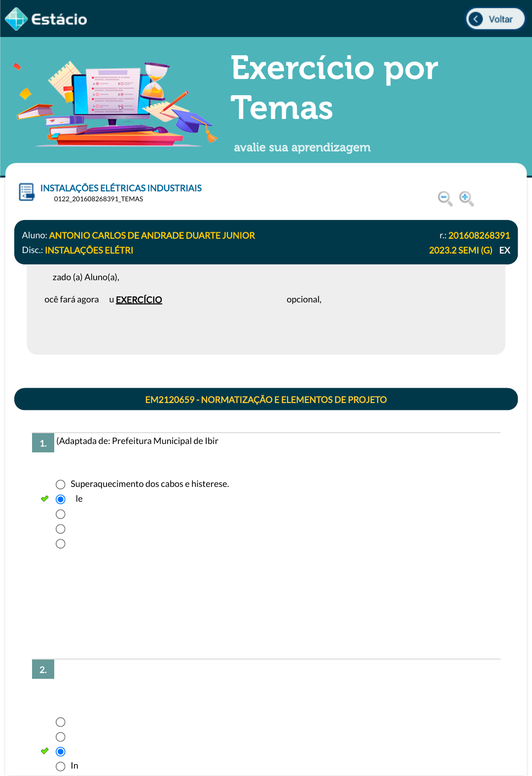 29/10/2023, 20:25 Estácio: Alunos https://simulado.estacio.br/alunos/ 1/6 Exercício por Temas avalie sua aprendizagem (Adaptada de: Prefeitura Municipal de Ibirité/MG - Engenheiro Eletricista - 2011) O dimensionamento inadequado do diâmetro dos condutores em um sistema elétrico pode acarretar: (COSEAC - Prefeitura Municipal de São Gonçalo/RJ - Engenheiro Eletricista - 2011) A NR 10 determina que toda instalação ou peça condutora que não faça parte dos circuitos elétricos, mas que, eventualmente, possa �car sob tensão, deve ser aterrada. Tal medida se refere à proteção contra risco de: INSTALAÇÕES ELÉTRICAS INDUSTRIAIS Lupa DGT0122_201608268391_TEMAS Aluno: ANTONIO CARLOS DE ANDRADE DUARTE JUNIOR Matr.: 201608268391 Disc.: INSTALAÇÕES ELÉTRI 2023.2 SEMI (G) / EX Prezado (a) Aluno(a), Você fará agora seu EXERCÍCIO! Lembre-se que este exercício é opcional, mas não valerá ponto para sua avaliação. O mesmo será composto de questões de múltipla escolha. Após responde cada questão, você terá acesso ao gabarito comentado e/ou à explicação da mesma. Aproveite para se familiarizar com este modelo de questões que será usado na sua AV e AVS. EM2120659 - NORMATIZAÇÃO E ELEMENTOS DE PROJETO 1. Superaquecimento dos cabos e histerese. Elevada queda de tensão e gastos excessivos com a instalação. Sobretensão na carga e fugas de corrente. Elevação da capacidade de curto-circuito da instalação. Aumento do fator de potência e aumento da corrente de curto-circuito. Data Resp.: 29/10/2023 13:45:42 Explicação: A resposta certa é: Elevada queda de tensão e gastos excessivos com a instalação. 2. Explosão. Descargas atmosféricas. Contato. Incêndio. javascript:voltar(); javascript:voltar(); javascript:voltar(); javascript:voltar(); javascript:diminui(); javascript:diminui(); javascript:aumenta(); javascript:aumenta(); anton Linha anton Linha anton Linha 29/10/2023, 20:25 Estácio: Alunos https://simulado.estacio.br/alunos/ 2/6 (Adaptada de: FCC - Tribunal de Justiça do Estado do Amapá - Engenharia Elétrica - 2014) A �gura a seguir corresponde ao número 7 da tabela 33 da NBR 5410 e é identi�cada como ''método de referência B1'': É CORRETO a�rmar que essa tabela da NBR 5410 se refere: (Batalhão de Policiamento em Grandes Eventos - PMRJ - Engenharia Elétrica - 2014) A Norma Regulamentadora 10 estabelece que, em todos os serviços executados em instalações elétricas, devem ser previstas e adotadas medidas de proteção coletiva, e, prioritariamente, a instalação deve ser desenergizada. A primeira ação para a desenergização é: (Adaptado de: UFMT - Instituto Federal do Mato Grosso - Engenharia Elétrica - 2014) Em relação ao dimensionamento de condutores elétricos em instalações de baixa tensão, assinale a alternativa CORRETA: Acumulação de eletricidade estática. Data Resp.: 29/10/2023 13:45:46 Explicação: A resposta certa é: Contato. 3. À quantidade de condutores por tipo de eletroduto. Aos tipos de condutor elétrico em função da previsão de potência do circuito. Aos métodos de instalação de condutores elétricos. Aos limites de previsão de carga por tipo de instalação de condutores elétricos. Aos tipos de eletroduto em função da previsão de potência do circuito. Data Resp.: 29/10/2023 13:45:51 Explicação: A resposta certa é: Aos métodos de instalação de condutores elétricos. 4. A instalação de barreiras. A instalação de aterramento temporário com equipotencialização dos condutores dos circuitos. O seccionamento elétrico da zona controlada. A instalação da sinalização. A proteção dos elementos energizados existentes na zona controlada. Data Resp.: 29/10/2023 13:45:54 Explicação: A resposta certa é: O seccionamento elétrico da zona controlada. 5. 29/10/2023, 20:25 Estácio: Alunos https://simulado.estacio.br/alunos/ 3/6 (FCC - Tribunal de Justiça do Amapá - Engenharia Elétrica - 2014) Sobre o dimensionamento de eletrodutos e a NBR 5410, considere as seguintes proposições: I. Com dois condutores, a taxa máxima de ocupação do eletroduto deve ser de 31%. II. Com três ou mais condutores, a taxa máxima de ocupação do eletroduto deve ser de 53%. III. Um trecho contínuo de eletroduto não deve ultrapassar 15 m de comprimento em linhas internas e externas de uma edi�cação. IV. Se houver curvas em rede interna de eletrodutos, o limite de 15 m de comprimento deverá ser reduzido de 3 m para cada curva de 90°. V. Cabos multipolares não devem ser instalados em eletrodutos de PVC rígidos. Estão CORRETAS apenas as proposições: (CESGRANRIO - Liquigás - Engenheiro Eletricista - 2013) Como medida de controle, a NR 10 estabelece que todas as empresas estão obrigadas a manter documentação referente a seus estabelecimentos. Essa documentação deve conter: O número de condutores carregados tem in�uência somente no método da queda de tensão, pois in�uencia na reatância indutiva dos condutores. O tipo de isolação do condutor não tem in�uência no método da capacidade de condução de corrente (Ampacidade). Os critérios de dimensionamento de condutores dependem unicamente da corrente nominal do circuito. As tabelas de capacidade de condução de corrente para os diferentes tipos de linhas elétricas estão disponíveis para diversas temperaturas ambiente. A maneira de instalar dos condutores (tipos de linha elétrica) in�uencia na capacidade de condução de corrente dos condutores. Data Resp.: 29/10/2023 13:46:04 Explicação: A resposta certa é: A maneira de instalar dos condutores (tipos de linha elétrica) in�uencia na capacidade de condução de corrente dos condutores. 6. II e V. II, III e IV. I e IV. I, III e V. I e II. Data Resp.: 29/10/2023 13:46:13 Explicação: A resposta certa é: I e IV. 7. Especi�cação dos equipamentos de proteção coletiva, individual e ferramental. Conjunto de procedimentos e instruções técnicas e administrativa