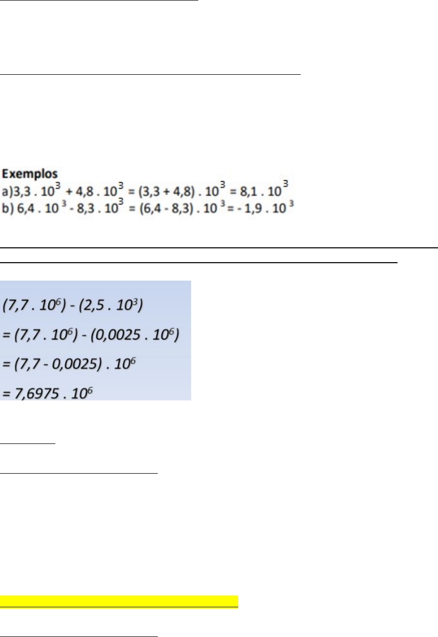 Operações com notação de engenharia Assim como ocorre na notação científica, podemos também realizar operações matemática com números representados em notação científica. Operação de soma e subtração com notação de engenharia Para efetuar a soma ou a subtração com números em notação de engenharia devemos somar ou subtrair os números e repetir a potência de 10. Por isso, para fazer essas operações, é necessário que as potências de 10 apresentem o mesmo expoente, tenham o mesmo sinal e que estes sejam múltiplos ou submúltiplos de 3. Exemplos Caso os expoentes sejam múltiplos ou submúltiplos de 3 mas diferentes, precisaremos fazer algumas “manobras matemáticas” para acharmos uma solução. Exemplo: Exercícios. Resolva as operações a seguir; a) 3.10³ + 5.10^9 b) 2.10-³ - 4.10³ c) 10.10³-10.10^(-9) d) 20.10^(-6)+25.10^(-3) e) 4000.10(-3)+2000.10^(-3) f) 10.10^(-12)+100.10^(15) Atividade para ser entregue em folha separada. Resolva as operações a seguir; a) b) 0,001.10³ + 1.10³ c) 0,012.10^(-3) + 0,121.10³ d) 35.10³ + 35.10^(-3) e) 1905.10^(-3) + 2000.10³ f) 400.10^(-12)+700.10^(15) g) 5000.10^0 – 1000.10^(0) h) 17.10³ + 15.10^(-6) i) 40.10³ - 40.10^9 Operação de multipicação com notação científica Operação de divisão com notação científica