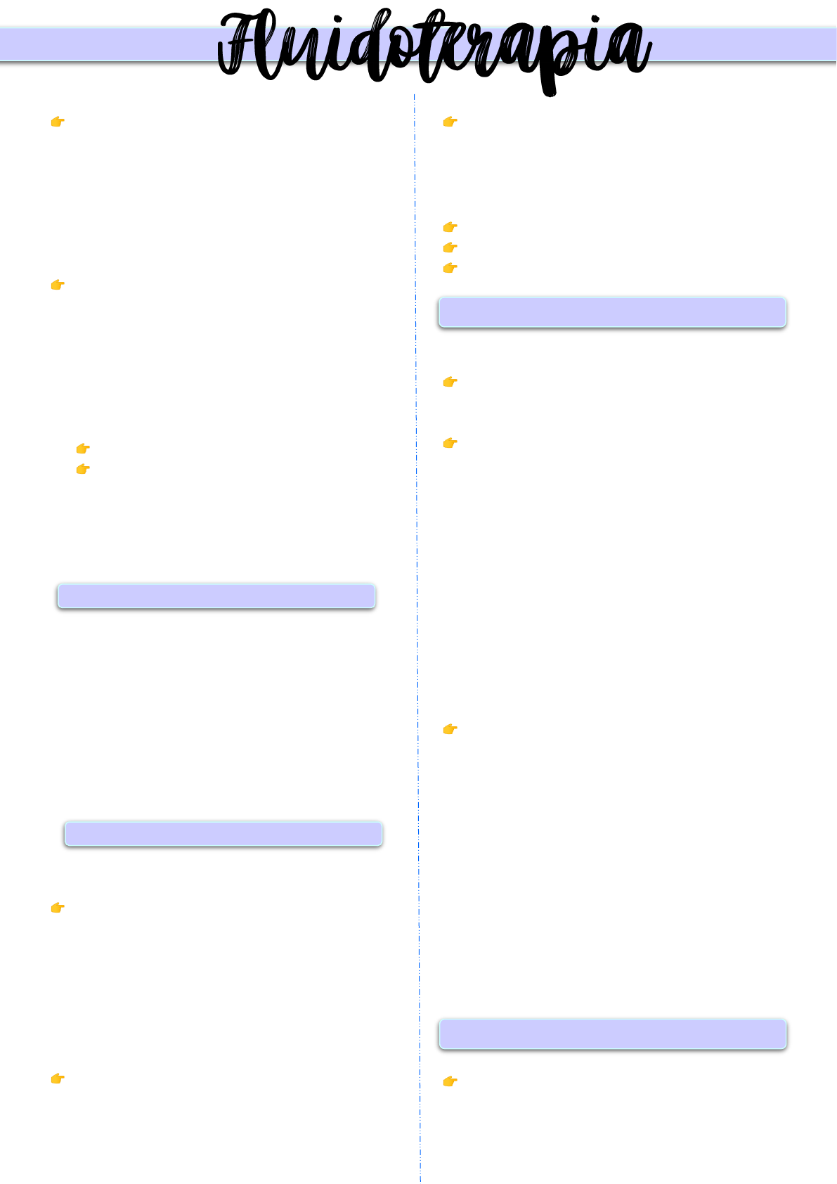 O objetivo da fluidoterapia é corrigir distúrbios hidroeletrolíticos, acidobásicos, restaurar a volemia e manter a homeostase para impedir a mortalidade e os danos a órgãos e sistemas Distribuição da água corporal 6% da composição do peso de animais saudáveis é água. Alguns fatores devem ser levados em consideração: estado do paciente e curso da doença (agudo ou crônico); alterações no equilíbrio acidobásico, hidreletrolítico e nas pressões hidrostática e/ou oncótica; e, por último, comorbidades associadas. Intracelular Extracelular: Interstício (75%) Intravascular (25%) ❖ 6% peso corpóreo cão ❖ 6,5 peso corpóreo gato. Peso: 10kg X 0,6 = 6 Entrada de água corporal: Ingestão diária: 40 a 60ml/kg A ingestão de água tem relação com que o animal perde por dia. Um animal que come ração seca, bebe mais água devido a ração seca ter +/- 10% de água. Quando troca para ração úmida ele pode começar a tomar pouca água, porque já está ingerindo bastante dentro da ração. Perdas de água corporal: Perdas insensíveis: Respiração – 13 a 20 ml/kg/dia Aumento da temperatura corporal; febre; hiperventilação; dor; medo; alterações pulmonares em atividade física → paciente com patogenia no pulmão, perde mais água. Transpiração – pouco relevante em pequenos animais. Perdas sensíveis: Trato urinário 25 a 40 ml/kg/dia 1 a 1,5 ml/kg/h – cão 0,5 ml/kg/h – Gato Gastrointestinal: 5 a 10 ml/kg/dia – fezes; 1 a 2 ml/kg – êmese; 1 a 4 ml/kg – Diarreia Patologias: Sialorreia; Êmese; diarreia; 3° espaço → ascite/ efusão Perdas de água X desidratação Tipos de desidratação: Hipertônica -→ perda de H2O > eletrólito→ respiratória; Diabetes mellitus. Isotônicas→ perda de H20 = eletrólito → vomito; diarreia; sialorreia; poliuria. Perdas de água e de eletrólitos em mesma proporção, como são observadas nas diarreias e nos vômitos, causam a desidratação isotônica em que a simples reposição com solução fisiológica a 0,9% ou lactato de ringer na mesma proporção da perda é capaz de repor a volemia e os eletrólitos. Cálculo de volume de reposição, fórmula: Peso corporal (kg) × % de desidratação × 10 = volume (mℓ) para correção. Hipotônica→ perda de H20 < eletrólitos→ furosemida; hipoadreno. Calculando a osmolaridade plasmática: 2(NA) + (GLICOSE/18) + (UREIA/6) Referência – 280 a 320 mosm Plasma com alta osmoralidade- atrai a água plasma com baiza osmoralidade – migração da água. Desidratação X hipovolemia O interstício é como uma reserva. Quando o animal está hipovolêmico, deve se considerar que esse animal está pelo menos a 10% desidratado. Avaliando no exame físico: Mucosa; Turgor de pele Tpc Enoftalmia Fc Peso → considerando que o animal tem que pesar 10kg e no dia seguinte, ele estava com 9,7kg → ele perdeu 300ml de água e é esse valor que você precisa repor. Complementar: HT e PT Azotemia – pré renal. Paciente mais obeso ou mais novo, a pele normalmente tem menor elasticidade. E quando é muito idoso ou muito magro, o turgor de pele tende a ser superior a 2” Sinal de choque: Sinal de choque: Aumento da frequência cardíaca. (devido a adrenalina) Vasoconstrição → mucosas pálidas; aumento do TPC; membros frios. Animal com pupilas dilatadas e fc baixa → organismo tentou compensar, mas não conseguiu, nesse momento tem grandes chances de óbito. Baixa consciência Pressão arterial baixa → choque oculto, tem todos os sinais, mas a PAS está normal. Gato→ hipo-tudo → hipotenso, hipotérmico, hipoconsciência, bradicardico. Quando o gato está com a temperatura muito alta, os mecanismos de controle térmicos começam a relaxar e ele começa a procurar lugares frios. Alto risco de morte. Quando o animal está se resfriando, ele preserva o tecido (instintivo) Sempre deve aquecer o gato, a conversão da noradrenalina só ocorre em temperatura superior a 37°C Lactato: Marcador de perfusão tecidual Quando se tem falta de oxigenação: Aumento de lactato. (quanto maior o lactato, menos oxigênio chegando nas células, estão fazendo via anaeróbica) O fígado usa o lactato para produzir o bicarbonato. Ideal que se mantenha abaixo de 2,5mmo/L No ringer-lactato tem uma dosagem de lactato bem baixo → mesmo com o lactato elevado pode se usar. Objetivo: Repor perdas Restabelecer a perfusão tecidual Corrigir alterações eletrólicas Manter o aporte de água e eletrólicos em pacientes que não estão consumidos. Como corrigir/evitar a desidratação? Com fluidoterapia. Correção da desidratação: Necessário considerar: Perda aguda ou crônica: em caso de perda crônica, eles se hidratam melhor com o tempo maior de fluidoterapia Causa de base Doenças concomitantes Desidratação X hipotensão Escolhas da rota de administração: Intravenosa é em pacientes graves. Fluidoterapia: Reanimação: Se usa em choque hipovolêmico; Antigamente se calculava com: peso X 8% e dividia o volume e ia fazendo intravenosa. Hoje, sabemos que animais morrem mais nessa modalidade. Glicocálice → ajuda a controlar a passagem de água, é uma camada muito 10 ml – 15ml/kg – cão 5 a 10ml/kg – Gato Em 15min. fina e quando fazemos fluido em grande volume e rápido, o glicocálice fica frágil. Paciente com excesso de fluido (volume ou velocidade) o paciente inflama. Agora é chamado de prova de carga → quando o animal está em choque hipovolêmico, se faz a prova de carga para saber se o animal vai responder com o soro. --> fazer no máximo 3 vezes. Verificar sinais novamente: PAS; Sinal de consciência. Reidratação: Peso X %=L Animal tem 10kg com 7% de desidratação. 10X 7% = 0,7 L = 700ml 700ml é o volume que esse animal precisa para sair de 7% de desidratação, para hidratado. O peso dele no dia seguinte deve ser 10,7kg. Outro cálculo: Peso x 7 (desidratação) x 10 = 700 Caso clínico: Bob, 1 ano, 10kg, PAS 60mmHg, T°36,9°c Choque hipovolêmico; 12% 