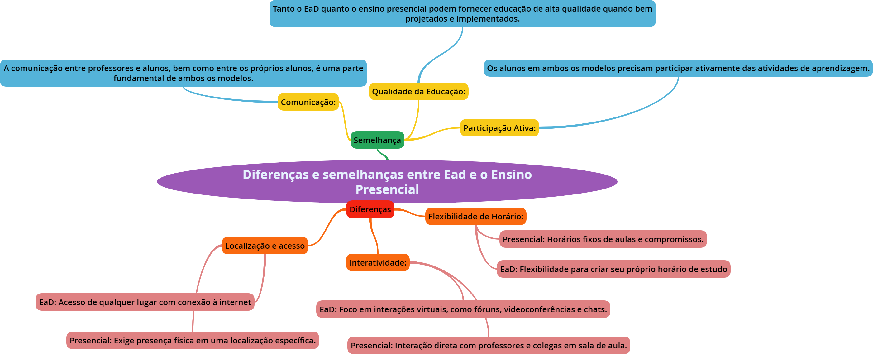 Tanto o EaD quanto o ensino presencial podem fornecer educação de alta qualidade quando bem projetados e implementados. A comunicação entre professores e alunos, bem como entre os próprios alunos, é uma parte fundamental de ambos os modelos. Os alunos em ambos os modelos precisam participar ativamente das atividades de aprendizagem. Flexibilidade de Horário: Presencial: Horários fixos de aulas e compromissos. EaD: Flexibilidade para criar seu próprio horário de estudo Localização e acesso EaD: Acesso de qualquer lugar com conexão à internet Interatividade: EaD: Foco em interações virtuais, como fóruns, videoconferências e chats. Presencial: Exige presença física em uma localização específica. Presencial: Interação direta com professores e colegas em sala de aula.
