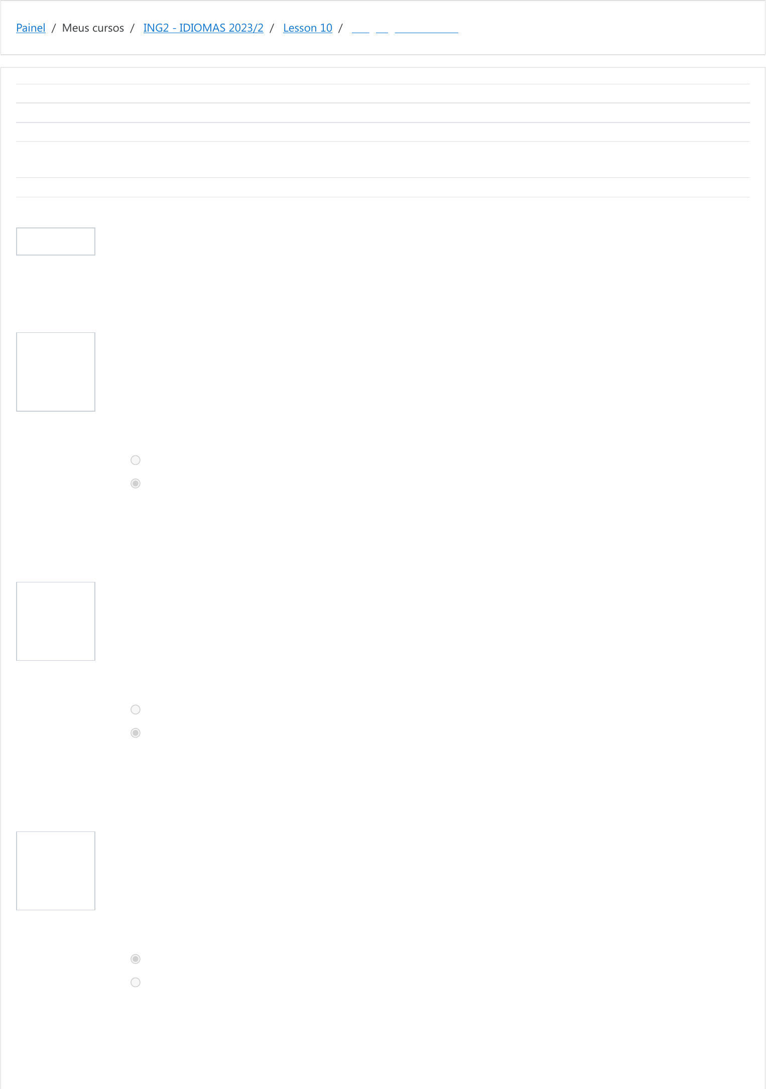 Painel / Meus cursos / ING2 - IDIOMAS 2023/2 / Lesson 10 / Languages In Canada Informação Questão 1 Correto Atingiu 1,67 de 1,67 Questão 2 Correto Atingiu 1,67 de 1,67 Questão 3 Correto Atingiu 1,67 de 1,67 Iniciado em terça, 31 out 2023, 09:14 Estado Finalizada Concluída em terça, 31 out 2023, 09:15 Tempo empregado 37 segundos Notas 10,00/10,00 Avaliar 10,00 de um máximo de 10,00(100%) Read the short texts about languages spoken in Canada and then check True (T) or False (F) according to them. Although bilingualism in Canada refers to English and French, it is extending to other languages spoken by the new immigrants' communities such as Chinese and Hispanics. However, French is spoken all around the country, even when you are looking for a job in a big company. Chinese and Spanish are spoken in Canada more than English and French. Escolha uma opção: Verdadeiro Falso A resposta correta é 'Falso'. Although bilingualism in Canada refers to English and French, it is extending to other languages spoken by the new immigrants' communities such as Chinese and Hispanics. However, French is spoken all around the country, even when you are looking for a job in a big company. Speaking Chinese and Spanish show to be important when you want to find a job in a big company. Escolha uma opção: Verdadeiro Falso A resposta correta é 'Falso'. Despite having two official languages, there are examples of good understanding among communities in British Columbia where there is a huge Punjabi community, which lobbied the province government to introduce Punjabi in schools and universities. Punjabi is greatly spoken in British Columbia. Escolha uma opção: Verdadeiro Falso A resposta correta é 'Verdadeiro'. https://moodle.ifsul.edu.br/novohamburgo/my/ https://moodle.ifsul.edu.br/novohamburgo/course/view.php?id=357 https://moodle.ifsul.edu.br/novohamburgo/course/view.php?id=357#section-16 https://moodle.ifsul.edu.br/novohamburgo/mod/quiz/view.php?id=56818 Questão 4 Correto Atingiu 1,67 de 1,67 Questão 5 Correto Atingiu 1,66 de 1,66 Questão 6 Correto Atingiu 1,66 de 1,66 Despite having two official languages, there are examples of good understanding among communities in British Columbia where there is a huge Punjabi community, which lobbied the province government to introduce Punjabi in schools and universities. People in British Columbia want to establish Punjabi as an official language. Escolha uma opção: Verdadeiro Falso A resposta correta é 'Falso'. Although 20.0% of Canada's population reported speaking a language other than English or French at home, they also speak an immigrant language, most often at home, alone or together with English or French, whereas for more than 213,000 people the other language was an Aboriginal language. Immigrant languages are more popular in Canada than English, French and Aboriginal languages. Escolha uma opção: Verdadeiro Falso A resposta correta é 'Falso'. Although 20.0% of Canada's population reported speaking a language other than English or French at home, they also speak an immigrant language, most often at home, alone or together with English or French, whereas for more than 213,000 people the other language was an Aboriginal language. Immigrant languages are spoken as well as English and French at home. Escolha uma opção: Verdadeiro Falso A resposta correta é 'Verdadeiro'. ◄ Carlton's Doubts Seguir para... Contrast Words ► https://moodle.ifsul.edu.br/novohamburgo/mod/quiz/view.php?id=56817&forceview=1 https://moodle.ifsul.edu.br/novohamburgo/mod/quiz/view.php?id=56819&forceview=1