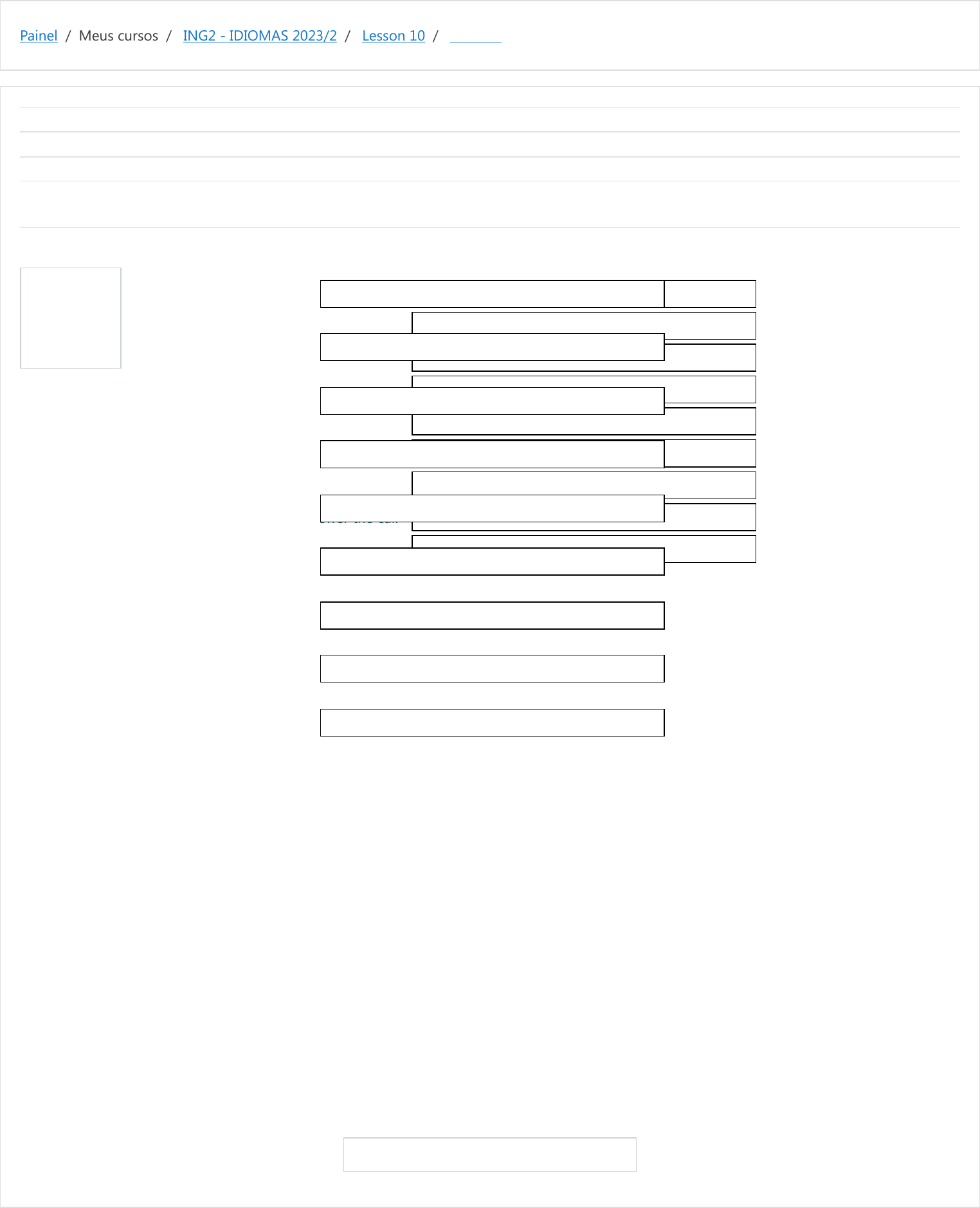 Painel / Meus cursos / ING2 - IDIOMAS 2023/2 / Lesson 10 / Matching Questão 1 Correto Atingiu 10,00 de 10,00 Iniciado em terça, 31 out 2023, 09:21 Estado Finalizada Concluída em terça, 31 out 2023, 09:24 Tempo empregado 2 minutos 56 segundos Avaliar 10,00 de um máximo de 10,00(100%) Amélie didn't show up at the diner Sarah was tired Sarah arrived home and took a shower Jason lied about the document; He didn't want to tell Sarah the truth, Jason said he lost the document Sarah couldn't talk to Steve, Steve wasn't able to answer the call They didn't talk; Sua resposta está correta. A resposta correta é: Amélie didn't show up at the diner [because she got the flu.] Sarah was tired [due to long hours working at the diner nonstop.] Sarah arrived home and took a shower [so that she could relax.] Jason lied about the document; [therefore, he is hiding something from his girlfriend.] He didn't want to tell Sarah the truth, [so he made up a story.] Jason said he lost the document [due to a robbery in this apartament.] Sarah couldn't talk to Steve, [so she gave him a call.] Steve wasn't able to answer the call [because of the poor mobile signal.] They didn't talk; [therefore, they didn't meet that night.] ◄ Contrast Words Seguir para... Choosing The Best Group Of Words ► therefore, he is hiding something from his girlfriend. due to a robbery in this apartament. due to long hours working at the diner nonstop. therefore, they didn't meet that night. so he made up a story. because of the poor mobile signal. so she gave him a call. because she got the flu. so that she could relax. https://moodle.ifsul.edu.br/novohamburgo/my/ https://moodle.ifsul.edu.br/novohamburgo/course/view.php?id=357 https://moodle.ifsul.edu.br/novohamburgo/course/view.php?id=357#section-16 https://moodle.ifsul.edu.br/novohamburgo/mod/quiz/view.php?id=56820 https://moodle.ifsul.edu.br/novohamburgo/mod/quiz/view.php?id=56819&forceview=1 https://moodle.ifsul.edu.br/novohamburgo/mod/quiz/view.php?id=56821&forceview=1