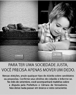Metodologia e Conteúdos Básicos de Língua Portuguesa Como bem sabemos, uma determinada função da linguagem é identificada em função do foco no qual um determinado texto se concentra. O texto pode apresentar um foco no autor, na mensagem, no código, no leitor, no contexto e/ou no canal. Com base na imagem e no exposto, classifique V para as sentenças verdadeiras e F para as falsas: ( ) A função da linguagem predominante nesse texto é a metalinguística porque há um evidente esforço em explicar o que é uma sociedade justa. ( ) A função da linguagem predominante é a emotiva porque que o foco está no autor. ( ) A função predominante é a referencial, pois as informações possuem um teor argumentativo forte e partem de fontes confiáveis para serem usadas no anúncio. ( ) A função predominante é a conativa porque o foco do anúncio é o leitor que precisa assumir uma consciência social. Assinale a alternativa que apresenta a sequência CORRETA: A F - F - F - V. B F - V - V - V. C V - F - V - V. D V - V - F - F.