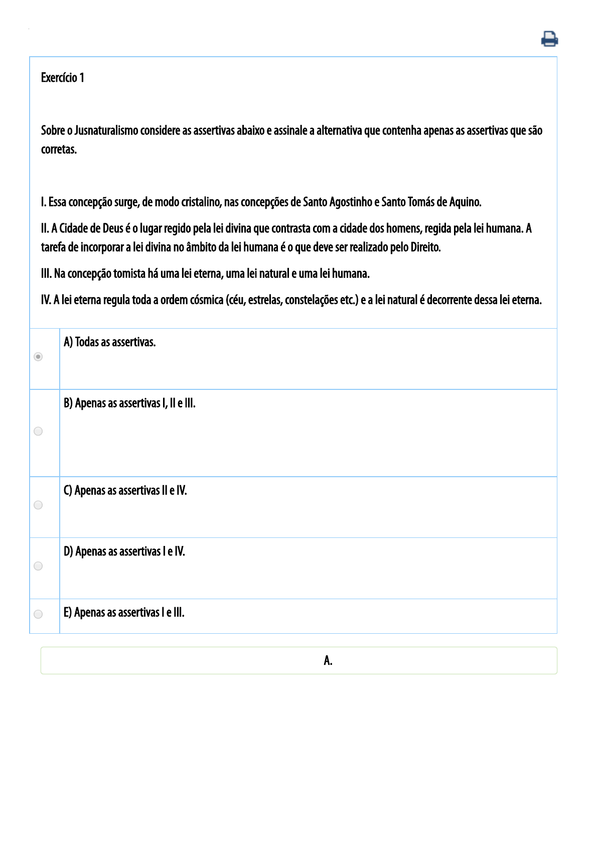 26/05/2020 Universidade Paulista - UNIP : Disciplina On-line. https://online.unip.br/disciplina/detalhes/5825 1/1 Exercício 1 Sobre o Jusnaturalismo considere as assertivas abaixo e assinale a alternativa que contenha apenas as assertivas que são corretas. I. Essa concepção surge, de modo cristalino, nas concepções de Santo Agostinho e Santo Tomás de Aquino. II. A Cidade de Deus é o lugar regido pela lei divina que contrasta com a cidade dos homens, regida pela lei humana. A tarefa de incorporar a lei divina no âmbito da lei humana é o que deve ser realizado pelo Direito. III. Na concepção tomista há uma lei eterna, uma lei natural e uma lei humana. IV. A lei eterna regula toda a ordem cósmica (céu, estrelas, constelações etc.) e a lei natural é decorrente dessa lei eterna. A A) Todas as assertivas. B B) Apenas as assertivas I, II e III. C C) Apenas as assertivas II e IV. D D) Apenas as assertivas I e IV. E E) Apenas as assertivas I e III. Você já respondeu e acertou esse exercício. A resposta correta é: A.