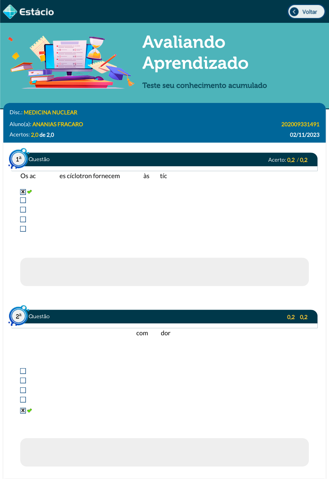 02/11/2023, 21:37 Estácio: Alunos https://simulado.estacio.br/alunos/ 1/4 Avaliando Aprendizado Teste seu conhecimento acumulado Disc.: MEDICINA NUCLEAR Aluno(a): ANANIAS FRACARO 202009331491 Acertos: 2,0 de 2,0 02/11/2023 Acerto: 0,2 / 0,2 Os aceleradores cíclotron fornecem energia às partículas através de: Campo elétrico Energia nuclear do decaimento radioativo Ímãs permanentes Campo magnético Força centrífuga Respondido em 02/11/2023 20:18:10 Explicação: A resposta correta é: Campos Elétrico Acerto: 0,2 / 0,2 A principal característica das tomogra�as computadorizadas é a alta resolução espacial. Já o PET e o SPECT possuem grande facilidade de identi�car atividade metabólica. Nas imagens hibridas, deve haver alinhamento entre as imagens de CT e SPECT ou PET. O teste que faz essa veri�cação é chamado de avaliação de: Linearidade. Atenuação. Tempo de voo. Tempo morto. Corregistro. Respondido em 02/11/2023 20:18:16 Explicação: A resposta correta é: Corregistro. Questão1 a Questão2 a https://simulado.estacio.br/alunos/inicio.asp https://simulado.estacio.br/alunos/inicio.asp javascript:voltar(); javascript:voltar(); 02/11/2023, 21:37 Estácio: Alunos https://simulado.estacio.br/alunos/ 2/4 Acerto: 0,2 / 0,2 Em cintilogra�a miocárdica, comparando as imagens realizadas com cloreto de rubídio 82 e com sestamibi tecnécio 99m, podemos a�rmar que: Com rubídio, as imagens possuem pior resolução, pois é utilizado o SPECT. Com rubídio, as imagens possuem pior resolução, pois é utilizado o PET. Com rubídio, as imagens possuem melhor resolução, pois é utilizado o PET. Com rubídio, as imagens possuem melhor resolução, pois é utilizado o SPECT. Nenhuma das outras alternativas. Respondido em 02/11/2023 20:18:34 Explicação: A resposta correta é: Com rubídio, as imagens possuem melhor resolução, pois é utilizado o PET. Acerto: 0,2 / 0,2 Uma das bases utilizadas na radioterapia é o fracionamento de dose, no qual: Todas as células e todos os tecidos tumorais têm sensibilidade à radiação da mesma forma. As doses fracionadas têm como objetivo evitar superaquecimento do equipamento. O reparo das células tumorais e sadias é igual, fazendo o fracionamento desnecessário. A distribuição de frações no início ou no �m do tratamento tem grande importância. O reparo, a reoxigenação, a redistribuição, a repopulação e a radiossensibilidade são fatores importantes para guiar o tratamento radioterápico. Respondido em 02/11/2023 20:20:08 Explicação: A resposta correta é: O reparo, a reoxigenação, a redistribuição, a repopulação e a radiossensibilidade são fatores importantes para guiar o tratamento radioterápico. Acerto: 0,2 / 0,2 Quanto às técnicas SRS e SBRT, pode-se dizer que: Ambas são para tratamentos em dose única. São realizadas somente em tratamentos paliativos. A primeira é hipofracionada e a segunda não. Ambas utilizam localização esterotáxica. Não precisam de IGRT. Respondido em 02/11/2023 20:20:13 Explicação: A resposta correta é: Ambas utilizam localização esterotáxica. Questão3 a Questão4 a Questão5 a 02/11/2023, 21:37 Estácio: Alunos https://simulado.estacio.br/alunos/ 3/4 Acerto: 0,2 / 0,2 A respeito dos radiofármacos é correto a�rmar que: São utilizados apenas na forma intravenosa. Não apresentam radioatividade. Não são radioativos após a marcação. Todos utilizam tecnécio. São especí�cos para um determinado órgão. Respondido em 02/11/2023 20:20:24 Explicação: A resposta correta é: São especí�cos para um determinado órgão. Acerto: 0,2 / 0,2 O tubo fotomultiplicador converte: Fótons em elétrons. Elétrons acelerados em dínodos. Fótons gama em fótons de raios X. Elétrons em fótons. Fótons gama em fótons de luz. Respondido em 02/11/2023 20:20:28 Explicação: A resposta correta é: Fótons em elétrons. Acerto: 0,2 / 0,2 Para a aquisição de imagens do córtex renal preferencialmente utiliza-se radiofármaco: Com rápida �ltração tubular. Com absorção glomerular apenas. Com absorção glomerular e tubular. Com rápida �ltração glomerular. Com absorção tubular. Respondido em 02/11/2023 20:20:34 Explicação: A resposta correta é: Com absorção glomerular e tubular. Questão6 a Questão7 a Questão8 a 02/11/2023, 21:37 Estácio: Alunos https://simulado.estacio.br/alunos/ 4/4 Acerto: 0,2 / 0,2 Os isótopos para braquiterapia podem ser utilizados em regiões de Baixa Taxa de Dose (LDR) ou Alta Taxa de Dose (HDR). Entre os elementos radioativos a seguir, qual é o mais indicado para a braquiterapia de HDR? Rádio Césio Níquel Urânio Irídio Respondido em 02/11/2023 20:21:34 Explicação: A resposta correta é: Irídio Acerto: 0,2 / 0,2 Qual dos itens abaixo não integra um dos passos do planejamento em Radioterapia? De�nição do arranjo de campos de tratamento Cálculo do tempo ou unidades monitoras dos campos de tratamento Controle de qualidade dos dispositivos de imagem Identi�cação do sítio de tratamento Transferência de dados para unidade de tratamento Respondido em 02/11/2023 20:21:42 Explicação: A resposta correta é: Controle de qualidade dos dispositivos de imagem Questão9 a Questão10 a