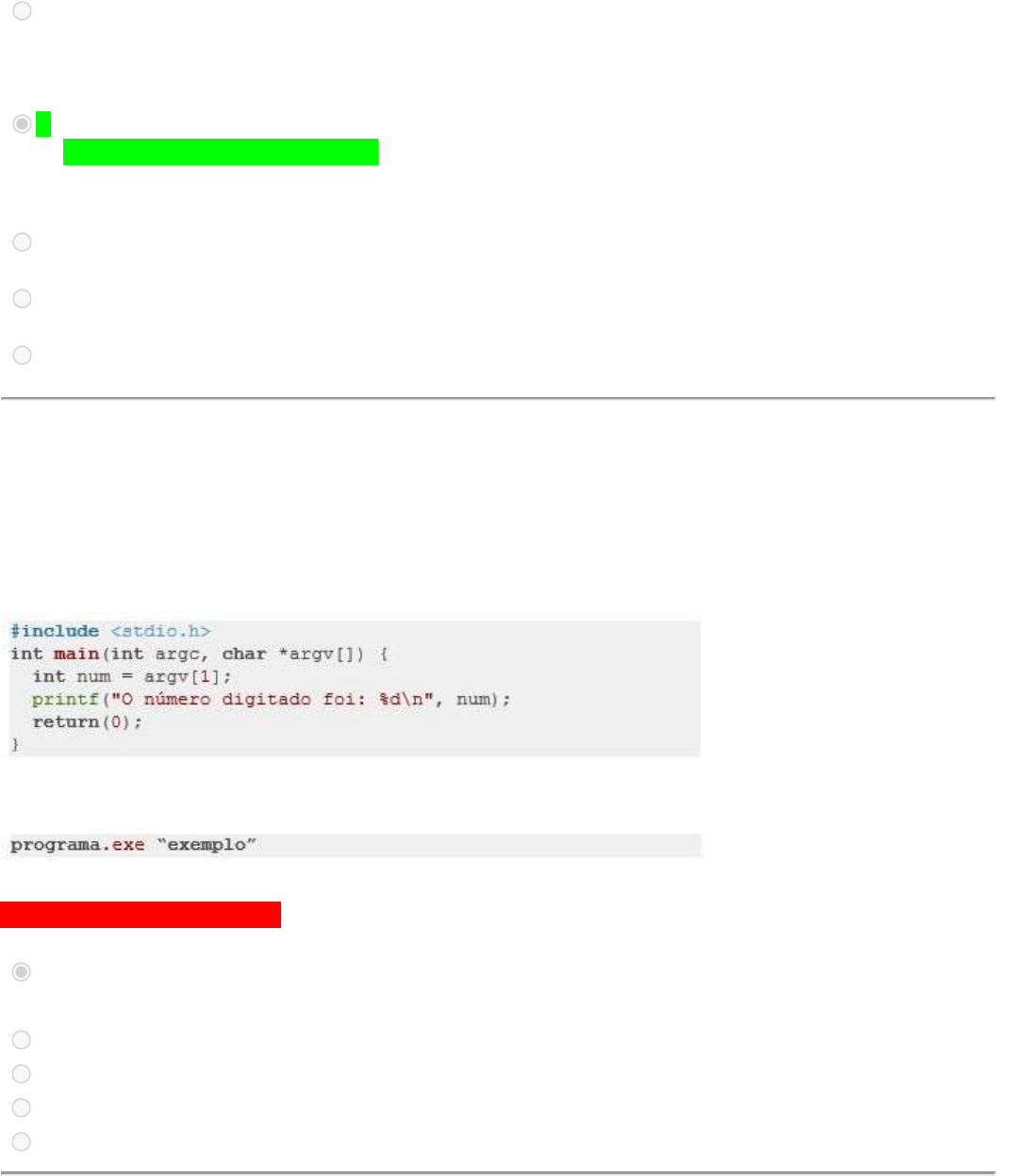 Linguagem da Programação Nota 70 Questão 1/12 - Linguagem da Programação A manipulação de múltiplos arquivos em linguagem C é aplicada no desenvolvimento de programas complexos e extensos, onde é necessário dividir o código em partes menores e independentes para facilitar a manutenção e o desenvolvimento. Considere as alternativas a seguir, assinalando a opção que apresenta uma das formas de criar e compilar múltiplos arquivos em C, garantindo que o programa final seja executável: Todos os arquivos de código-fonte e cabeçalhos devem ser incluídos em um único arquivo antes de A serem compilados. Cada arquivo de código-fonte deve ser compilado separadamente e, em seguida, os resultados devem ser combinados em um único arquivo executável. B Você assinalou essa alternativa (B) A compilação de múltiplos arquivos em C é impossível; todos os códigos devem ser incluídos em um C único arquivo. Todos os arquivos de cabeçalho devem ser incluídos em um único arquivo antes de serem compilados, D enquanto os arquivos de código-fonte podem ser compilados separadamente. A compilação de múltiplos arquivos em C é possível, mas apenas se eles forem escritos em diferentes E linguagens de programação. Questão 2/12 - Linguagem da Programação A função MAIN() na linguagem C, pode receber parâmetros de entrada na linha de execução do programa. Esses parâmetros serão fornecidos no momento da chamada do código. Considerando o código a seguir: Qual será o resultado do programa ao ser executado com os seguintes argumentos de linha de comando? Você não pontuou essa questão A O código apresenta erro de compilação. Você assinalou essa alternativa (A) B O programa não irá mostrar nada na tela. C O programa irá apresentar um número aleatório. D O programa irá mostrar o valor inteiro do primeiro argumento. E O programa irá gerar uma exceção devido ao uso incorreto do argumento argv. Questão 3/12 - Linguagem da Programação Ao trabalhar com alocação dinâmica de memória em C, é possível utilizar duas funções bastante populares: "malloc" e "calloc". Ambas as funções permitem a alocação de um bloco de memória de tamanho específico durante a execução do programa. Entretanto, existe uma diferença importante entre elas. Assinale a alternativa que descreve corretamente a diferença entre as funções "malloc" e "calloc" em linguagem C: A função "malloc" é usada para alocar memória dinamicamente e inicializar todos os seus bits com A zero, enquanto a função "calloc" é usada para alocar memória dinamicamente sem inicializar seu conteúdo. B Não há diferença, ambas alocam memória dinamicamente "malloc" só pode ser usada para alocar memória para tipos simples, enquanto "calloc" pode alocar C memória para tipos compostos A função "malloc" é usada para alocar memória dinamicamente para um único objeto, enquanto a D função "calloc" é usada para alocar memória para um vetor de objetos. A função "calloc" é usada para alocar memória dinamicamente e inicializar a memória alocada com zeros, enquanto "malloc" apenas aloca memória dinamicamente sem inicializar seu conteúdo. E Você assinalou essa alternativa (E) Questão 4/12 - Linguagem da Programação A linguagem C não fornece suporte para o tipo de dados string. Portanto, para realizar o armazenamento deuma cadeia de caracteres necessitamos recorrer ao recurso de criação de vetores do tipo char. Nesse cenário, qual é o tamanho mínimo adequado para armazenarmos o texto “Linguagem C”? Questão 5/12 - Linguagem da Programação Antes de trabalhar com arquivos em um programa, é necessário abri-los em um modo específico para determinar como eles serão lidos ou gravados. O modo de abertura de um arquivo pode causar um grande impacto no conteúdo existente do arquivo. Por exemplo, ao abrir um arquivo em modo de escrita, o conteúdo anterior pode ser apagado. Mas será que isso sempre acontece? É possível abrir um arquivo em modo de escrita sem que seu conteúdo anterior seja apagado? Sim, basta usar o modo "a" em vez do modo "w". A Você assinalou essa alternativa (A) B Não, o modo "w" sempre apaga o conteúdo anterior do arquivo. C Sim, basta usar o modo "r+" em vez do modo "w". D Não, a abertura de arquivos em modo de escrita sempre apaga o conteúdo anterior. É possível abrir um arquivo em modo de escrita sem apagar o conteúdo anterior, desde que seja usado E A 9 B 10 C 11 D 12 Você assinalou essa alternativa (D) E 13 o modo "w+" ao invés do modo "w". Questão 6/12 - Linguagem da Programação Considerando o código implementado em linguagem C, apresentado a seguir, que utiliza ponteiros e matrizes para simular uma batalha em um jogo de RPG. Qual é a saída após sua execução bem-sucedida? Questão 7/12 - Linguagem da Programação Um código desenvolvido na linguagem de programação C, utiliza o conceito de variáveis e constantes para a atribuição e manipulação de valores. Cada variável é declarada conforme o tipo de dado que armazenará. Baseado nessa informação, para que seja possível trabalhar com um valor numérico que ocupe 8 bytes de memória, defina o tipo de dado mais adequado nessa situação dentre as alternativas disponíveis: double Questão 8/12 - Linguagem da Programação A linguagem C possui os operadores de incremento (++) e decremento (--), que adicionam ou eliminam o valor 1 (um) de uma variável. Sua aplicação abrange situações de pré e pós incremento ou decremento, permitindo realizar a operação antes ou depois de usar uma variável. Analise o código abaixo e escolha a alternativa que apresenta o valor resultante, após a execução do código com sucesso. Você não pontuou essa questão A 10 8 , 8, 8, 4, B 6 , 8, 9, 7, 10 C 10 , 7, 9, 2, 8 D 10 , 8, 9, 2, 4 Você assinalou essa alternativa (D) E 10 , 8, 8, 2, 6 A Você assinalou essa alternativa (A) B float C unsigned int D long int E char Considere a s