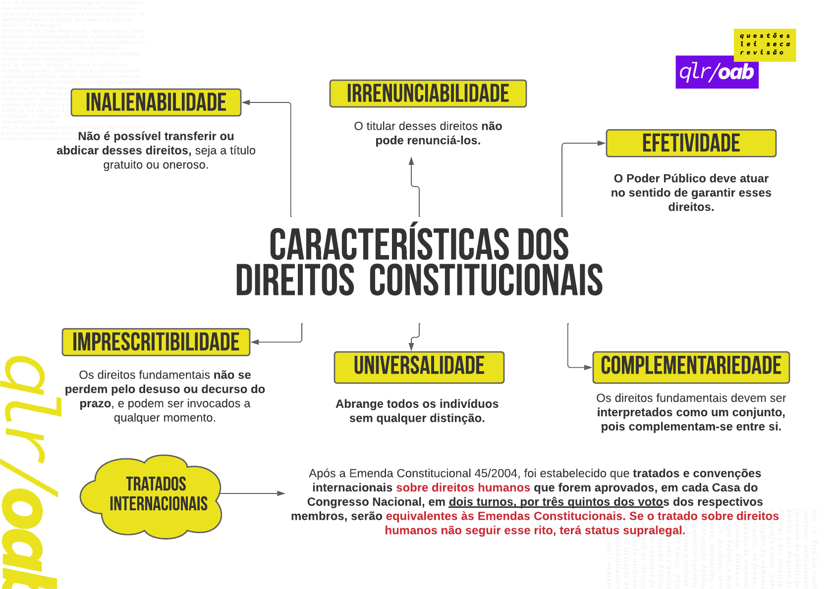 INALIENABILIDADE características dos direitos CONSTITUCIONAIS IMPRESCRITIBILIDADE IRRENUNCIABILIDADE UNIVERSALIDADE EFETIVIDADE COMPLEMENTARIEDADE Não é possível transferir ou abdicar desses direitos, seja a título gratuito ou oneroso. O titular desses direitos não pode renunciá-los. O Poder Público deve atuar no sentido de garantir esses direitos. Os direitos fundamentais não se perdem pelo desuso ou decurso do prazo, e podem ser invocados a qualquer momento. Abrange todos os indivíduos sem qualquer distinção. Os direitos fundamentais devem ser interpretados como um conjunto, pois complementam-se entre si. tratados internacionais Após a Emenda Constitucional 45/2004, foi estabelecido que tratados e convenções internacionais sobre direitos humanos que forem aprovados, em cada Casa do Congresso Nacional, em dois turnos, por três quintos dos votos dos respectivos membros, serão equivalentes às Emendas Constitucionais. Se o tratado sobre direitos humanos não seguir esse rito, terá status supralegal. Fernanda Mirna Ferreira Louzeiro - fernandaloudireito@gmail.com - CPF: 604.951.043-10 DIREITOS FUNDAMENTAIS DE 1ª DIMENSÃO São os direitos civis, individuais e políticos. Referem-se ao direito de liberdade dos cidadãos frente ao Estado. São denominados liberdades negativas e exige do Estado a abstenção, a não interferência. São exemplos o direito à vida, à liberdade, à propriedade e à igualdade perante a lei. DIREITOS FUNDAMENTAIS DE 2ª DIMENSÃO - São os direitos ecônomicos, culturais e sociais; - O Estado deve atuar de forma positiva para minimizar os problemas sociais, outorgando, aos cidadãos, prestações de cunho assistencial, propiciando saúde, educação, trabalho e outros; - São exemplos: a liberdade sindical, o direito de greve e o direito dos trabalhadores. DIREITOS FUNDAMENTAIS DE 3ª DIMENSÃO - São os direitos de solidariedade, fraternidade, aqueles que possuem titularidade indeterminada; - São exemplos: o direito à paz, o direito das gerações futuras, o direito à proteção ao meio ambiente e o direito à qualidade de vida. É no art. 5º da Constituição Federal que estão concentrados os direitos e deveres individuais e coletivos. O caput desse artigo prevê que serão aplicados somente aos brasileiros e estrangeiros residentes no Brasil. No entanto, a doutrina e o STF estendem a aplicação aos estrangeiros em trânsito e a pessoas jurídicas, no que lhes for aplicável. Os direitos fundamentais têm sua eficácia de forma direta tanto nas relações verticais (do Estado com os cidadãos), como nas relações horizontais (aquelas entre os particulares). Fernanda Mirna Ferreira Louzeiro - fernandaloudireito@gmail.com - CPF: 604.951.043-10 direitos fundamentais Inviolabilidade do domicílio: A casa é asilo inviolável do indivíduo e nela ninguém pode penetrar sem consentimento do morador. Exceção: pode entrar a qualquer horário, em caso de flagrante delito ou para prestar socorro e, durante o dia, com determinação judicial. Os direitos fundamentais têm aplicação direta e imediata. São considerados claúsulas pétreas, ou seja, mudanças que visam restringir os direitos não são possíveis! É assegurado, a todos, o direito à informação, resguardando o sigilo da fonte, quando necessário ao exercício profissinal. Assegura-se a todos, independente do pagamento de taxas, o direito de petição aos Poderes Públicos em defesa de direitos ou contra ilegalidade e abuso de poder. É livre o direito de reunião pacífica, não sendo necessária autorização. Porém, é necessário que ocorra um prévio aviso à autoridade competente, para que não frustre outra reunião anteriormente convocada. Não é pedido de autorização, apenas um aviso. A prática do RACISMO constitui crime inafiancável e imprescritível, sujeito a pena de reclusão. Os crimes de tortura, tráfito ilícito de entorpecentes e drogas afins, terrorismo e os hediondos são inafiançáveis e insuscetíveis de graça ou anistia. A todos, no âmbito judicial e administrativo é assegurado a razoável duração do processo e os meios que garantam a celeridade de sua tramitação. O direito à propriedade é um Direito fundamental e para desapropriação deve ser feita mediante a necessidade de utilidade pública OU interesse social E mediante justa e prévia indenização em dinheiro. OBS: quando for desapropriação por cultivo de plantas psicotrópicos ou exploração por trabalho escravo NÃO tem indenização. Fernanda Mirna Ferreira Louzeiro - fernandaloudireito@gmail.com - CPF: 604.951.043-10 direitos fundamentais É inviolável o sigilo da correspondência e das comunicações telegráficas, de dados e das comunicações telefônicas, salvo, no último caso, por ordem judicial, nas hipóteses e na forma que a lei estabelecer para fins de investigação criminal ou instrução processual penal; A criação de associações e, na forma da lei, a de cooperativas independem de autorização, sendo vedada a interferência estatal em seu funcionamento; As associações só poderão ser compulsoriamente dissolvidas ou terem suas atividades suspensas por decisão judicial, exigindo-se, no primeiro caso, o trânsito em julgado. Ninguém poderá ser compelido a associar-se ou a permanecer associado;OBS: os órgãos poderão requerer informações bancárias diretamente das instituições financeiras? (sigilo bancário) - POLÍCIA: Não. É necessário autorização judicial. - MP: Não. É necessário a autorização judicial, exceto com o fim de proteger o patrimônio público (entendimento do STJ). - TCU: Não. É necessário autorização judicial, exceto relativas a operações de crédito originárias de recursos públicos. - Receita Federal: Sim! - Fisco estadual, distrital e municipal: Sim, desde que regulamentado. - CPI: Sim! Mas prevalece o entendimento que CPI municipal não pode. Nas entidades civis e militares de internação coletiva é assegurad