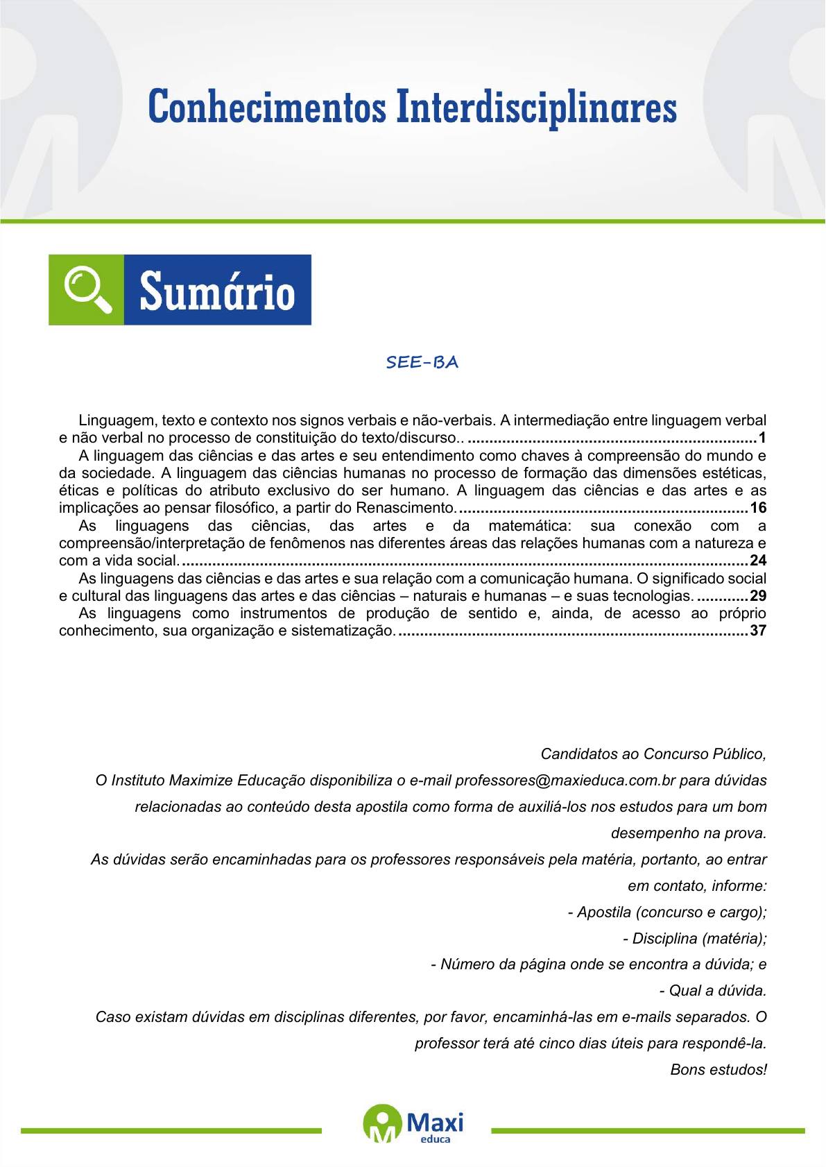 . 1 SEE-BA Linguagem, texto e contexto nos signos verbais e não-verbais. A intermediação entre linguagem verbal e não verbal no processo de constituição do texto/discurso.. ................................................................... 1 A linguagem das ciências e das artes e seu entendimento como chaves à compreensão do mundo e da sociedade. A linguagem das ciências humanas no processo de formação das dimensões estéticas, éticas e políticas do atributo exclusivo do ser humano. A linguagem das ciências e das artes e as implicações ao pensar filosófico, a partir do Renascimento. ................................................................... 16 As linguagens das ciências, das artes e da matemática: sua conexão com a compreensão/interpretação de fenômenos nas diferentes áreas das relações humanas com a natureza e com a vida social. ................................................................................................................................... 24 As linguagens das ciências e das artes e sua relação com a comunicação humana. O significado social e cultural das linguagens das artes e das ciências – naturais e humanas – e suas tecnologias. ............ 29 As linguagens como instrumentos de produção de sentido e, ainda, de acesso ao próprio conhecimento, sua organização e sistematização. ................................................................................. 37 Candidatos ao Concurso Público, O Instituto Maximize Educação disponibiliza o e-mail professores@maxieduca.com.br para dúvidas relacionadas ao conteúdo desta apostila como forma de auxiliá-los nos estudos para um bom desempenho na prova. As dúvidas serão encaminhadas para os professores responsáveis pela matéria, portanto, ao entrar em contato, informe: - Apostila (concurso e cargo); - Disciplina (matéria); - Número da página onde se encontra a dúvida; e - Qual a dúvida. Caso existam dúvidas em disciplinas diferentes, por favor, encaminhá-las em e-mails separados. O professor terá até cinco dias úteis para respondê-la. Bons estudos! 1381340 E-book gerado especialmente para DIEGO SALES DE OLIVEIRA . 1 Caro(a) candidato(a), antes de iniciar nosso estudo, queremos nos colocar à sua disposição, durante todo o prazo do concurso para auxiliá-lo em suas dúvidas e receber suas sugestões. Muito zelo e técnica foram empregados na edição desta obra. No entanto, podem ocorrer erros de digitação ou dúvida conceitual. Em qualquer situação, solicitamos a comunicação ao nosso serviço de atendimento ao cliente para que possamos esclarecê-lo. Entre em contato conosco pelo e-mail: professores@maxieduca.com.br Linguagem Como instrução geral, podemos dizer que uma hipótese interpretativa é aceitável sempre que o texto apresenta pista ou pistas que a confirmam e sustentam. O texto abaixo é bastante apropriado. “Aquela senhora tem um piano. Que é agradável, mas não é o correr dos rios. Nem o murmúrio que as árvores fazem... Por que é preciso ter um piano? O melhor é ter ouvidos E amar a Natureza.” Que simboliza o piano no poema? Dentro do contexto que se insere o piano, representa um bem cultural, o que se percebe pela oposição que o texto estabelece entre o som do piano (bem cultural) e o correr dos rios e o murmúrio das árvores (bens naturais). O poema descarta a necessidade do piano, dando preferência à fruição dos sons da Natureza. O que é a linguagem? É qualquer e todo sistema de signos que serve de meio de comunicação de ideias ou sentimentos através de signos convencionados, sonoros, gráficos, gestuais etc., podendo ser percebida pelos diversos órgãos dos sentidos, o que leva a distinguirem-se várias espécies ou tipos: visual, auditiva, tátil, etc., ou, ainda, outras mais complexas, constituídas, ao mesmo tempo, de elementos diversos. Os elementos constitutivos da linguagem são, pois, gestos, sinais, sons, símbolos ou palavras, usados para representar conceitos de comunicação, ideias, significados e pensamentos. Embora os animais também se comuniquem, a linguagem verbal pertence apenas ao Homem. Não se devem confundir os conceitos de linguagem e de língua. Enquanto aquela (linguagem) diz respeito à capacidade ou faculdade de exercitar a comunicação, latente ou em ação ou exercício, esta última (língua ou idioma) refere-se a um conjunto de palavras e expressões usadas por um povo, por uma nação, munido de regras próprias (sua gramática). Noutra acepção (anátomo-fisiológica), linguagem é função cerebral que permite a qualquer ser humano adquirir e utilizar uma língua. Por extensão, chama-se linguagem de programação ao conjunto de códigos usados em computação. O estudo da linguagem, que envolve os signos, de uma forma geral, é chamado semiótica. A linguística é subordinada à semiótica porque seu objeto de estudo é a língua, que é apenas um dos sinais estudados na semiótica. A respeito das origens da linguagem humana, alguns estudiosos defendem a tese de que a linguagem desenvolveu-se a partir da comunicação gestual com as mãos. Posteriores alterações no aparelho fonador, os seres humanos passaram a poder produzir uma variedade de sons muito maior do que a dos demais primatas. De acordo com Kandel apesar das dificuldades de se apontar com precisão quando ou como a linguagem evoluiu há certo consenso quanto a algumas estruturas cerebrais constituírem-se como pré- requisitos para a linguagem e que estas parecem ter surgido precocemente na evolução humana. Segundo esse autor essa conclusão foi atingida após exame dos moldes intracranianos de fósseis humanos. Na maioria dos indivíduos o hemisfério esquerdo é dominante para a linguagem; a área cortical da fala do lobo temporal (o plano temporal) é maior no hemisfério esquerdo que no direito. Visto que os giros e sulcos importantes deixam com frequência impressões no crânio, o registro f