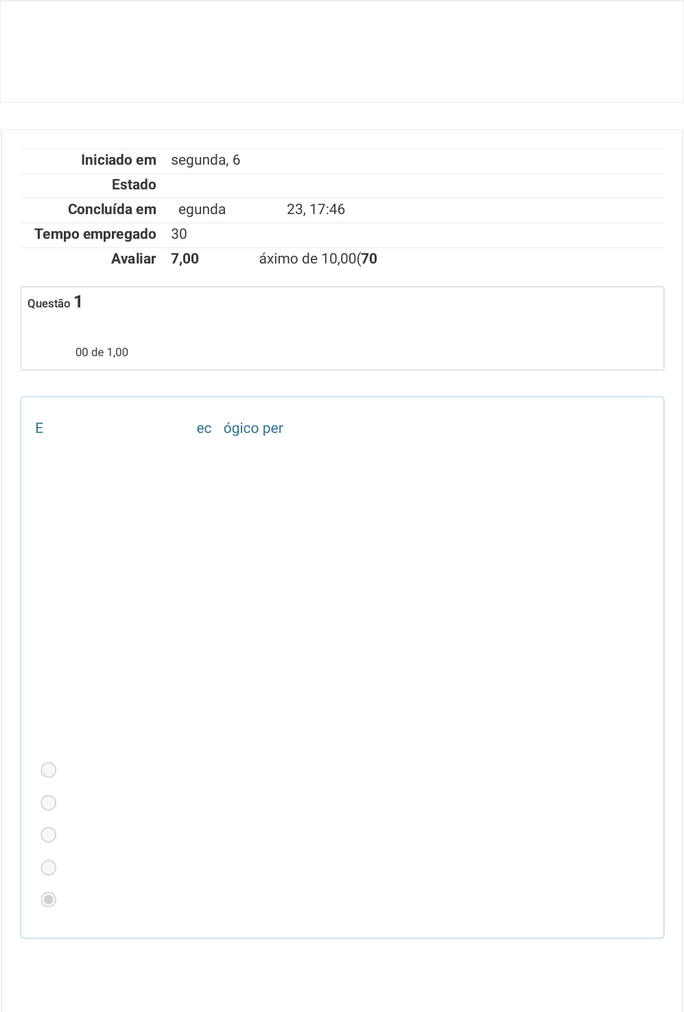 Painel / Meus cursos / BIOGEOGRAFIA unicv-fce-r2 / AVALIAÇÃO DE BIOGEOGRAFIA / AVALIAÇÃO DE BIOGEOGRAFIA Iniciado em segunda, 6 nov 2023, 17:16 Estado Finalizada Concluída em segunda, 6 nov 2023, 17:46 Tempo empregado 30 minutos 7 segundos Avaliar 7,00 de um máximo de 10,00(70%) Questão 1 Incorreto Atingiu 0,00 de 1,00 Em biogeografia, o nicho ecológico permite compreender a distribuição das espécies. Certos animais estão condicionados a uma região por conta da vegetação existente, temperatura ou da presença de outros animais dos quais ele é o predador (BROWN e LOMOLINO, 2006; CONTI, 2014). Sobre o conceito de nicho ecológico, analise as afirmações abaixo: I- Está relacionado ao relacionamento de determinada espécie com o ambiente, com as características do seu habitat. II- É espaço n-dimensional no qual as características biológicas de determinada espécie estariam em concordância com os fatores físico e químicos de uma região. III- É um ambiente imutável, em que não ocorrem mudanças com o passar do tempo geológico. Sobre as afirmações acima: Escolha uma opção: a. Apenas a I está correta. b. A alternativa II e III estão corretas. c. Apenas a III está correta. d. Apenas a II está correta. e. A alternativa I e a II estão corretas. https://moodle.ead.unifcv.edu.br/my/ https://moodle.ead.unifcv.edu.br/my/ https://moodle.ead.unifcv.edu.br/course/view.php?id=1421 https://moodle.ead.unifcv.edu.br/course/view.php?id=1421#section-6 https://moodle.ead.unifcv.edu.br/mod/quiz/view.php?id=47893 Questão 2 Correto Atingiu 1,00 de 1,00 Uma característica do cosmopolitismo é que as espécies possuem um limite de tolerância alto, podendo suportar variações físicas e químicas com facilidade. No ambiente terrestre, os ratos são exemplos de organismos cosmopolitas e com elevado limite de tolerância (BROWN e LOMOLINO, 2006). Sobre o cosmopolitismo, é correto afirmar: Escolha uma opção: a. É a capacidade de sobreviver em quase todas as regiões do planeta, exceto onde o clima é tropical, como as regiões entre os trópicos. b. É a capacidade de sobreviver em quase todas as regiões do planeta, exceto onde o clima é severo, como as regiões geladas dos polos. c. É a capacidade de sobreviver em todas as regiões do planeta, inclusive onde o clima é severo, como as regiões geladas dos polos. d. É a capacidade de sobreviver em quase todas as regiões do planeta, exceto onde o clima é severo, como as regiões temperadas. e. É a capacidade de sobreviver em quase todas as regiões do planeta, exceto onde o clima é temperado, como as regiões próximas dos polos. Questão 3 Incorreto Atingiu 0,00 de 1,00 A conferência sobre o meio ambiente, que aconteceu em 1972, em Estocolmo, na Suécia, reuniu 113 países e mais de duzentas organizações não governamentais (ONG). Nesse evento, diversos debates foram traçados e muitas ideias discutidas. Sobre esse evento, analise as assertivas: I- A ecodiplomacia, tratando diretamente do viés ecológico nas relações internacionais, foi uma das ideias descartadas na conferência. II- Do evento, surgiu a Declaração de Estocolmo sobre o Meio Ambiente Humano, em que se tentou definir os ambientais e que deveriam integrar e auxiliar a formar os discursos e ações a partir de então. III- Sugeriu-se um rígido controle de natalidade para que o crescimento demográfico nos países subdesenvolvidos não comprometesse as questões ambientais. Assinale a alternativa que apresenta as assertivas corretas: Escolha uma opção: a. Estão corretas as assertivas I e III b. Apenas a I está correta. c. Todas estão corretas. d. Estão corretas as assertivas II e III. e. Apenas a III está correta. Questão 4 Correto Atingiu 1,00 de 1,00 O meio técnico e científico que se colocou a partir do surgimento das fábricas na revolução industrial marca o período de maior exploração do ambiente natural. Uma época marcada pelo produtivismo, doutrina que estabelece a expansão da produção equivalente ao desenvolvimento econômico, colocando este último como motor principal, desconsiderando os impactos causados no meio ambiente. Sobre esse período, leia com atenção as assertivas abaixo: I- A fábrica e seus gases poluentes tornam-se símbolos dessa doutrina que consumiu e deteriorou expressivamente o meio ambiente no período áureo da revolução industrial. II- Esse período inaugurou o meio técnico, científico e informacional, ou seja, a técnica, como produtora do espaço geográfico, baseada no desenvolvimento informacional. A partir da análise das assertivas, marque a opção correta: Escolha uma opção: a. A asserção I é verdadeira e a II é falsa. b. As asserções I e II são proposições excludentes. c. As duas asserções são verdadeiras e a segunda afirmativa complementa a primeira. d. A asserção I e II são falsas. e. A asserção II contraria a ideia expressa na assertiva I. Questão 5 Correto Atingiu 1,00 de 1,00 Sobre as regiões cobertas por gelo polar, analise as asserções e responda o que se pede: I- Regiões permanentemente geladas são habitadas por vegetação simples, pouco desenvolvidas. II- O desenvolvimento dos organismos pressupõe condições climáticas equilibradas com temperaturas e pluviosidade variadas ao longo do tempo. As regiões polares possuem poucas dessas variações, pois se caracterizam pela elevada amplitude térmica e temperaturas extremamente baixas. Marque a alternativa correta: Escolha uma opção: a. A asserção I e II estão corretas e se complementam. b. Apenas a asserção I está correta. c. As asserções I e II são excludentes. d. A asserção II está correta e a asserção I está incorreta. e. As asserções I e II estão incorretas. Questão 6 Correto Atingiu 1,00 de 1,00 A floresta de coníferas, também chamada de taiga ou floresta boreal, apresenta essa denominação por ser uma floresta formada, basicamente, por pinheiros, que têm um aspecto d