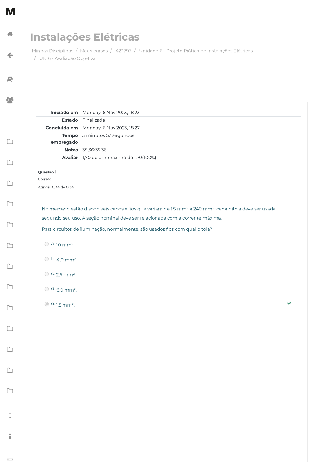 06/11/2023, 18:28 UN 6 - Avaliação Objetiva: Revisão da tentativa https://avap.multivix.edu.br/mod/quiz/review.php?attempt=4252040&cmid=1535882 1/3 Minhas Disciplinas / Meus cursos / 423797 / Unidade 6 - Projeto Prático de Instalações Elétricas / UN 6 - Avaliação Objetiva Instalações Elétricas Iniciado em Monday, 6 Nov 2023, 18:23 Estado Finalizada Concluída em Monday, 6 Nov 2023, 18:27 Tempo empregado 3 minutos 57 segundos Notas 35,36/35,36 Avaliar 1,70 de um máximo de 1,70(100%) Questão 1 Correto Atingiu 0,34 de 0,34 No mercado estão disponíveis cabos e �os que variam de 1,5 mm² a 240 mm², cada bitola deve ser usada segundo seu uso. A seção nominal deve ser relacionada com a corrente máxima. Para circuitos de iluminação, normalmente, são usados �os com qual bitola? a. 10 mm². b. 4,0 mm². c. 2,5 mm². d. 6,0 mm². e. 1,5 mm². https://avap.multivix.edu.br/my/ https://avap.multivix.edu.br/course/view.php?id=23718 https://avap.multivix.edu.br/course/view.php?id=23718§ion=7 https://avap.multivix.edu.br/mod/quiz/view.php?id=1535882 https://avap.multivix.edu.br/my/ https://avap.multivix.edu.br/course/view.php?id=23718 https://avap.multivix.edu.br/user/index.php?id=23718 https://avap.multivix.edu.br/course/view.php?id=23718§ion=1 https://avap.multivix.edu.br/course/view.php?id=23718§ion=2 https://avap.multivix.edu.br/course/view.php?id=23718§ion=3 https://avap.multivix.edu.br/course/view.php?id=23718§ion=4 https://avap.multivix.edu.br/course/view.php?id=23718§ion=5 https://avap.multivix.edu.br/course/view.php?id=23718§ion=6 https://avap.multivix.edu.br/course/view.php?id=23718§ion=7 https://avap.multivix.edu.br/course/view.php?id=23718§ion=8 https://avap.multivix.edu.br/course/view.php?id=23718§ion=9 https://avap.multivix.edu.br/course/view.php?id=23718§ion=10 https://avap.multivix.edu.br/course/view.php?id=23718§ion=11 https://avap.multivix.edu.br/course/view.php?id=23718§ion=12 https://avap.multivix.edu.br/course/view.php?id=23718§ion=13 https://avap.multivix.edu.br/hooks/portal/ https://avap.multivix.edu.br/mod/page/view.php?id=1252%2F%22%20target%3D%22_blank https://avap.multivix.edu.br/calendar/view.php/ https://avap.multivix.edu.br/ https://avap.multivix.edu.br/ https://avap.multivix.edu.br/ https://avap.multivix.edu.br/ 06/11/2023, 18:28 UN 6 - Avaliação Objetiva: Revisão da tentativa https://avap.multivix.edu.br/mod/quiz/review.php?attempt=4252040&cmid=1535882 2/3 Questão 2 Correto Atingiu 0,34 de 0,34 Questão 3 Correto Atingiu 34,00 de 34,00 A NBR 5410 – Instalações elétricas, estipula parâmetros para projetos e execução das instalações elétricas em baixa tensão. Um dos principais dispositivos que devem ser dimensionados para as instalações são as tomadas, que podem ser de uso geral TUG e as de uso especí�co TUE. Segundo a norma, as tomadas de uso geral TUG devem ser dimensionados com qual potência mínima? a. 400 W. b. 300 W. c. 500 W. d. 250 W. e. 600 W. O item 9.5.2.1 da norma de instalações elétricas a NBR 5410, determina os critérios mínimos para o dimensionamento dos circuitos de iluminação. Segundo a norma, os cômodos devem possuir uma potência mínima e uma quantidade de pontos de luz mínima, quais são esses valores? a. 100 VA e 2 pontos. b. 100 VA e 1 ponto. c. 140 VA e 2 pontos. d. 120 VA e 2 pontos. e. 160 VA e 1 ponto. https://avap.multivix.edu.br/my/ https://avap.multivix.edu.br/course/view.php?id=23718 https://avap.multivix.edu.br/user/index.php?id=23718 https://avap.multivix.edu.br/course/view.php?id=23718§ion=1 https://avap.multivix.edu.br/course/view.php?id=23718§ion=2 https://avap.multivix.edu.br/course/view.php?id=23718§ion=3 https://avap.multivix.edu.br/course/view.php?id=23718§ion=4 https://avap.multivix.edu.br/course/view.php?id=23718§ion=5 https://avap.multivix.edu.br/course/view.php?id=23718§ion=6 https://avap.multivix.edu.br/course/view.php?id=23718§ion=7 https://avap.multivix.edu.br/course/view.php?id=23718§ion=8 https://avap.multivix.edu.br/course/view.php?id=23718§ion=9 https://avap.multivix.edu.br/course/view.php?id=23718§ion=10 https://avap.multivix.edu.br/course/view.php?id=23718§ion=11 https://avap.multivix.edu.br/course/view.php?id=23718§ion=12 https://avap.multivix.edu.br/course/view.php?id=23718§ion=13 https://avap.multivix.edu.br/hooks/portal/ https://avap.multivix.edu.br/mod/page/view.php?id=1252%2F%22%20target%3D%22_blank https://avap.multivix.edu.br/calendar/view.php/ https://avap.multivix.edu.br/ https://avap.multivix.edu.br/ https://avap.multivix.edu.br/ https://avap.multivix.edu.br/ 06/11/2023, 18:28 UN 6 - Avaliação Objetiva: Revisão da tentativa https://avap.multivix.edu.br/mod/quiz/review.php?attempt=4252040&cmid=1535882 3/3 Questão 4 Correto Atingiu 0,34 de 0,34 Questão 5 Correto Atingiu 0,34 de 0,34 As linhas elétricas podem ser de tipos diferentes, temos linhas de transmissão, distribuição, geração, cada uma possui um papel fundamental para o consumidor �nal. Redes com tensões nominais iguais ou entre 69 kV e 138 kV, são consideradas: a. Média Tensão (MT). b. Extra Tensão (EHV). c. Extra Alta Tensão (EAT). d. Alta Tensão (AT). e. Baixa Tensão (BT). Os dispositivos de seccionamento devem abrir corretamente todos os condutores vivos do circuito, a norma exige que a distância de abertura entre contatos do dispositivo seja visível e con�ável, indicados por uma marcação "desligado" ou "ligado". De acordo com a NR 10, quais os símbolos que indicam aberto e fechado, respectivamente? a. A e F. b. D e L. c. O e C. d. C e I. e. O e I. ◄ Conteúdo online Seguir para... Exercícios de Fixação ► https://avap.multivix.edu.br/mod/scorm/view.php?id=1535881&forceview=1 https://avap.multivix.edu.br/mod/quiz/view.php?id=1535883&forceview=1 https://avap.multivix.edu.br/my/ https://avap.multivix.edu.br/course/view.php?id=23718 https://avap.multivix.edu.br/user/index.php?id=23718 https://avap.multivix.edu.br/course/view.php?id=23718