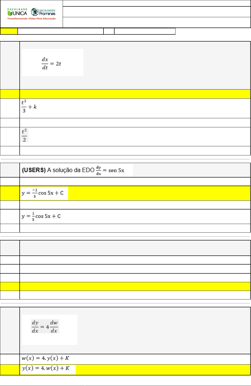 03/10/2023 19:21:10 1/3 REVISÃO DE SIMULADO Nome: PAULO SERGIO DOS SANTOS SUBTIL Disciplina: Cálculo III Respostas corretas são marcadas em amarelo X Respostas marcardas por você. Questão 001 Analise a expressão abaixo: A solução para a equação do primeiro grau dada é A) t2+k B) X C) t2 D) E) t2-3k Questão 002 A) y=cos â�¡5x+C B) C) y=cosâ�¡ x+C X D) E) y=cosâ�¡ 3x+C Questão 003 (UFPR-Adaptada) A opção que representa a solução da equação xy' = y, diferencial de variáveis separáveis é: A) y=Cx+8 B) y=Cex C) y=Cx+12 X D) y=Cx E) y=C lnx Questão 004 Analise a expressão abaixo: A solução geral para a equação acima é X A) B) 03/10/2023 19:21:10 2/3 C) D) E) Questão 005 Analise a expressão abaixo: Considerando a expressão dada, avalie a seguintes asserções e a relação proposta entre elas. I. A expressão representa uma equação do primeiro grau e possui uma solução geral. PORQUE II. O expoente indicado na derivada é de ordem 1 e, além disso, utilizando o método da separação de variáveis chega-se na solução geral. A respeito destas asserções, assinale a opção correta. A) As asserçoÌ�es I e II saÌ�o proposiçoÌ�es verdadeiras, e a II eÌ� uma justificativa da I. B) A asserção I é uma proposição falsa e, a II é uma proposição verdadeira. X C) As asserções I e II são proposições falsas. D) As asserções I e II são proposições verdadeiras, mas a II não é uma justificativa da I. E) A asserção I é uma proposição verdadeira e, a II é uma proposição falsa. Questão 006 (UFPR-Adaptada) A opção que representa a solução da equação y'=e x-2y, diferencial de variáveis separáveis é: A) B) C) D) X E) Questão 007 (UFPEL-Adaptada) A solução geral da EDO x 2+y2-2xyy' = 0 é: A) y2-x2=Cx+9 B) y2=2x+8 X C) y2-x2=Cx D) y2=Cx E) y2-x2=Cx+2 Questão 008 Considere a seguinte equação: , sua solução será: A) y=12x- 8 B) y=7x2- 5x 03/10/2023 19:21:10 3/3 X C) y=2x2- 8x D) y=7x2 E) y=4x+3