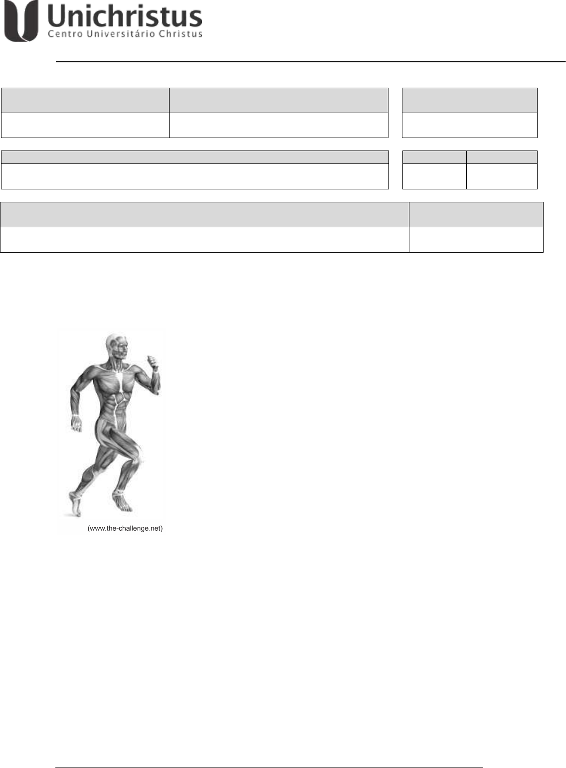 Exercícios Página 1 de 16 Curso Disciplina / Tema Período / Ano / Semestre Enfermagem Cito/Histo/Embriologia 2º 2021.1 Professor(a) Turno Data Delano Macêdo Noite Aluno(a) Matrícula 1. Durante os Jogos Olímpicos Rio 2016, várias modalidades esportivas foram acompanhadas por pesquisadores e fisiologistas, que analisaram o desempenho dos atletas e coletaram dados para estudos sobre o rendimento dos músculos, como os destacados na imagem. a) Cite o tipo de músculo que se destaca na imagem. Classifique essa musculatura quanto à forma de contração. b) A fosfocreatina e a mioglobina são substâncias encontradas nas células musculares. Explique a função da fosfocreatina e da mioglobina na contração muscular. 2. A pele é o maior órgão do corpo humano e desempenha diversas funções, tais como proteção contra agressões externas, perda de água do corpo, regulação térmica, além de ser responsável pelo sentido do tato. a) Cite os dois principais tipos de tecidos presentes na pele humana e diferencie-os considerando a quantidade de matriz extracelular. b) Descreva dois mecanismos que permitem a regulação térmica através da pele. c) Por que a pele é considerada um órgão? 3. As Olimpíadas de 2016 no Brasil contarão com 42 esportes diferentes. Dentre as modalidades de atletismo, teremos a corrida dos 100 metros rasos e a maratona, com Exercícios Página 2 de 16 percurso de pouco mais de 42 km. A musculatura esquelética dos atletas que competirão nessas duas modalidades apresenta uma composição distinta de fibras. As fibras musculares do tipo I são de contração lenta, possuem muita irrigação sanguínea e muitas mitocôndrias. Ao contrário, as fibras do tipo II são de contração rápida, pouco irrigadas e com poucas mitocôndrias. As fibras do tipo I têm muita mioglobina, uma proteína transportadora de moléculas de gás oxigênio que confere a estas fibras coloração vermelha escura, ao passo que as do tipo II têm pouca mioglobina, sendo mais claras. A imagem ilustra a disposição das fibras musculares de cortes histológicos transversais, vistas ao microscópio, da musculatura dos atletas Carlos e João. Cada atleta compete em uma dessas duas modalidades. Por que é possível afirmar que Carlos é o atleta que compete na maratona? Que metabolismo energético predomina em suas fibras musculares? Determine o metabolismo energético que predomina nas fibras musculares de João e explique por que ele é mais suscetível à fadiga muscular quando submetido ao exercício físico intenso e prolongado. 4. Probióticos, como os Lactobacillus e Bifidobacterium, são microrganismos vivos que, quando administrados adequadamente, favorecem o sistema imune por sua capacidade, por exemplo, de ativar os macrófagos locais e diminuir as respostas aos antígenos dos alimentos, evitando muitas alergias. Apresente duas ações dos macrófagos ativados que podem trazer benefícios imunológicos para quem faz uso dos probióticos. 5. Para fazer um piercing é necessário saber quais são os principais cuidados apontados por especialistas, dentre eles, o de optar por áreas sem cartilagens, pois pode haver o risco de infecções e formação de queloides. Considerando isto, a) apresente duas funções do tecido cartilaginoso no organismo humano. b) justifique, do ponto de vista da constituição do tecido cartilaginoso, as dificuldades para controlar uma infecção em locais que contenham cartilagens. 6. A gordura em excesso é um fator de alerta em relação às condições de saúde dos indivíduos. Profissionais que atuam na área de Fisioterapia Dermato-funcional têm demonstrado a eficácia no tratamento de gordura localizada pela aplicação de ultrassom em células adiposas do tecido subcutâneo. Essa técnica permite o rompimento das membranas das células de gordura. Em relação ao contexto acima, cite: a) duas funções do tecido adiposo em nosso corpo; b) dois tipos de lipídios contidos no organismo humano. Exercícios Página 3 de 16 7. Um dos domínios da ergonomia está relacionado às respostas do corpo humano, à carga física e psicológica. O designer deve ficar atento a essas respostas, pois assim poderá garantir características importantes à construção e melhoria de materiais, bem como disposição física de estações de trabalho mais adequadas, evitando que a pessoa exerça a repetição de movimentos e ocasione lesões músculo-esqueléticas pela L.E.R. (lesão por esforço repetitivo). A doença atinge músculos e tendões, que ficam irritados. Em relação ao contexto: a) O que são tendões? b) Explique como ocorre o processo de contração do músculo estriado esquelético. 8. Leia o texto e observe a figura a seguir. BRASIL NA COPA DA ÁFRICA A seleção brasileira de futebol é a única a participar de todas as copas mundiais. Sua estreia na copa da África do Sul será no dia 15 de junho contra a Coreia do Sul. Como um dos esportes símbolos nacionais, o futebol promove um elevado desgaste físico aos seus atletas, pois é uma modalidade esportiva intermitente e de longa duração, exigindo movimentos com elevadas ações de contração muscular durante a partida, como esquematizado na figura. Considerando o exposto, explique como ocorre, no atleta, o movimento de contração da unidade representada na figura durante uma partida de futebol. 9. A tabela a seguir apresenta algumas características de dois tipos de fibras musculares do corpo humano. Fibras musculares Características Tipo I Tipo IIB Velocidade de contração Lenta Rápida Concentração de enzimas oxidativas Alta Baixa Exercícios Página 4 de 16 Concentração de enzimas glicolíticas Baixa Alta a) Em suas respectivas provas, um velocista corre 200m, com velocidade aproximada de 36km h, e um maratonista corre 42km, com velocidade aproximada de 18km h. Que tipo de fibra muscular se espera encontrar, em maior abundância, nos músculos do corpo de cada um desses atleta