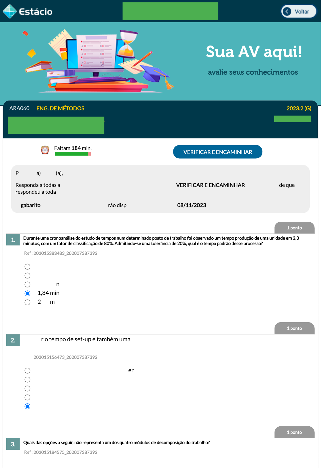 LUCAS DE MESQUITA MOREIRA Sua AV aqui! 202007387392 MARACANÃ avalie seus conhecimentos 1 ponto Durante uma cronoanálise do estudo de tempos num determinado posto de trabalho foi observado um tempo produção de uma unidade em 2,3 minutos, com um fator de classi�cação de 80%. Admitindo-se uma tolerância de 20%, qual é o tempo padrão desse processo? Ref.: 202015383483_202007387392 1 ponto Reduzir o tempo de set-up é também uma condição para diminuir o custo unitário de preparação, essa redução se torna importante por algumas razões. Identi�que nas respostas seguintes aquela com a a�rmação incorreta. Ref.: 202015156473_202007387392 1 ponto Quais das opções a seguir, não representa um dos quatro módulos de decomposição do trabalho? Ref.: 202015184575_202007387392 ARA0607 - ENG. DE MÉTODOS 2023.2 (G) Aluno: LUCAS DE MESQUITA MOREIRA 202007387392 Início: 07/11/2023 19:31:08 Faltam 184 min. VERIFICAR E ENCAMINHAR Prezado(a) Aluno(a), Responda a todas as questões com atenção. Somente clique no botão VERIFICAR E ENCAMINHAR ao ter certeza de que respondeu a todas as questões. O gabarito e resultado da avaliação estarão disponíveis a partir do dia 08/11/2023. 1. 2,05 min 1,88 min 2,26 min 1,84 min 2,21 min 2. ( ) As técnicas de TRF diminuem os erros na regulagem dos equipamentos ( ) A redução do setup da máquina aumenta o tempo de disponibilidade dela ( ) Se o custo de setup é alto, os lotes de fabricação também são. ( ) O setup organizado contribui para uma melhor produtividade ( ) Uma TRF correta contribui para melhor qualidade do produto �nal 3. javascript:voltar(); javascript:voltar(); 1 ponto (PETROBRÁS / 2019) O benchmarking é o processo de aprender com os outros e envolve a comparação do seu próprio desempenho ou método com o de outras operações comparáveis. As empresas usam o benchmarking para Ref.: 202013475960_202007387392 1 ponto Algumas vezes, se tem como objetivo apenas determinar o Tempo de Ciclo-TC, sem a necessidade de melhoria ou análise dos métodos de trabalho. Nesses casos, a _______________ corresponde à medição dos tempos e a avaliação de ritmo de trabalho dos operadores Ref.: 202013501597_202007387392 1 ponto O set-up é uma atividade de preparação da máquina antes de iniciar a produção de um produto, inclui-se nesse tempo um tempo necessário para a produção da primeira peça liberada para a produção. A esse tempo �nal de setup chamamos de: Ref.: 202015142960_202007387392 1 ponto A produtividade de cada recurso gasto, para os seguintes dados abaixo, será igual a? Produção efetiva (saída) = 200 peças Recurso de mão de obra (entrada) = 5 funcionários por 4 horas Ref.: 202013475951_202007387392 Fase do trabalho Ciclo de trabalho Cronometragem Menor divisão do trabalho Elemento de trabalho 4. comparar processos semelhantes de empresas similares do mesmo setor industrial. compreender melhor como empresas líderes atuam de maneira a aperfeiçoar seus próprios processos. fazer espionagem industrial em grandes empresas. copiar ou imitar operações bem-sucedidas de outras organizações. promover projetos isolados de melhoria de processos. 5. Melhoria de Processos Análise do Trabalho Folha de Operações Amostragem Cronometragem 6. ( ) EMDS ( ) TRF ( ) SEMP ( ) TRYOUT ( ) SMED 7. 30 peças por hora 200 peças 50 peças por hora 10 peças por hora 40 peças por hora 1 ponto Quais das opções abaixo representam metodologias que atendem o processo geral de solução de problemas: Ref.: 202015383511_202007387392 1 ponto Por quê precisamos de especialistas em estudo de trabalho? Ref.: 202015383501_202007387392 1 ponto O diagrama usado para documentar processos em gestão de produção é denominado Diagrama de Fluxo de Processo é utilizado para analisar o �uxo dos processos e possui diversos simbolos. O elemento que representa interrupção, pausa, nas operações é: Ref.: 202015296308_202007387392 8. Simograma; Oito D e; ROONEY E HOPEN QC Story; Oito D e; ROONEY E HOPEN QC Story; Set up e; Simograma Set up; Oito D e; ROONEY E HOPEN QC Story; Simograma e; ROONEY E HOPEN 9. Todas as opções estão corretas Conhecimento Expertise Foco Comprometimento 10. Um quadrado Um círculo Um D maiúsculo Uma seta dupla Um triângulo VERIFICAR E ENCAMINHAR Não Resp. Não Gravada Gravada
