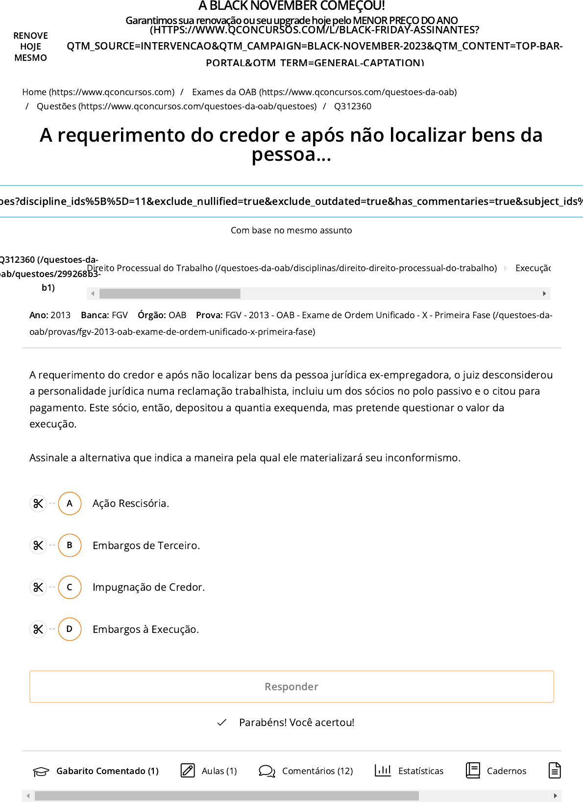 Ano: 2013 Banca: FGV Órgão: OAB A requerimento do credor e após não localizar bens da pessoa jurídica ex-empregadora, o juiz desconsiderou a personalidade jurídica numa reclamação trabalhista, incluiu um dos sócios no polo passivo e o citou para pagamento. Este sócio, então, depositou a quantia exequenda, mas pretende questionar o valor da execução. Assinale a alternativa que indica a maneira pela qual ele materializará seu inconformismo. A Ação Rescisória. B Embargos de Terceiro. C Impugnação de Credor. D Embargos à Execução. Parabéns! Você acertou! Home (https://www.qconcursos.com) / Exames da OAB (https://www.qconcursos.com/questoes-da-oab) / Questões (https://www.qconcursos.com/questoes-da-oab/questoes) / Q312360 A requerimento do credor e após não localizar bens da pessoa... oes?discipline_ids%5B%5D=11&exclude_nulli�ed=true&exclude_outdated=true&has_commentaries=true&subject_ids% Com base no mesmo assunto Q312360 (/questoes-da- oab/questoes/299268b3- b1) Direito Processual do Trabalho (/questoes-da-oab/disciplinas/direito-direito-processual-do-trabalho) Execução Prova: FGV - 2013 - OAB - Exame de Ordem Uni�cado - X - Primeira Fase (/questoes-da- oab/provas/fgv-2013-oab-exame-de-ordem-uni�cado-x-primeira-fase) Responder Gabarito Comentado (1) Aulas (1) Comentários (12) Estatísticas Cadernos A BLACK NOVEMBER COMEÇOU! Garantimos sua renovação ou seu upgrade hoje pelo MENOR PREÇO DO ANO RENOVE HOJE MESMO (HTTPS://WWW.QCONCURSOS.COM/L/BLACK-FRIDAY-ASSINANTES? QTM_SOURCE=INTERVENCAO&QTM_CAMPAIGN=BLACK-NOVEMBER-2023&QTM_CONTENT=TOP-BAR- PORTAL&QTM TERM=GENERAL-CAPTATION) https://www.qconcursos.com/ https://www.qconcursos.com/ https://www.qconcursos.com/ https://www.qconcursos.com/questoes-da-oab https://www.qconcursos.com/questoes-da-oab https://www.qconcursos.com/questoes-da-oab https://www.qconcursos.com/questoes-da-oab/questoes https://www.qconcursos.com/questoes-da-oab/questoes https://www.qconcursos.com/questoes-da-oab/questoes https://www.qconcursos.com/questoes-da-oab/questoes?discipline_ids%5B%5D=11&exclude_nullified=true&exclude_outdated=true&has_commentaries=true&subject_ids%5B%5D=16576&subject_ids%5B%5D=16585 https://www.qconcursos.com/questoes-da-oab/questoes/299268b3-b1 https://www.qconcursos.com/questoes-da-oab/disciplinas/direito-direito-processual-do-trabalho https://www.qconcursos.com/questoes-da-oab/disciplinas/direito-direito-processual-do-trabalho/execucao-trabalhista https://www.qconcursos.com/questoes-da-oab/provas/fgv-2013-oab-exame-de-ordem-unificado-x-primeira-fase https://www.qconcursos.com/questoes-da-oab/provas/fgv-2013-oab-exame-de-ordem-unificado-x-primeira-fase https://www.qconcursos.com/questoes-da-oab/provas/fgv-2013-oab-exame-de-ordem-unificado-x-primeira-fase https://www.qconcursos.com/l/black-friday-assinantes?qtm_source=intervencao&qtm_campaign=black-november-2023&qtm_content=top-bar-portal&qtm_term=general-captation Questões de assuntos semelhantes No que concerne à liquidação de sentença e à execução trabalhista, assinale a opção correta. (/questoes-de- concursos/questoes/51005dc5- 32) Nos Processos Trabalhistas, com relação ao mandado e a penhora de acordo com a Consolidação das Leis do Trabalho é correto a�rmar: (/questoes-de- concursos/questoes/ba6a8d78- 9a) Considerando-se as atuais Súmulas do Tribunal Superior do Trabalho, analise as proposições seguintes: I. Fundando-se a ação rescisória no artigo... (/questoes-de- concursos/questoes/b5c799dc- 95) Analise as seguintes proposições e depois assinale a alternativa CORRETA: I - O objeto da alienação realizada na (/questoes-de- concursos/questoes/6cd7884b- No caso em tela, houve desconsideração da personalidade jurídica (sendo... Autor: Cláudio Freitas, Juiz do Trabalho (TRT 1ª Região), Ex-Advogado da Petrobrás e Mestre em Direito (UFF), de Direito do Trabalho, Direito Processual do Trabalho, Direito Previdenciário No caso em tela, houve desconsideração da personalidade jurídica (sendo que no Processo do Trabalho é adotada a chamada "teoria menor" da desconsideração, em conformidade com o artigo 28, parágrafo quinto do CDC, pelo qual basta o inadimplemento das verbas laborais), com inclusão dos sócios, os quais passam a ser partes no processo (executados). Nesse caso, conforme doutrina e jurisprudência pací�cas, já que são partes do processo, o meio de impugnação em execução é exatamente o de embargos à execução, já que não são terceiros no sentido processual (artigos 1046 e seguintes do CPC). Assim, RESPOSTA: D. 70 7 https://www.qconcursos.com/questoes-de-concursos/questoes/51005dc5-32 https://www.qconcursos.com/questoes-de-concursos/questoes/ba6a8d78-9a https://www.qconcursos.com/questoes-de-concursos/questoes/b5c799dc-95 https://www.qconcursos.com/questoes-de-concursos/questoes/6cd7884b-0a Últimas notícias ver todas (/noticias) recuperação ... 0a) Após a elaboração da conta de liquidação, o juiz do trabalho (/questoes-de- concursos/questoes/a0987b31-2c) Provas relacionadas FGV - 2017 - OAB - Exame de Ordem Uni�cado - XXIII - Segunda Fase - Direito do Trabalho (/questoes-da-oab/provas/fgv-2017-oab-exame-de- ordem-uni�cado-xxiii-segunda-fase-direito-do- trabalho) FGV - 2011 - OAB - Exame de Ordem Uni�cado - IV - Segunda Fase - Direito do Trabalho (/questoes-da-oab/provas/fgv-2011-oab-exame-de- ordem-uni�cado-iv-segunda-fase-direito-do- trabalho) FGV - 2021 - OAB - Exame de Ordem Uni�cado XXXIII - Primeira Fase (/questoes-da-oab/provas/fgv-2021-oab-exame-de- ordem-uni�cado-xxxiii-primeira-fase) FGV - 2015 - OAB - Exame de Ordem Uni�cado - XVI - Segunda Fase - Direito Administrativo (/questoes-da-oab/provas/fgv-2015-oab-exame-de- ordem-uni�cado-xvi-segunda-fase-direito- administrativo) FGV - 2014 - OAB - Exame de Ordem Uni�cado - XII - Segunda Fase - Direito do Trabalho (/questoes-da-oab/provas/fgv-2014-oab-exame-de- ordem-uni�cado-xii-segunda-fase-direito-do- trabalho) ht