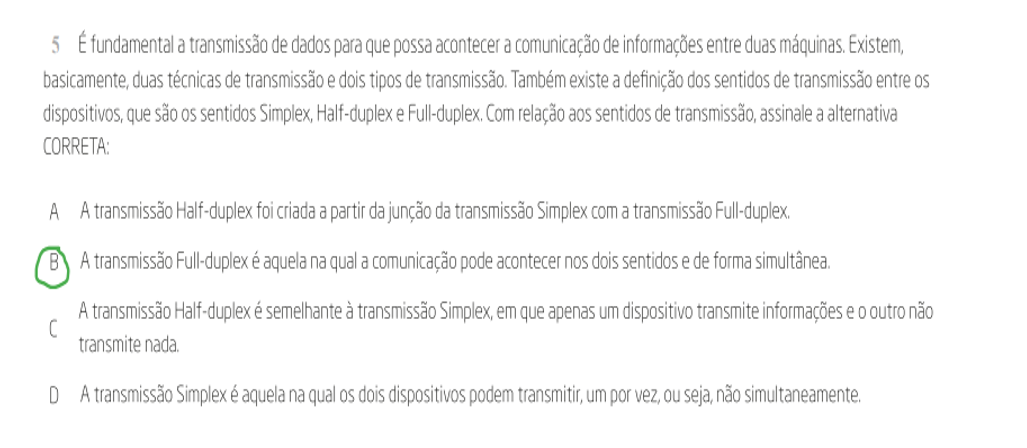 A) A transmissão Half-duplex foi criada a partir da junção da transmissão Simplex com a transmissão. B) A transmissão Full-duplex é aquela na qual a comunicação pode acontecer nos dois sentidos e de forma simultânea. C) A transmissão Half-duplex é semelhante à transmissão Simplex, em que apenas um dispositivo transmite informações e o outro não transmite. D) A transmissão Simplex é aquela na qual dois dispositivos podem transmitir, um por vez, ou seja, não simultaneamente.