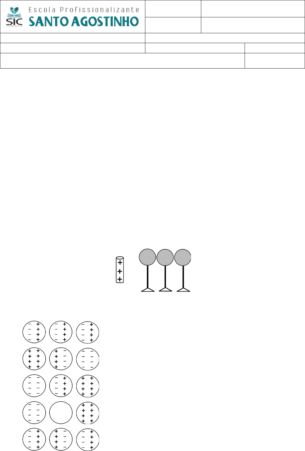 MODALIDADE: Ensino Médio Anual SÉRIE/MÓDULO PERÍODO/CURSO 3ª Série Disciplina: Física Atividade: Avaliação II – 2ª chamada – 1ª Etapa Professor (a): Fernando Palhares Data: Valor: Nome do Aluno: Nota: Instruções: I. Leia atentamente o enunciado das questões. II. Não faça perguntas durante a prova, pois o entendimento das instruções também é parte da avaliação. III. Elabore respostas completas, coesas, coerentes, claras, objetivas e de acordo com a norma padrão da língua. IV. Atenção ao marcar o quadro de respostas. Questões que contiverem rasuras serão anuladas. V. Use, em suas respostas, caneta de tinta azul ou preta. Não haverá revisão de questões respondidas a lápis. VI. Não é permitido o empréstimo de material (lápis, borracha, caneta, etc.) nem o uso de aparelhos celulares e/ou eletrônicos durante a prova. É proibido o uso de calculadora. VII. As questões que não contiverem justificativa não serão consideradas. VIII. Cada questão vale 1,0 (um) ponto. Questão 1 (UESPI) Três esferas metálicas, apoiadas em suportes isolantes, são colocadas próximas, como no desenho abaixo, porém sem se tocarem. Um bastão carregado positivamente é aproximado da primeira esfera. Assinale o diagrama que melhor representa a distribuição de cargas nas esferas. a) b) c) d) e) Questão 2 (Univale – MG) Duas esferas metálicas pequenas, A e B, de massas iguais, suspensas por fios isolantes, conforme representa a figura, são carregadas com cargas elétricas positivas que valem respectivamente q na esfera A e 2q na esfera B. Sendo F1 a intensidade da força elétrica exercida por A sobre B, e F2 a intensidade da força elétrica exercida por B sobre A, pode-se afirmar que: a) F1 = F2 b) F1 = 2F2 c) F2 = 2F1 d) F1 = 4F2 e) F2 = 4F1 Questão 3 (UFSCar – SP) Considere dois corpos sólidos envolvidos em processos de eletrização. Um dos fatores que pode ser observado tanto na eletrização por contato quanto na por indução é o fato de que, em ambas: a) torna-se necessário manter um contato direto entre os corpos. b) deve-se ter um dos corpos ligado temporariamente a um aterramento. c) ao fim do processo de eletrização, os corpos adquirem cargas elétricas de sinais opostos. d) um dos corpos deve, inicialmente, estar carregado eletricamente. e) para ocorrer, os corpos devem ser bons condutores elétricos. Questão 4 (UFMG – adaptada) O circuito da rede elétrica de uma cozinha está representado, esquematicamente, nesta figura: Nessa cozinha, há duas lâmpadas L, uma geladeira G e um forno elétrico F. Considere que a diferença de potencial na rede elétrica é constante. Inicialmente, apenas as lâmpadas e o forno estão em funcionamento. Nessa situação, as correntes elétricas nos pontos A e B, indicados na figura, são, respectivamente, iA e iB. Em um certo instante, a geladeira entra em funcionamento. Considerando-se essa nova situação, é CORRETO afirmar que: a) iA e iB se alteram. b) apenas iA se altera. c) iA e iB não se alteram. d) apenas iB se altera. e) N.D.A. Questão 5 (FEI SP) Quando a corrente elétrica atravessa o corpo humano ela provoca contrações musculares. É o que denominamos choque elétrico. O valor mínimo da corrente que uma pessoa consegue perceber é da ordem de 1 mA. O valor que pode ocasionar a morte é maior do que 10 mA. Se uma pessoa levar um choque de uma rede com diferença de potencial de 200 V, qual deverá ser sua resistência mínima para que ela não corra risco de vida? a) 2 . 105 b) 2 . 104 c) 2 . 103 d) 2 . 102 e) 2 . 101 Questão 6 (PUC – SP) Uma lâmpada permanece acesa durante 1 h, sendo percorrida por uma corrente elétrica de intensidade igual a 0,5 A. a) Qual a quantidade de carga elétrica que passou por uma secção de seu filamento? b) Quantos elétrons passaram? (Dado: carga do elétron = 1,6 x 10-19 C) Questão 7 (UFG – adaptada) Nos circuitos I e II dados, cada lâmpada (L) tem resistência de 4 e as baterias são de 12V. Considere as resistências lineares, fios ideais e corrente contínua. 1 2 V L 2 L 1 ( I ) L3 L4 Ch1 12V (II) Em relação aos circuitos I e II, classifique as afirmativas em verdadeiras (V) ou falsas (F) e justifique todas elas. I. ( ) em I, a corrente que passa em L1 é 2 A e a que passa em L2 é 4 A. _________________________________________________________________________ _________________________________________________________________________ _________________________________________________________________________ II. ( ) em II, a diferença de potencial em L3 é 6 V. _________________________________________________________________________ _________________________________________________________________________ _________________________________________________________________________ III. ( ) em I e II, a razão entre as potências dissipadas em L1 e L3 é 1/4. _________________________________________________________________________ _________________________________________________________________________ _________________________________________________________________________ IV. ( ) em II, fechando-se a chave Ch1, L3 brilhará mais intensamente e L4 se apagará. _________________________________________________________________________ _________________________________________________________________________ _________________________________________________________________________