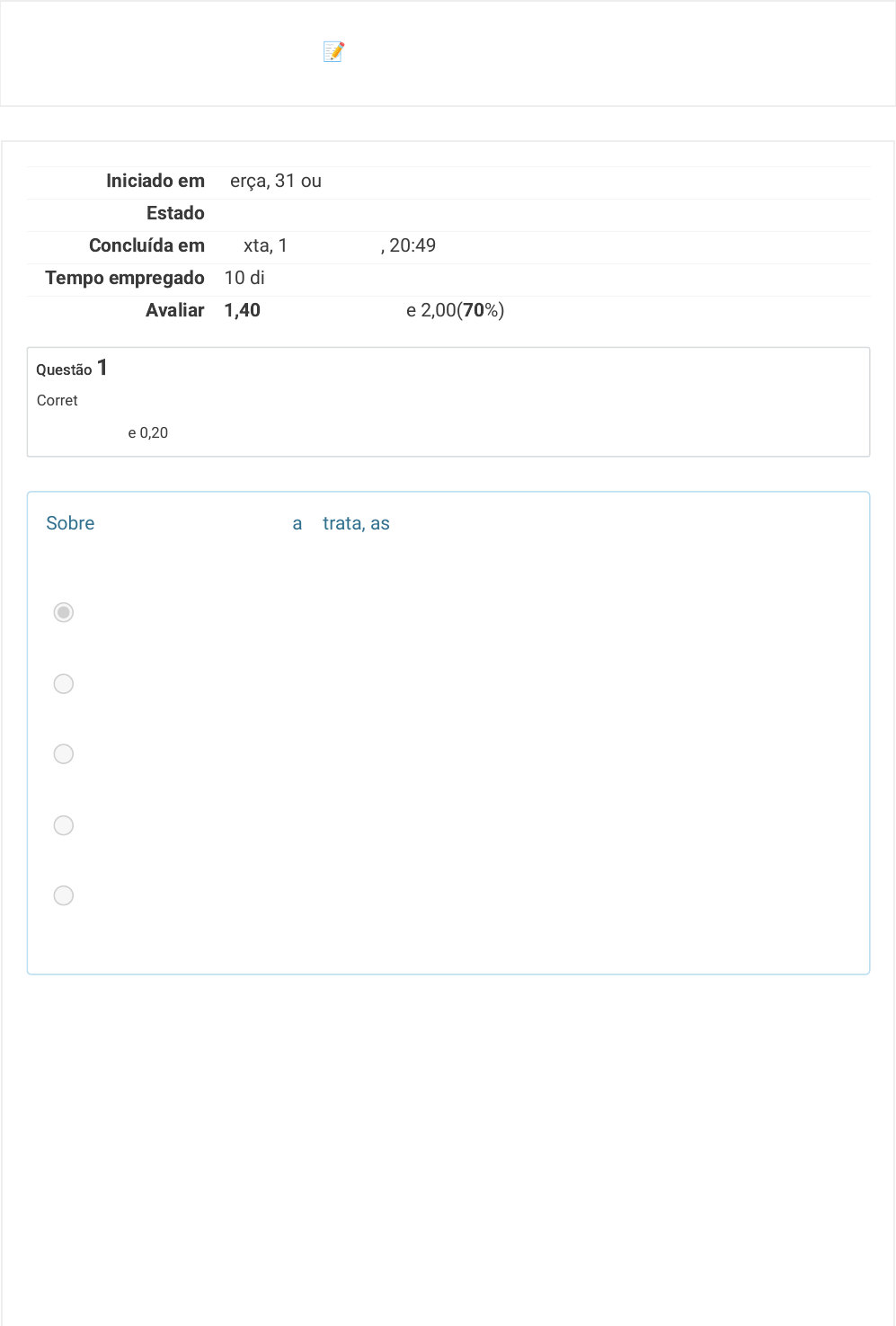 Painel / Meus cursos / VBETC / 📝 AVALIAÇÕES 2023/4 / ATIVIDADE ONLINE 1 - AV12023/4 Iniciado em terça, 31 out 2023, 15:43 Estado Finalizada Concluída em sexta, 10 nov 2023, 20:49 Tempo empregado 10 dias 5 horas Avaliar 1,40 de um máximo de 2,00(70%) Questão 1 Correto Atingiu 0,20 de 0,20 Sobre a maquiagem artística abstrata, assinale a resposta correta: Escolha uma opção: a. A maquiagem artística abstrata apresenta uma linguagem separada, livre. O foco apresenta-se na maquiagem e somente na maquiagem em si.  b. A maquiagem artística abstrata apresenta uma linguagem conjunta, livre. O foco apresenta-se nas cores e somente nas cores em si. c. A maquiagem artística abstrata apresenta uma linguagem separada, livre. Deve-se contextualizar com cenário, obra e personalidade do maquiado. d. A maquiagem artística abstrata apresenta uma linguagem separada, livre. O foco apresenta-se no cenário e somente no cenário em si. e. A maquiagem artística abstrata apresenta uma linguagem regrada, presa. O foco apresenta-se na imagem e somente na imagem em si. https://moodle.ead.unifcv.edu.br/my/ https://moodle.ead.unifcv.edu.br/my/ https://moodle.ead.unifcv.edu.br/course/view.php?id=2658 https://moodle.ead.unifcv.edu.br/course/view.php?id=2658#section-6 https://moodle.ead.unifcv.edu.br/mod/quiz/view.php?id=146739 Questão 2 Incorreto Atingiu 0,00 de 0,20 Existem importantes contra indicações que impedem o cliente de ser submetido ao processo de micropigmentação ou, ainda, fatores que impedem um resultado plenamente satisfatório. Dentre eles estão tabagismo, gestação e diabetes. Assinale a opção que justifica corretamente as contraindicações e os fatores apontados acima, na ordem correta. Escolha uma opção: a. O tabagismo provoca isquemia e anemia, além de que a tonalidade diferente da pele pode interferir no balanço de cor do pigmento; as alterações hormonais causadas pela gestação podem interferir na sensibilidade e fixação do pigmento; na diabetes, a trepidação causada pelo excesso de açúcar acelera a absorção do produto na pele. b. O tabagismo prolonga o processo cicatricial, e a tonalidade diferente da pele pode influenciar no balanço do pigmento; as alterações hormonais causadas pela gestação podem interferir na sensibilidade e fixação do pigmento; na diabetes, a trepidação acelera a absorção do produto na pele. c. No tabagismo, o balanço da cor do pigmento pode ser desuniforme devido à tonalidade diferente da pele; durante a gestação, o sistema imune e enérgico debilitado dificulta a formação de novas fibras de colágeno e degradação de antigas; o excesso de açúcar disponível na circulação de quem tem diabetes deixa o processo de recuperação deficiente.  d. No tabagismo, o tecido irregular pode ter fixação e coloração desuniformes, o que pode influenciar no balanço de cor do pigmento; durante a gestação, o sistema imune e enérgico debilitado deixam o processo de recuperação deficiente; o excesso de açúcar disponível na circulação de quem tem diabetes dificulta o processo de regeneração tecidual. e. No tabagismo, a carga de radicais livres atrapalha o processo de cicatrização, e a tonalidade diferente da pele pode influenciar no balanço do pigmento; durante a gestação, as alterações hormonais podem interferir na sensibilidade e fixação do pigmento; no caso de diabetes, a glicação não enzimática dificulta o processo de regeneração tecidual. Questão 3 Correto Atingiu 0,20 de 0,20 O formato do rosto é determinado pela estrutura óssea. No visagismo, é de suma importância reconhecer esses formatos, pois são eles que indicam o estilo de cabelo e maquiagem mais adequado a cada pessoa. De acordo com os formatos de rosto apresentados, assinale a alternativa correta. Escolha uma opção: a. Pode-se classificar o rosto de cada pessoa em apenas um dos formatos básicos, que são oval, redondo, retangular, quadrado, hexagonal com base reta, hexagonal com lateral reta, triangular, triangular invertido e losangular. b. Existem seis formatos básicos de rosto: oval, redondo, retangular, quadrado, triangular invertido e losangular. c. Para analisar um rosto, os pontos principais a serem observados são: espessura dos lábios, tamanho do nariz e formato dos olhos. d. O rosto quadrado possui poucos ângulos. É angelical ou infantil e é caracterizado por testa e queixo menores que nos rostos ovais, olhos mais espaçados, linha do cabelo arredondada e formatos dos olhos e do nariz arredondados. e. Há pessoas cujo rosto cabe perfeitamente dentro das formas geométricas, porém muitos rostos são mais complexos, contendo uma variedade de formatos.  Questão 4 Correto Atingiu 0,20 de 0,20 A linguagem visual é uma forma primitiva e universal de comunicação. É por meio dela que a imagem é processada e passa uma mensagem, portanto, é essencial conhecer e entender como ela funciona organicamente, e, assim, criar uma base científica para realizar a criação de uma imagem pessoal harmônica e despadronizada conscientemente. Sabendo da importância da linguagem visual, como é o processo cerebral que ocorre durante essa comunicação? Escolha uma opção: a. O tálamo processa a imagem e ativa os símbolos arquétipos. b. A emoção é percebida antes de o córtex processar a imagem racionalmente.  c. O conjunto visual não tem ligação com a percepção emocional. d. O córtex processa os símbolos arquétipos e os transforma em emoções. e. O conjunto visual capta os símbolos arquétipos e o tálamo dispara as emoções. Questão 5 Correto Atingiu 0,20 de 0,20 A principal substância encontrada em cabelos, pelos e cílios é a queratina, formada por aminoácidos responsáveis pela solidez e pela insolubilidade. A queratina mantém sua estrutura modelada e fixa por meio de ligações químicas. Durante o processo de atuação do produto de permanente ou de transformação da técnica de lash lifting, as pon
