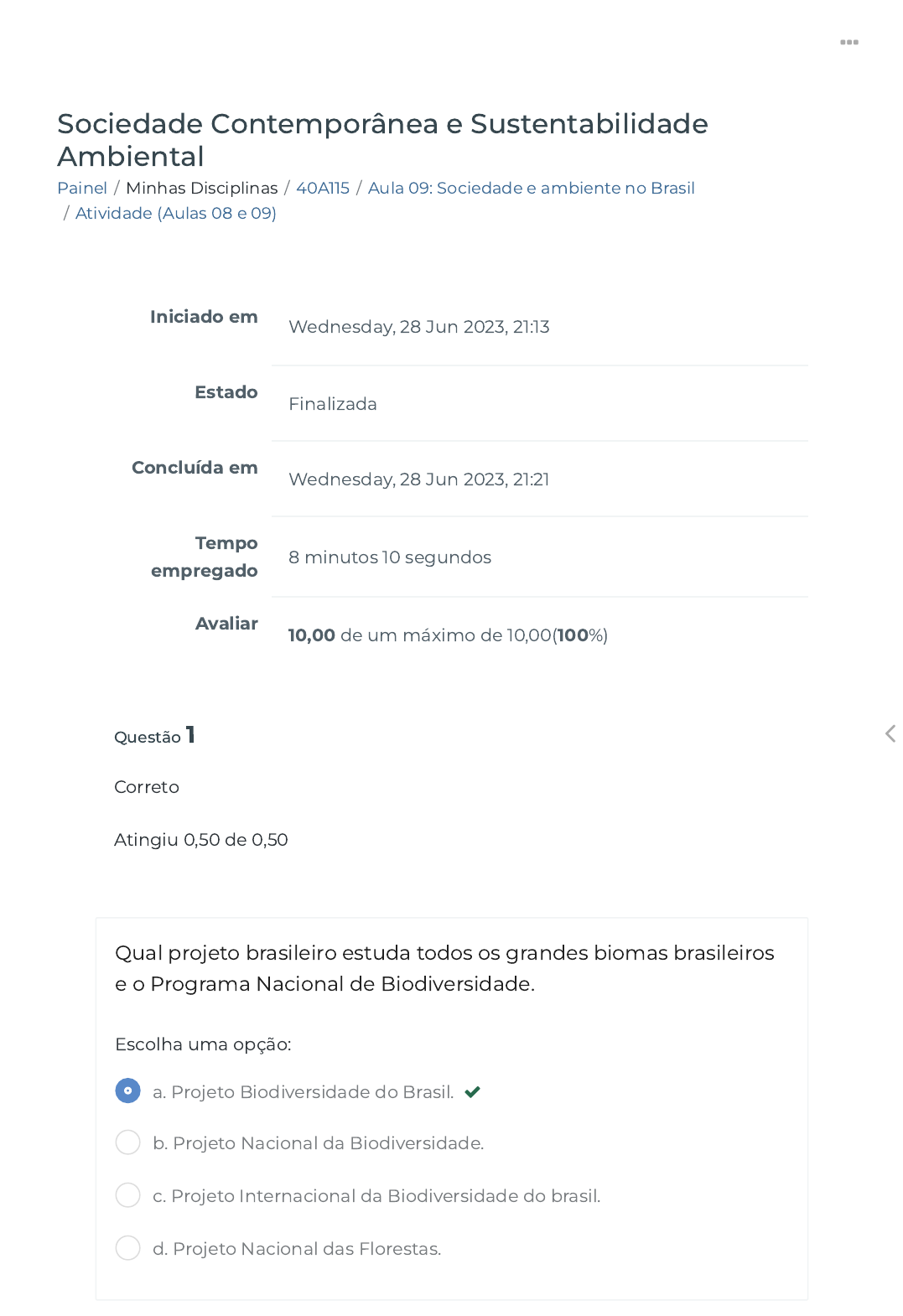 Painel / Minhas Disciplinas / 40A115 / Aula 09: Sociedade e ambiente no Brasil / Atividade (Aulas 08 e 09) Sociedade Contemporânea e Sustentabilidade Ambiental Iniciado em Wednesday, 28 Jun 2023, 21:13 Estado Finalizada Concluída em Wednesday, 28 Jun 2023, 21:21 Tempo empregado 8 minutos 10 segundos Avaliar 10,00 de um máximo de 10,00(100%) Questão 1 Correto Atingiu 0,50 de 0,50 Qual projeto brasileiro estuda todos os grandes biomas brasileiros e o Programa Nacional de Biodiversidade. Escolha uma opção: a. Projeto Biodiversidade do Brasil. b. Projeto Nacional da Biodiversidade. c. Projeto Internacional da Biodiversidade do brasil. d. Projeto Nacional das Florestas. https://ava.politecnicabr.com.br/my/ https://ava.politecnicabr.com.br/course/view.php?id=1057 https://ava.politecnicabr.com.br/course/view.php?id=1057#section-10 https://ava.politecnicabr.com.br/mod/quiz/view.php?id=33429 https://ava.politecnicabr.com.br/ Questão 2 Correto Atingiu 0,50 de 0,50 Assine a alternativa que corresponde ao princípio da justiça social. Escolha uma opção: a. tem como princípios à ideia de preservação da natureza, muito mais amplos em termos de direitos e reivindicações. Entre esses princípios, pode-se apontar, além da ecologia, a questão da responsabilidade ou justiça social, a democracia direta ou participativa e a não violência. b. emerge paulatinamente, de um movimento considerado “apolítico”, uma nova teorização política, ou uma nova forma e um novo conteúdo do poder, que se opõem ao sistema político tradicional. c. visa a atenuar os efeitos da economia sobre a natureza e sobre os mais pobres, que indiretamente são levados a degradar o ambiente para sobreviver. d. rejeitam o sistema político existente e propugnam políticas participativas e descentralizadas. https://ava.politecnicabr.com.br/ Questão 3 Correto Atingiu 0,50 de 0,50 Marque a alternativa correta. Escolha uma opção: a. Ecologia profunda - Para esta corrente, a degradação ambiental é vista como diretamente ligada ao capitalismo. b. Ecossocialismo/ecomarxismo – é um enfoque preponderantemente biocêntrico, mas in�uenciado por religiões orientais e ocidentais, aproximando-se frequentemente de uma quase adoração da natureza. c. Ecologia social - Decorre da crítica interna dos marxistas ao marxismo clássico, a partir da década de 1960, referente à concepção do mundo natural. d. Ecologia social - sob um enfoque ecocêntrico, considera o equilíbrio e a integridade da biosfera como um �m em si mesmo e que o homem deve mostrar respeito à natureza. https://ava.politecnicabr.com.br/ Questão 4 Correto Atingiu 0,50 de 0,50 A Eco-92 teve como principais objetivos: I. identi�car estratégias regionais para ações referentes às principais questões ambientais; II. examinar a situação ambiental do mundo e as mudanças ocorridas depois da Conferência de Estocolmo; III. examinar estratégias de promoção de desenvolvimento sustentado e de eliminação da pobreza nos países em desenvolvimento. Assinale a alternativa correta. Escolha uma opção: a. Apenas a III. b. Apenas a II. c. I e III. d. I e II. e. II e III. https://ava.politecnicabr.com.br/ Questão 5 Correto Atingiu 1,00 de 1,00 Marque (V) Verdadeiro ou (F) Falso: ( ) Depleção: estado ou condição de esgotamento dos recursos naturais provocado por excessiva perda de matéria. ( ) Em 1989, ganhou destaque na mídia internacional o grave problema do desmatamento. ( ) A Constituição de 1988 é considerada uma das legislações mais avançadas sobre o meio ambiente, embora muito dos seus princípios ainda não sejam cumpridos na prática. ( ) Em 1989, o governo federal criou um programa de defesa do complexo de ecossistemas da Amazônia Legal, denominado Programa Salve a Natureza. Escolha uma opção: a. F, V, V, F. b. V, F, V, F. c. F, F, F, F. d. V, V, V, F. e. F, F, F, V. https://ava.politecnicabr.com.br/ Questão 6 Correto Atingiu 0,50 de 0,50 A Eco-92 mobilizou o movimento ambientalista local e vários setores da sociedade no período que antecedeu a sua realização. Tendo como uns dos objetivos: Escolha uma opção: a. nenhuma das alternativas estão corretas. b. examinar a situação ambiental do mundo e as mudanças ocorridas depois da Conferência das nações unidas. c. analisar as estratégias globais para ações referentes às principais questões ambientais. d. identi�car estratégias regionais e globais para ações referentes às principais questões ambientais. https://ava.politecnicabr.com.br/ Questão 7 Correto Atingiu 1,00 de 1,00 Marque (V) Verdadeiro ou (F) Falso: ( ) Os “guerreiros do arco-íris”, inimigos do modelo de desenvolvimento que ignora os seus efeitos sobre a vida no planeta, desenvolvem suas ações em torno do princípio da sustentabilidade ambiental e possuem uma rede de escritórios na América do Norte, na América Latina, na Europa e na região do Pací�co. ( ) Em 1976, José Lutzemberger (que mais tarde seria ministro do Meio Ambiente, no governo Collor) lançou o Manifesto ecológico brasileiro: o �m do futuro (1976), representando dez organizações ecologistas. ( ) A complexidade da questão ambiental no Brasil começou a ser internalizada pelos diversos atores sociais somente no �nal da década de 1980. ( ) Tecnocracia: sistema de organização política e social fundado na supremacia de técnicos que buscam apenas soluções técnicas ou racionais para os problemas, sem levar em conta aspectos humanos ou sociais. Escolha uma opção: a. F, V, V, V. b. V, V, F, V. c. V, V, F, F. d. F, F, F, F. e. V, F, F, V. https://ava.politecnicabr.com.br/ Questão 8 Correto Atingiu 0,50 de 0,50 Ao se tratar de Política qual autor fez essa seguinte observação: ¨... Mesmo quando as pessoas, decepcionadas e desiludidas com o mal uso que se faz do poder político, recusam-se a ouvir falar em política ou a participar de atividades sociais que possam ter �nalidade ou cunho político, ai