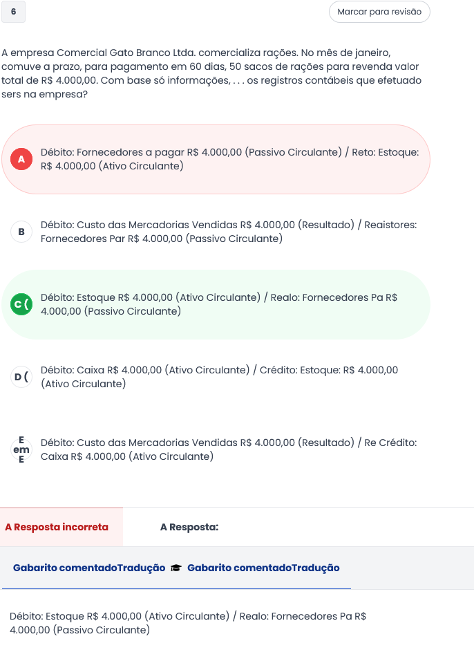 Débito: Estoque R$ 4.000,00 (Ativo Circulante) / Reglo: Fornecedores Pa R$ 4.000,00 (Passivo Circulante) Débito: Fornecedores a pagar R$ 4.000,00 (Passivo Circulante) / Reto: A R$ 4.000,00 (Ativo Circulante) Débito: Custo das Mercadorias Vendidas R$ 4.000,00 (Resultado) / Registores: Fornecedores Par R$ 4.000,00 (Passivo Circulante) Débito: Caixa R$ 4.000,00 (Ativo Circulante) / Crédito: Estoque: R$ 4.000,00 (Ativo Circulante) Débito: Custo das Mercadorias Vendidas R$ 4.000,00 (Resultado) / Re Crédito: em E Caixa R$ 4.000,00 (Ativo Circulante)