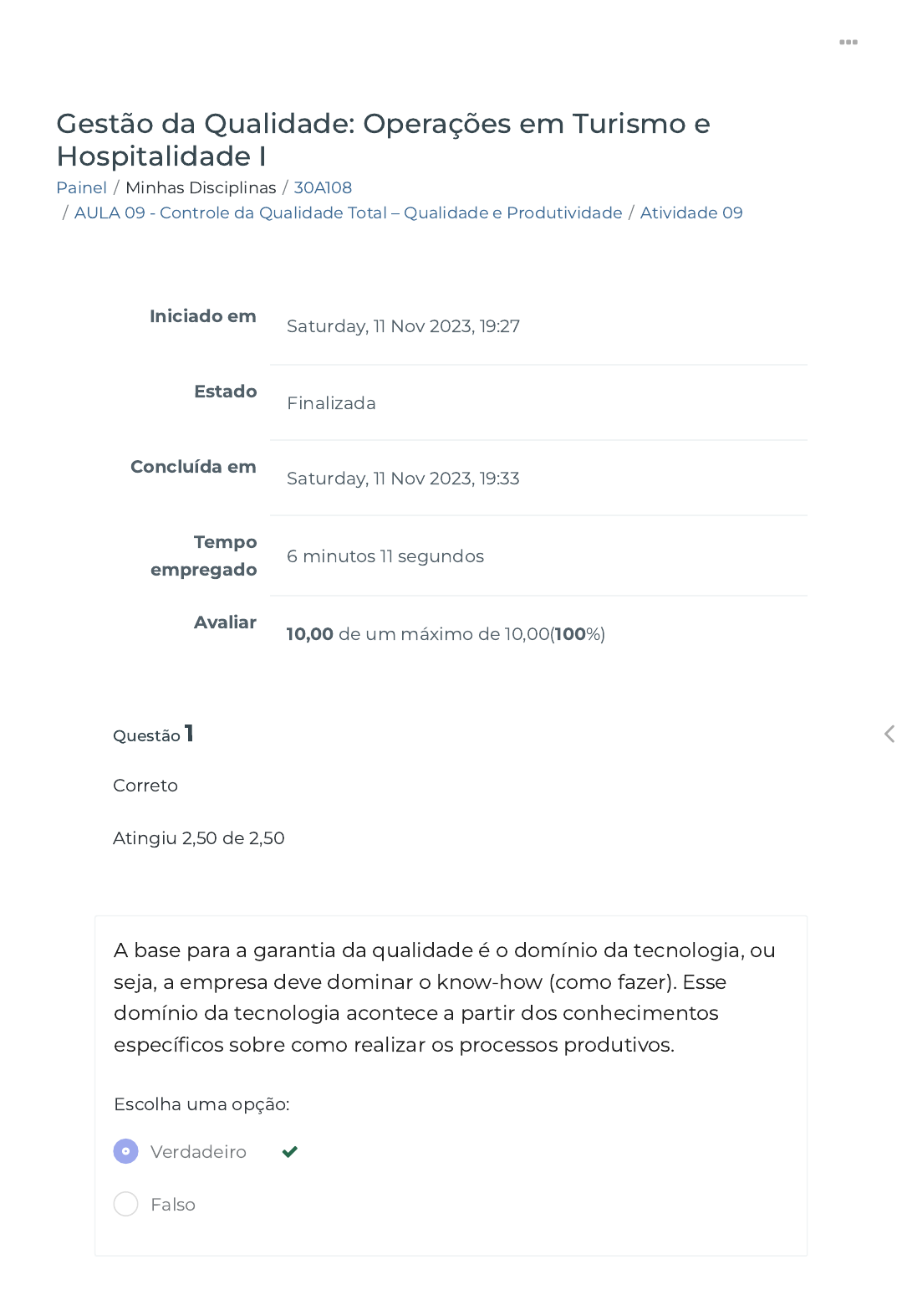 11/11/2023, 19:34 Atividade 09 https://ava.politecnicabr.com.br/mod/quiz/review.php?attempt=5891481 1/4 Painel / Minhas Disciplinas / 30A108 / AULA 09 - Controle da Qualidade Total – Qualidade e Produtividade / Atividade 09 Gestão da Qualidade: Operações em Turismo e Hospitalidade I Iniciado em Saturday, 11 Nov 2023, 19:27 Estado Finalizada Concluída em Saturday, 11 Nov 2023, 19:33 Tempo empregado 6 minutos 11 segundos Avaliar 10,00 de um máximo de 10,00(100%) Questão 1 Correto Atingiu 2,50 de 2,50 A base para a garantia da qualidade é o domínio da tecnologia, ou seja, a empresa deve dominar o know-how (como fazer). Esse domínio da tecnologia acontece a partir dos conhecimentos especí�cos sobre como realizar os processos produtivos. Escolha uma opção: Verdadeiro Falso https://ava.politecnicabr.com.br/my/ https://ava.politecnicabr.com.br/my/ https://ava.politecnicabr.com.br/course/view.php?id=1009 https://ava.politecnicabr.com.br/course/view.php?id=1009#section-10 https://ava.politecnicabr.com.br/mod/quiz/view.php?id=28484 https://ava.politecnicabr.com.br/ 11/11/2023, 19:34 Atividade 09 https://ava.politecnicabr.com.br/mod/quiz/review.php?attempt=5891481 2/4 Questão 2 Correto Atingiu 2,50 de 2,50 A qualidade está relacionada com o atendimento das necessidades das pessoas por meio da oferta de produtos e de serviços, com preço justo, que trazem baixo risco para o usuário e sejam entregues de acordo com os requisitos do cliente ou do consumidor. Escolha uma opção: Questão 3 Correto Atingiu 2,50 de 2,50 Para melhorar a produtividade, as empresas devem investir em alguns aspectos, EXCETO: Escolha uma opção: Verdadeiro Falso a. Hardware. b. Hideware. c. Humanware. d. Software. https://ava.politecnicabr.com.br/ 11/11/2023, 19:34 Atividade 09 https://ava.politecnicabr.com.br/mod/quiz/review.php?attempt=5891481 3/4 © 2022 - Escola Politécnica Brasileira Questão 4 Correto Atingiu 2,50 de 2,50 Para aumentar a produtividade, é preciso produzir cada vez mais, com cada vez menos. Para que se tenha alta produtividade, deve- se fazer certo da primeira vez, pois o retrabalho não agrega valor aos processos nem aos produtos. Escolha uma opção: Verdadeiro Falso Entre em Contato https://www.politecnicabr.com.br 0800 084 2627 0800 084 2627 Links Úteis Dicas da nossa Diretora Acadêmica Planner de Estudos Declaração de Matrícula Orientações do AVA Abertura de Ticket Fale com o Tutor Cronograma de Estudos Manual de Estágio Manual de Competência Siga-nos nas redes sociais https://ava.politecnicabr.com.br/mod/quiz/0 https://ava.politecnicabr.com.br/mod/quiz/0 https://www.politecnicabr.com.br/ https://soundcloud.com/user-501638417/sets/escola-politecnica-brasileira https://soundcloud.com/user-501638417/sets/escola-politecnica-brasileira https://storage.googleapis.com/sirius-pubstore/semestre_plannerdeestudo%20poli.pdf https://storage.googleapis.com/sirius-pubstore/semestre_plannerdeestudo%20poli.pdf https://storage.googleapis.com/sirius-pubstore/declaracao_matricula.pdf https://storage.googleapis.com/sirius-pubstore/declaracao_matricula.pdf https://storage.googleapis.com/sirius-pubstore/orientacoes_ava.pdf https://storage.googleapis.com/sirius-pubstore/orientacoes_ava.pdf https://storage.googleapis.com/sirius-pubstore/abertura_ticket.pdf https://storage.googleapis.com/sirius-pubstore/abertura_ticket.pdf https://storage.googleapis.com/sirius-pubstore/fale_com_tutor.pdf https://storage.googleapis.com/sirius-pubstore/fale_com_tutor.pdf https://storage.googleapis.com/sirius-pubstore/cronograma_estudos.pdf https://storage.googleapis.com/sirius-pubstore/cronograma_estudos.pdf https://storage.googleapis.com/sirius-pubstore/manual_estagio.pdf https://storage.googleapis.com/sirius-pubstore/manual_estagio.pdf https://storage.googleapis.com/sirius-pubstore/manual_competencia.pdf https://storage.googleapis.com/sirius-pubstore/manual_competencia.pdf https://www.facebook.com/politecnicabr https://www.instagram.com/politecnicabr_oficial https://ava.politecnicabr.com.br/ 11/11/2023, 19:34 Atividade 09 https://ava.politecnicabr.com.br/mod/quiz/review.php?attempt=5891481 4/4 https://ava.politecnicabr.com.br/