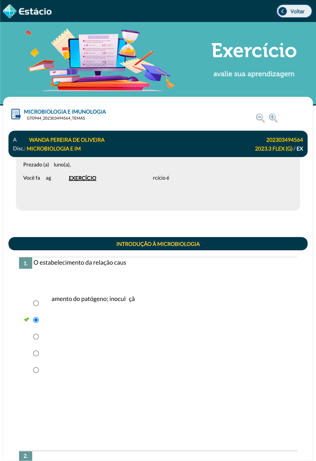 05/11/2023, 21:39 Estácio: Alunos https://simulado.estacio.br/alunos/ 1/5 Exercício avalie sua aprendizagem O estabelecimento da relação causal entre uma doença e um microrganismo somente pode ser con�rmado após uma série de etapas, conhecidas por Postulados de Koch, estabelecidos por Robert Koch (1881) para patógenos humanos e adaptados posteriormente para Fitopatologia. Marque a opção que corresponde aos Postulados de Koch. MICROBIOLOGIA E IMUNOLOGIA Lupa DGT0944_202303494564_TEMAS Aluno: WANDA PEREIRA DE OLIVEIRA Matr.: 202303494564 Disc.: MICROBIOLOGIA E IM 2023.3 FLEX (G) / EX Prezado (a) Aluno(a), Você fará agora seu EXERCÍCIO! Lembre-se que este exercício é opcional, mas não valerá ponto para sua avaliação. O mesmo será composto de questões de múltipla escolha. Após responde cada questão, você terá acesso ao gabarito comentado e/ou à explicação da mesma. Aproveite para se familiarizar com este modelo de questões que será usado na sua AV e AVS. INTRODUÇÃO À MICROBIOLOGIA 1. Isolamento do patógeno; inoculação do patógeno e reprodução dos sintomas; associação constante patógeno hospedeiro; reisolamento do patógeno. Associação constante patógeno-hospedeiro; isolamento do patógeno; inoculação do patógeno e reprodução dos sintomas; reisolamento do patógeno. Isolamento do patógeno; associação constante patógeno hospedeiro; inoculação do patógeno e reprodução dos sintomas; reisolamento do patógeno. Inoculação do patógeno e reprodução dos sintomas; associação constante patógeno- hospedeiro; reisolamento do patógeno; isolamento do patógeno. Associação constante patógeno-hospedeiro; isolamento do patógeno; reisolamento do patógeno; inoculação do patógeno e reprodução dos sintomas. Data Resp.: 05/11/2023 08:23:32 Explicação: A resposta correta é: Associação constante patógeno-hospedeiro; isolamento do patógeno; inoculação do patógeno e reprodução dos sintomas; reisolamento do patógeno. 2. javascript:voltar(); javascript:voltar(); javascript:voltar(); javascript:voltar(); javascript:diminui(); javascript:diminui(); javascript:aumenta(); javascript:aumenta(); 05/11/2023, 21:39 Estácio: Alunos https://simulado.estacio.br/alunos/ 2/5 Os organismos são organizados de acordo com sua semelhança fenotípica e relação evolutiva. Atualmente costumamos classi�car os seres vivos em sete categorias taxonômicas principais. Marque a alternativa que indica corretamente essas categorias na ordem da categoria de maior abrangência para a mais restrita: As células foram as primeiras a surgirem na terra e são as menores unidades vivas de um organismo e estão presentes em todos os seres, com exceção dos vírus. Elas podem ser classi�cadas em procarióticas e eucarióticas se levarmos em consideração a ausência ou presença: As bactérias são organismos que estão presentes desde as formas de vida mais primitivas da terra. Podem ser classi�cadas de acordo com diferentes tipos e critérios de crescimento estabelecidos. Bactérias que dependem ou não do oxigênio para seu processo de respiração durante seu desenvolvimento, passam por qual classi�cação: Domínio - �lo - ordem - classe - família - gênero - espécie. Domínio - �lo - classe - família - ordem - gênero - espécie. Domínio - classe - �lo - ordem - gênero - família - espécie. Domínio - �lo - classe - ordem - família - espécie - gênero. Domínio - �lo - classe - ordem - família - gênero - espécie. Data Resp.: 05/11/2023 08:25:53 Explicação: Assim, um conjunto de espécies semelhantes são agrupadas dentro de um mesmo gênero; gêneros semelhantes são agrupados dentro de uma mesma família; famílias semelhantes, dentro de uma mesma ordem; ordens semelhantes, dentro de uma classe; classes semelhantes, dentro de um �lo, e, por �m, �los semelhantes, dentro de um domínio. O domínio engloba todos os organismos dentro de uma hierarquia. 3. De citoplasma. De parede celular. De carioteca. De organelas celulares. De membrana plasmática. Data Resp.: 05/11/2023 08:28:31 Explicação: Não possuem um núcleo envolto por membrana nuclear, ou seja, não possuem um compartimento nuclear para abrigar seu DNA. As bactérias e arqueias são microrganismos procariotos. Eucariotos: Possuem um compartimento intracelular envolto por uma membrana, chamado núcleo, onde seu DNA é mantido. As algas, os protozoários e os fungos são eucariotos, apresentando estrutura celular igual à das células dos organismos superiores. 4. Classi�cação de Morfologia. Classi�cação de Parede celular. Classi�cação por Fermentação. Classi�cação por temperatura. Classi�cação pH. Data Resp.: 05/11/2023 08:29:23 Explicação: As bactérias podem ser classi�cadas como aeróbias (quando precisam de oxigênio para o processo de respiração), anaeróbias (quando não utilizam o oxigênio, vivendo da fermentação, respiração anaeróbia, fotossíntese ou metanogênese) ou facultativas (quando são capazes de realizar os dois tipos de metabolismo: na presença de oxigênio, realizam a respiração aeróbia e, na ausência, realizam respiração anaeróbia ou fermentação). 05/11/2023, 21:39 Estácio: Alunos https://simulado.estacio.br/alunos/ 3/5 Após o descobrimento dos microrganismos o cientista Robert Koch passou a desenvolveu uma pesquisa para provar que esses seres seriam responsáveis por algumas doenças, surgindo assim os postulados de Koch. Os postulados foram desenvolvidos para estabelecer a relação de causa e efeito de uma doença infecciosa. Em um dos postulados diz que uma célula de origem de cultura patogênica, é capaz de causar doença em um animal saudável. Qual postulado a frase está se referindo? A morfologia de uma célula é resultado da adequação ao seu habitat. Uma das principais formas de classi�cação das bactérias dá-se por meio da análise de sua morfologia. Uma bactéria que ap