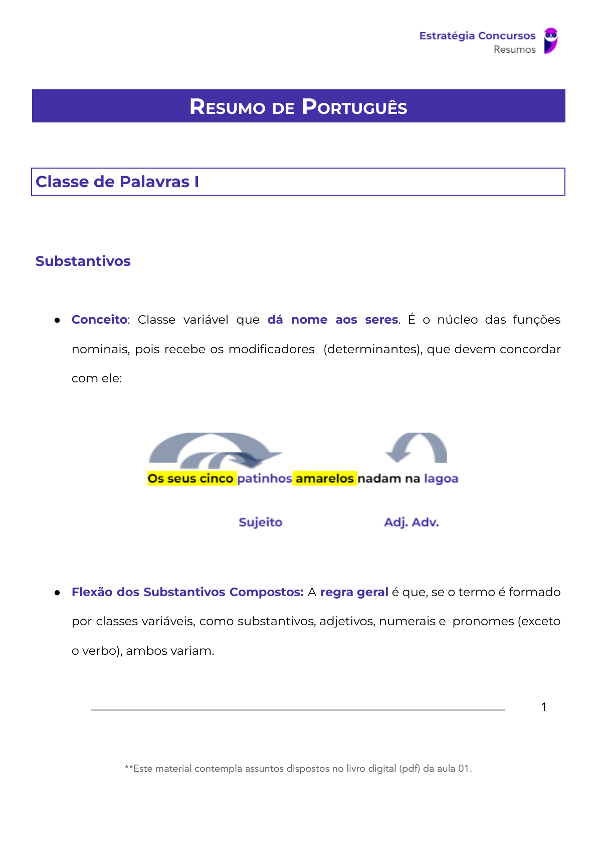 RESUMO DE PORTUGUÊS Classe de Palavras I Substantivos ● Conceito: Classe variável que dá nome aos seres. É o núcleo das funções nominais, pois recebe os modificadores (determinantes), que devem concordar com ele: ● Flexão dos Substantivos Compostos: A regra geral é que, se o termo é formado por classes variáveis, como substantivos, adjetivos, numerais e pronomes (exceto o verbo), ambos variam. 1 **Este material contempla assuntos dispostos no livro digital (pdf) da aula 01. 01392189632 - Hugo Heitor Araújo Ex: Substantivo + Substantivo: Couve-flor => Couves-flores Numeral + Substantivo: Quarta-feira => Quartas-feiras Adjetivo + Substantivo: Baixo-relevo => Baixos-relevos A segunda regra geral é que as classes invariáveis (e os verbos) não variam em número: Ex: Verbo + Substantivo: Beija-flor => Beija-flores Interjeição + Substantivo: Ave-maria => Ave-marias Se na composição de dois substantivos, o segundo for delimitador do primeiro por uma relação de semelhança ou de finalidade, ambos os substantivos podem variar, mas é comum que só o primeiro varie: Pombos-correio OU pombos-correios Salários-família OU salários-famílias Se a estrutura for “substantivo+preposição+substantivo”, apenas o primeiro item da composição se flexiona: Ex: Pé de moleque => Pés de moleque 2 **Este material contempla assuntos dispostos no livro digital (pdf) da aula 01. 01392189632 - Hugo Heitor Araújo ○ Formação de substantivos por derivação sufixal: Pescar => pescaria; Filmar => filmagem; Matar => matador; Militar => militância; ○ Formação de substantivos por derivação regressiva: Cantar => canto; Almoçar => almoço; Causar => causa... Adjetivos ● Conceito: Classe variável que se refere ao substantivo, por isso, tem função sintática de adjunto adnominal. Pode também ser predicativo. Os adjetivos podem ter valor subjetivo, quando expressam opinião; ou podem ter valor objetivo, quando atestam qualidade que é fato e não depende de interpretação. Adjetivos opinativos X Adjetivos objetivos carro bonito carro preto turista animado turista japonês 3 **Este material contempla assuntos dispostos no livro digital (pdf) da aula 01. 01392189632 - Hugo Heitor Araújo ● Substantivo + Adjetivo: efeito da mudança de ordem: ○ 1) Não muda nem a classe e nem o sentido Ex: Cão bom x Bom cão (Sub. + Adj.) (Adj. + Sub.) ○ 2) Muda o sentido sem mudar as classes: Ex: Candidato pobre x Pobre candidato (Sub. + Adj.) (Adj. + Sub.) ○ 3) Muda a classe, e muda necessariamente o sentido: Ex: Alemão comunista x Comunista alemão (Sub. + Adj.) (Sub. + Adj.) 4 **Este material contempla assuntos dispostos no livro digital (pdf) da aula 01. 01392189632 - Hugo Heitor Araújo Pronomes ● Pronomes Pessoais: Pessoas do discurso Pronomes Retos Pronomes Oblíquos 1ª pessoa do singular Eu me, mim, comigo 2ª pessoa do singular Tu te, ti, contigo 3ª pessoa do singular Ele/Ela se, si, o, a, lhe, consigo 1ª pessoa do plural Nós nos, conosco 5 **Este material contempla assuntos dispostos no livro digital (pdf) da aula 01. 01392189632 - Hugo Heitor Araújo 2ª pessoa do plural Vós vos, convosco 3ª pessoa do plural Eles/Elas se, si, os, as, lhes, consigo ○ Pronomes Pessoais Retos (eu, tu, ele, nós, vós, eles) costumam substituir o sujeito. Ex: João é magro => Ele é magro. ○ Pronomes pessoais oblíquos átonos (me, te, se, lhe, o, a, nos, vos) substituem complementos verbais: o, a, os, as substituem somente objetos diretos (complemento sem preposição); me, te, se, nos, vos podem ser objetos diretos ou indiretos (complemento com preposição), a depender da regência do verbo. Já o pronome –lhe(s) tem função somente de objeto indireto. Ex: Já lhe disse tudo. (disse a ele) Informei-o de tudo. (informei a pessoa) Você me agradou, mas não me convenceu. (agradou a mim) 6 **Este material contempla assuntos dispostos no livro digital (pdf) da aula 01. 01392189632 - Hugo Heitor Araújo Pronomes Indefinidos: Atenção à palavra “bastante”, que pode ser confundida com um advérbio: 7 **Este material contempla assuntos dispostos no livro digital (pdf) da aula 01. 01392189632 - Hugo Heitor Araújo ● Pronomes Possessivos: São eles: meu(s), minha(s), nosso(s), nossa(s), teu(s), tua(s), vosso(s), vossa(s), seu(s), sua(s). ● Pronomes Demonstrativos: Pronomes demonstrativos apontam, demonstram a posição dos elementos a que se referem no tempo, no espaço e no texto. Ex: Este, Esse, Isto, Aquilo, O (e flexões). ● Referência Anafórica e Catafórica do Pronome: Quando um pronome retoma algo que já foi mencionado antes, dizemos que tem função anafórica. Quando anuncia ou se refere a algo que ainda está para ser dito, tem função catafórica. Ex: Não gosto de estudar. Apesar disso, estudei muito. Eu só pensava nisto: passar no concurso. 8 **Este material contempla assuntos dispostos no livro digital (pdf) da aula 01. 01392189632 - Hugo Heitor Araújo As palavras o, a, os, as também podem ser pronomes demonstrativos, geralmente quando antecedem um pronome relativo. Veja: Ex: Quero o que está em promoção. (aquilo) Ex: Comprei as camisas que você me pediu. (aquelas) Ex: Entre as cuecas, comprei a de algodão. (aquela) Ex: Sabia que devia estudar, mas não o fiz. (isso) ● Pronomes Relativos: Variáveis Invariáveis Masculinos Femininos quem o qual (os quais) a qual (as quais) que cujo (cujos) cuja (cujas) onde quanto (quantos) quanta (quantas) 9 **Este material contempla assuntos dispostos no livro digital (pdf) da aula 01. 01392189632 - Hugo Heitor Araújo ○ O pronome “quem” sempre se refere a pessoa ou ente personificado e sempre é precedido por preposição. Ex: Essa é a pessoa a quem me referi. Ex: Essa é a pessoa de quem falei. ○ O pronome “cujo” tem como principais características: ✓ Indicar posse e sempre vir entre dois substantivos, possuidor e possuído; ✓ Não poder ser seguido nem precedido de artigo, mas poder ser an