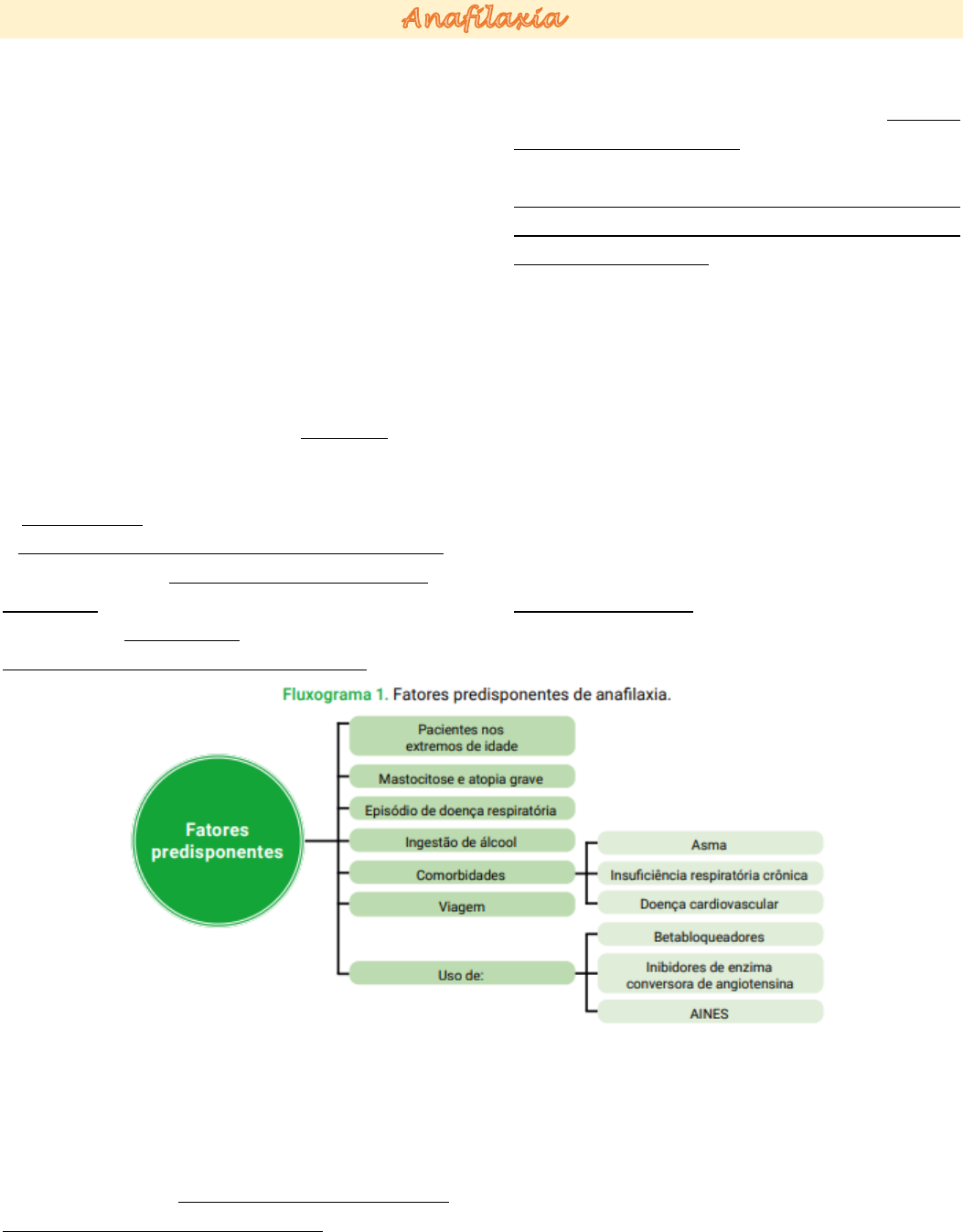 Natalia Quintino Dias A anafilaxia é uma reação multissistêmica grave de início agudo e potencialmente fatal. Apresenta-se com as seguintes manifestações clínicas: ● urticária; ● angioedema; ● comprometimento respiratório e gastrointestinal; ● hipotensão arterial. A ocorrência de 2 ou mais sintomas, imediatamente após a exposição a um alérgeno suspeito, alerta para o diagnóstico e a necessidade do tratamento imediato. Na faixa etária pediátrica, os alimentos estão relacionados com frequentes casos de anafilaxia, e são os principais desencadeantes. ● Nos lactentes, os alimentos mais implicados são o leite e os seus derivados, seguidos de amendoim, nozes, soja e ovos. Nos pré-escolares e escolares, o amendoim torna-se mais importante, ao lado das nozes. Já nos adolescentes, temos como destaque amendoim, nozes, peixes e frutos do mar. A segunda causa mais importante de anafilaxia na Pediatria é a hipersensibilidade ao veneno de insetos da ordem Hymenoptera, como abelhas, marimbondos e formigas. Em seguida, os medicamentos, principalmente os antibióticos (betalactâmicos, quinolonas e vancomicina) e os Anti-Inflamatórios Não Hormonais (AINES). Os coloides, os radiocontrastes, os opiáceos e o látex também estão envolvidos com reações anafiláticas, principalmente em situações perioperatórias. A principal causa de morte, nos casos mais graves, é o choque proveniente da intensa vasodilatação e da redistribuição do volume circulante. A segunda maior causa é a parada respiratória secundária ao broncoespasmo ou à obstrução pelo edema de vias aéreas superiores. Em cerca de 25% dos casos de anafilaxia, o agente causador não é identificado e tem-se a chamada anafilaxia idiopática. Na maioria das vezes, a anafilaxia é desencadeada por mecanismo imunologicamente mediado pela imunoglobulina E (IgE) contra os mais variados antígenos. Outros mecanismos imunológicos; entretanto, também podem estar relacionados, como no caso de reações por imunocomplexos circulantes a produtos biológicos. Em poucos casos, a anafilaxia se relaciona com mecanismos não imunológicos, sendo o mais comum a ativação direta de mastócitos. Os componentes do sistema complemento também podem estar envolvidos, assim como leucotrienos, prostaglandinas, cininas, fatores de coagulação e da fibrinólise. Independentemente do fator etiológico, o quadro clínico e os mediadores químicos envolvidos são similares. Natalia Quintino Dias As manifestações clínicas costumam surgir entre 5 e 10 minutos após a exposição ao alérgeno desencadeante, mas, algumas vezes, esse intervalo pode ser maior. O espectro das manifestações é muito amplo, pode ocorrer desde reações leves até graves e potencialmente fatais. O início, normalmente, é súbito, ocorre em segundos/minutos, podendo ocorrer até horas após a exposição ao agente causal. As reações bifásicas estão relacionadas com maior intensidade dos sintomas por volta de 8 a 12 horas após o início do quadro agudo inicial e podem ocorrer em cerca de 10% dos casos. Por conta disso, é importante manter o paciente em observação na unidade de saúde por um período Natalia Quintino Dias mínimo de 6 a 8 horas, para casos leves, e de 24 a 48h, para os casos graves. É eminentemente clínico. A anamnese realizada dever ser breve e focada nos seguintes aspectos: agente suspeito, via de administração, dose, sequência dos sintomas, tempo para início dos sintomas, história de episódio prévio, uso de medicações, condutas tomadas após o início do quadro e diagnóstico prévio de alguma alergia. O diagnóstico é clínico, pela presença de, pelo menos, 1 dos critérios: ● Início agudo (minutos a horas) com envolvimento de pele, mucosa ou ambos. E pelo menos um dos seguintes: a) comprometimento respiratório (dispneia, broncoespasmo, estridor, hipóxia); b) redução da Pressão Arterial (PA) ou sintomas de disfunção de órgãos-alvo (hipotonia, colapso, síncope). ● Duas ou mais das seguintes situações que ocorrem rapidamente após a exposição a um alérgeno provável: a) envolvimento mucocutâneo (urticária generalizada, prurido, rubor, edema de lábios/língua); b) comprometimento respiratório (dispneia, broncoespasmo, estridor, hipoxemia); c) redução da pressão arterial ou sintomas associados (hipotonia, colapso, síncope); d) sintomas gastrointestinais persistentes (cólicas abdominais recorrentes e vômitos). ● Hipotensão após exposição a alérgeno conhecido para aquele paciente. Em crianças: PA baixa para a idade, ou queda de 30% na PA sistólica. Em adolescentes: PA 30% na PA sistólica. Exames complementares o diagnóstico da anafilaxia é clínico, mas algumas alterações laboratoriais podem ser observadas, como o aumento nos níveis séricos de triptase e histamina. Para a confirmação da etiologia, são necessários exames complementares que, no momento do quadro anafilático agudo, podem estar negativos. A dosagem da imunoglobulina E (IgE) sérica total ou específica para um alérgeno pode estar normal no momento da reação; por isso, só deve ser realizada em um momento oportuno ambulatorialmente. Diagnóstico diferencial Deve ser feito com a reação vasovagal, que é uma frequente causa de confusão diagnóstica; entretanto, na reação vasovagal, tem-se: sudorese, náusea, hipotensão e bradicardia. Enquanto na anafilaxia, tem-se taquicardia, ocorrendo bradicardia apenas em casos pré-falência cardiorrespiratória. Na reação vasovagal não haverá o acometimento cutâneo, como urticária e angioedema. Outras doenças menos frequentes: exacerbação de asma, angioedema hereditário, feocromocitoma, mastocitose sistêmica, ansiedade/crise de pânico, entre outras. A conduta médica não deve ser retardada devido à ampla variedade de possíveis diagnósticos diferenciais. A anafilaxia pode ser fatal e, diante de uma suspeita, a conduta deve ser tomada imediat