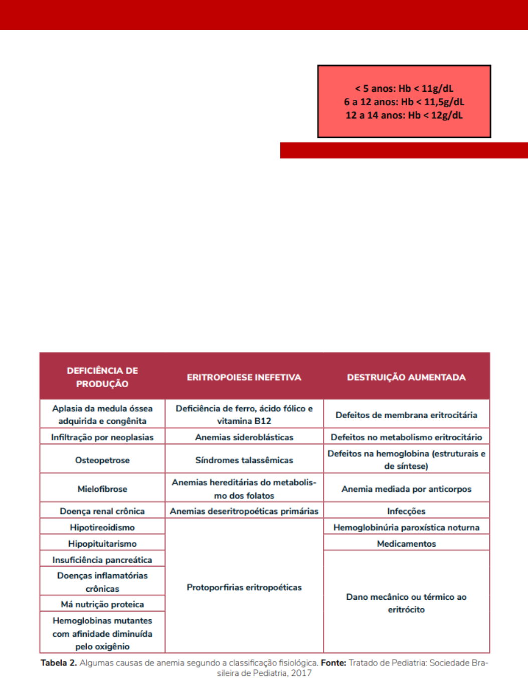 Anemia - pediatria A anemia é a condição na qual a concentração sanguínea de hemoglobina (Hb) se encontra abaixo dos valores esperados, tornando-se insuficiente para atender as necessidades fisiológicas exigidas de acordo com idade, sexo, gestação e altitude. De origem multifatorial, pode ser ocasionada pela deficiência de ferro e/ou diversos outros micronutrientes, por perdas sanguíneas, processos infecciosos e patológicos concomitantes, uso de medicações específicas que impeçam ou prejudiquem a absorção do ferro. A principal causa de anemia é a deficiência de ferro, estando associada a mais de 60% dos casos em todo o mundo. Calcula-se que quase dois bilhões de pessoas em todo o mundo apresentam anemia e que de 27% a 50% da população seja afetada pela deficiência de ferro. Mesmo acometendo todos os grupos etários e níveis sociais, com ampla distribuição geográfica, a anemia ferropriva ainda é uma doença que atinge prioritariamente as camadas socialmente menos favorecidas, de menor renda e desenvolvimento. Classificação As anemias podem ser classificadas do ponto de vista fisiológico e morfológico. Muitas vezes mais de um mecanismo pode estar envolvido. A anemia pode ser categorizada do ponto de vista fisiológico em: • Alterações na produção efetiva dos eritrócitos: a taxa de produção está diminuída ou a produção é inefetiva; • Distúrbios em que há destruição ou perda de eritrócitos. Já a classificação morfológica baseia-se no volume corpuscular médio (VCM), segundo o qual as anemias podem ser divididas em: • Microcíticas: VCM abaixo do normal para sexo e idade; • Macrocíticas: VCM acima do valor esperado para sexo e idade; • Normocítica: VCM dentro dos valores da normalidade. Características dos pacientes As causas de anemia em crianças variam com base na idade do paciente, sexo, raça e etnia. Idade Nascimento aos 3 meses: A causa mais comum é a “anemia fisiológica”, que ocorre aproximadamente entre 6-9 semanas de idade. A eritropoiese diminui drasticamente após o nascimento como resultado do aumento da oxigenação tecidual e da produção reduzida de eritropoietina. Em bebês saudáveis, os níveis de hemoglobina são altos (> 14 g/dL) ao nascer e diminuem rapidamente, atingindo um nadir de aproximadamente 11 g/dL entre 6-9 semanas de idade, o que é chamado de “anemia fisiológica da infância. A anemia patológica em recém-nascidos e bebês jovens é diferenciada da anemia fisiológica por qualquer um dos seguintes critérios: • Anemia no 1º mês de vida; • Anemia com nível mais baixo de Hb do que é normalmente observado com anemia fisiológica, ou seja, Hb < 9 g / dL; • Sinais de hemólise (ex: icterícia ou urina escura) ou sintomas de anemia (ex: irritabilidade ou má alimentação). As causas comuns de anemia patológica em recém- nascidos incluem perda de sangue, doença hemolítica (incompatibilidade Rh ou ABO), infecção congênita, transfusão gemelo-gemelar e anemia hemolítica congênita. 3 a 6 meses: A anemia detectada entre os 3 e 6 meses de idade sugere uma hemoglobinopatia. A deficiência nutricional de ferro é uma causa improvável de anemia antes dos 6 meses de idade em bebês a termo. Bebês maiores de 6 meses, crianças e adolescentes: Em bebês, crianças mais velhas e adolescentes, as causas adquiridas de anemia são mais prováveis, principalmente a anemia por deficiência de ferro. Sexo Algumas causas hereditárias de anemia estão ligadas ao X e ocorrem mais comumente em homens. Nas meninas após a menarca, o sangramento menstrual excessivo é uma causa importante de anemia. Raça e etnia • Hemoglobina S e C: populações negras e hispânicas • Síndromes talassêmicas: Mediterrâneo e sudeste asiático • Deficiência de G6PD: judeus, filipinos, gregos, sardos, curdos e negros Diagnóstico Anamnese + exame físico + exames laboratoriais A presença das manifestações clínicas está relacionada à velocidade e à intensidade de instalação da anemia, à idade em que a anemia ocorre e à curva de dissociação do oxigênio da hemoglobina. A maioria das crianças com anemia leve não apresenta sinais ou sintomas. Algumas crianças podem apresentar sinais/sintomas gerais, como palidez das mucosas, fadiga, cansaço, anorexia e irritabilidade. Dependendo da intensidade e da velocidade de instalação da anemia, ocorre hipercinese circulatória, com taquicardia, pulso amplo, cardiomegalia e presença de sopro sistólico. Anamnese A avaliação de uma criança com anemia começa com uma história completa. O grau de sintomas, o histórico médico pregresso, o histórico familiar, o histórico alimentar e o histórico de desenvolvimento podem fornecer pistas importantes para a causa da anemia. - Avaliar início e gravidade dos sintomas. - Alterações na cor da urina ou icterícia podem indicar a presença de distúrbio hemolítico. - Perguntar sobre possível sangramento. - Histórico médico pregresso; história do nascimento; histórico de anemia. - Exposição a drogas e toxinas. - História familiar. - História alimentar (focar na avaliação da ingestão de ferro, folato e vitamina B12). Introdução de leite de vaca antes do 1º ano de vida sugere anemia por deficiência de ferro. Pica (particularmente pagofagia) pode sugerir envenenamento por chumbo e/ou deficiência de ferro. - História do desenvolvimento. Exame físico Um foco particular deve ser direcionado ao exame da pele, olhos, boca, fácies, tórax, mãos e abdome. A palidez é avaliada examinando os locais onde os leitos capilares são visíveis ex: conjuntiva, palma e unha). PELE • Hiperpigmentação: anemia de Fanconi; • Púrpura, petéquia: anemia hemolítica autoimune com trombocitopenia, síndrome hemolítico-urêmica, aplasia de medula óssea e infiltração da medula óssea; • Carotenemia (coloração amaerelada da pele): suspeita de deficiência de ferro em bebês; • Icterícia: an