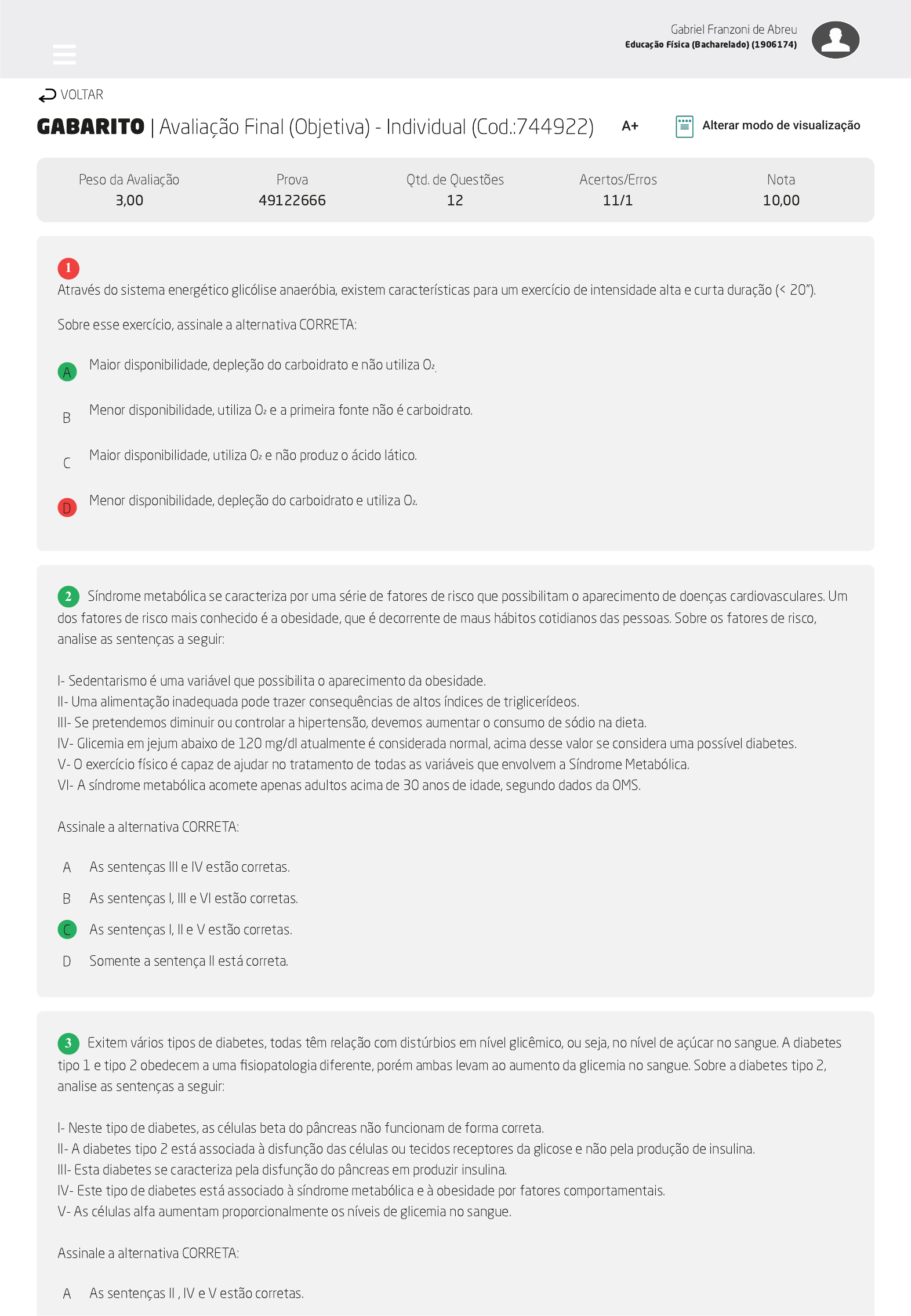 08/11/2023, 12:55 AVA https://ava2.uniasselvi.com.br/subject/grades-and-tests/answer-book/eyJ0ZXN0Ijp7InRlc3RDb2RlIjoiNzQ0OTIyIiwiZGVzY3JpcHRpb24iOiJBdmFsaWHDp8OjbyBGaW5hbCAoT2JqZXRpdmEpIC0gSW5kaXZpZHVhb… 1/4 GABARITO | Avaliação Final (Objetiva) - Individual (Cod.:744922) Peso da Avaliação 3,00 Prova 49122666 Qtd. de Questões 12 Acertos/Erros 11/1 Nota 10,00 Através do sistema energético glicólise anaeróbia, existem características para um exercício de intensidade alta e curta duração (< 20”). Sobre esse exercício, assinale a alternativa CORRETA: A Maior disponibilidade, depleção do carboidrato e não utiliza O B Menor disponibilidade, utiliza O e a primeira fonte não é carboidrato. C Maior disponibilidade, utiliza O e não produz o ácido lático. D Menor disponibilidade, depleção do carboidrato e utiliza O . Síndrome metabólica se caracteriza por uma série de fatores de risco que possibilitam o aparecimento de doenças cardiovasculares. Um dos fatores de risco mais conhecido é a obesidade, que é decorrente de maus hábitos cotidianos das pessoas. Sobre os fatores de risco, analise as sentenças a seguir: I- Sedentarismo é uma variável que possibilita o aparecimento da obesidade. II- Uma alimentação inadequada pode trazer consequências de altos índices de triglicerídeos. III- Se pretendemos diminuir ou controlar a hipertensão, devemos aumentar o consumo de sódio na dieta. IV- Glicemia em jejum abaixo de 120 mg/dl atualmente é considerada normal, acima desse valor se considera uma possível diabetes. V- O exercício físico é capaz de ajudar no tratamento de todas as variáveis que envolvem a Síndrome Metabólica. VI- A síndrome metabólica acomete apenas adultos acima de 30 anos de idade, segundo dados da OMS. Assinale a alternativa CORRETA: A As sentenças III e IV estão corretas. B As sentenças I, III e VI estão corretas. C As sentenças I, II e V estão corretas. D Somente a sentença II está correta. Exitem vários tipos de diabetes, todas têm relação com distúrbios em nível glicêmico, ou seja, no nível de açúcar no sangue. A diabetes tipo 1 e tipo 2 obedecem a uma fisiopatologia diferente, porém ambas levam ao aumento da glicemia no sangue. Sobre a diabetes tipo 2, analise as sentenças a seguir: I- Neste tipo de diabetes, as células beta do pâncreas não funcionam de forma correta. II- A diabetes tipo 2 está associada à disfunção das células ou tecidos receptores da glicose e não pela produção de insulina. III- Esta diabetes se caracteriza pela disfunção do pâncreas em produzir insulina. IV- Este tipo de diabetes está associado à síndrome metabólica e à obesidade por fatores comportamentais. V- As células alfa aumentam proporcionalmente os níveis de glicemia no sangue. Assinale a alternativa CORRETA: A As sentenças II , IV e V estão corretas. VOLTAR A+ Alterar modo de visualização 1 ². ² ² ² 2 3 Gabriel Franzoni de Abreu Educação Física (Bacharelado) (1906174) 08/11/2023, 12:55 AVA https://ava2.uniasselvi.com.br/subject/grades-and-tests/answer-book/eyJ0ZXN0Ijp7InRlc3RDb2RlIjoiNzQ0OTIyIiwiZGVzY3JpcHRpb24iOiJBdmFsaWHDp8OjbyBGaW5hbCAoT2JqZXRpdmEpIC0gSW5kaXZpZHVhb… 2/4 B As sentenças II e IV estão corretas. C As sentenças III e IV estão corretas. D As sentenças I e II estão corretas. As unidades básicas que compõem uma proteína são chamadas de aminoácidos, e em humanos saudáveis, nove aminoácidos são considerados essenciais, pois devem ser inseridos na dieta, uma vez que não podem ser sintetizados endogenamente. Com relação aos aminoácidos, classifique V para as sentenças verdadeiras e F para as falsas: ( ) São exemplos de aminoácidos não essenciais: glicina, alanina, serina, cisteína, tirosina, aspartato, glutamato, arginina, histidina, asparagina, glutamina e prolina. ( ) Os aminoácidos não essenciais são sintetizados pelo nosso organismo. ( ) São exemplos de aminoácidos essenciais: fenilalanina, valina, triptofano, treonina, lisina, leucina, isoleucina e metionina. ( ) Os aminoácidos essenciais são obtidos pela alimentação. Assinale a alternativa que apresenta a sequência CORRETA: A F - F - V - F. B V - F - F - V. C V - V - V - V. D F - V - F - F. A vitamina B6 desempenha um papel importante nas vias metabólicas necessárias para o exercício, principalmente no metabolismo dos aminoácidos. Sobre o auxílio da vitamina B6, assinale a alternativa CORRETA: A Na recomposição da glicólise. B Na podução do glucagon. C Na quebra de glicogênio. D Na quebra do triglicerídeo. Na composição do sistema endócrino estão as glândulas endócrinas, que são controladas pelo sistema nervoso por meio do hipotálamo, no qual os sistemas exercem inter-relações neuroendócrinas. Com relação à glândula do Sistema Endócrino, assinale a alternativa INCORRETA: A Tireoide. 4 5 6 Gabriel Franzoni de Abreu Educação Física (Bacharelado) (1906174) 08/11/2023, 12:55 AVA https://ava2.uniasselvi.com.br/subject/grades-and-tests/answer-book/eyJ0ZXN0Ijp7InRlc3RDb2RlIjoiNzQ0OTIyIiwiZGVzY3JpcHRpb24iOiJBdmFsaWHDp8OjbyBGaW5hbCAoT2JqZXRpdmEpIC0gSW5kaXZpZHVhb… 3/4 B Hipófise. C Pineal. D Apócrinas. As atividades práticas desenvolvidas pelo professor durante as aulas de Educação Física estimulam e beneficiam vários aspectos dos processos de crescimento e desenvolvimento da criança, bem como aumentam suas capacidades e habilidades orgânicas apresentadas. Sobre esses benefícios, assinale a alternativa INCORRETA: A Força muscular. B Flexibilidade. C Agilidade. D Memória. A fisiologia do exercício, através das técnicas de avaliação antropométrica, funcional, cardiovascular, bioquímica e neuromuscular, constitui uma base singular e importante para a prescrição e o controle dos treinamentos de atletas profissionais. Por isso, é importante conhecer e compreender as características de cada modalidade esportiva para que a prescrição seja feita de forma adequada. 