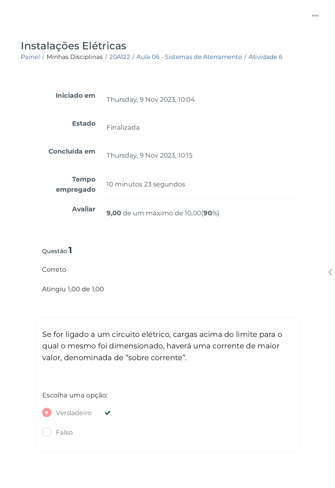 14/11/2023, 17:09 Atividade 6 https://ava.politecnicabr.com.br/mod/quiz/review.php?attempt=5881510 1/7 Painel / Minhas Disciplinas / 20A122 / Aula 06 - Sistemas de Aterramento / Atividade 6 Instalações Elétricas Iniciado em Thursday, 9 Nov 2023, 10:04 Estado Finalizada Concluída em Thursday, 9 Nov 2023, 10:15 Tempo empregado 10 minutos 23 segundos Avaliar 9,00 de um máximo de 10,00(90%) Questão 1 Correto Atingiu 1,00 de 1,00 Se for ligado a um circuito elétrico, cargas acima do limite para o qual o mesmo foi dimensionado, haverá uma corrente de maior valor, denominada de “sobre corrente”. Escolha uma opção: Verdadeiro Falso https://ava.politecnicabr.com.br/my/ https://ava.politecnicabr.com.br/my/ https://ava.politecnicabr.com.br/course/view.php?id=959 https://ava.politecnicabr.com.br/course/view.php?id=959#section-7 https://ava.politecnicabr.com.br/mod/quiz/view.php?id=32491 https://ava.politecnicabr.com.br/ 14/11/2023, 17:09 Atividade 6 https://ava.politecnicabr.com.br/mod/quiz/review.php?attempt=5881510 2/7 Questão 2 Correto Atingiu 1,00 de 1,00 O Aterramento é necessário para que o equipamento elétrico funcione corretamente. Escolha uma opção: Questão 3 Correto Atingiu 1,00 de 1,00 O curto-circuito é como o próprio nome indica um caminho mais curto (ou mais fácil) para a corrente elétrica �uir. É um tipo de “sobre corrente” de altíssima intensidade. Escolha uma opção: a. Aterramento de Proteção b. Aterramento Funcional c. Aterramento de Serviço d. Aterramento Temporário Verdadeiro Falso https://ava.politecnicabr.com.br/ 14/11/2023, 17:09 Atividade 6 https://ava.politecnicabr.com.br/mod/quiz/review.php?attempt=5881510 3/7 Questão 4 Correto Atingiu 1,00 de 1,00 A Norma NBR 5410/97 determina que em todos os esquemas de Aterramento, o Condutor de Proteção (PE) não deve ser seccionado e que nenhum dispositivo deve ser inserido a esse Condutor de Proteção. Escolha uma opção: Questão 5 Correto Atingiu 1,00 de 1,00 Para ter uma proteção adequada contra as descargas elétricas de origem atmosférica, deve seguir os procedimentos da Norma vigente, a NBR 5419/2001 “Proteção de Estruturas contra Descargas Atmosféricas” da ABNT. Escolha uma opção: Verdadeiro Falso Verdadeiro Falso https://ava.politecnicabr.com.br/ 14/11/2023, 17:09 Atividade 6 https://ava.politecnicabr.com.br/mod/quiz/review.php?attempt=5881510 4/7 Questão 6 Correto Atingiu 1,00 de 1,00 Se o �o Fase estiver com isolação dele dani�cada e �zer contato com a Terra através de uma parte metálica da instalação elétrica, �uirá por esse ponto uma: Escolha uma opção: Questão 7 Correto Atingiu 1,00 de 1,00 Denomina-se “Aterramento Elétrico”, a ligação intencional de um componente através de um meio condutor com a Terra. Escolha uma opção: a. Corrente de "Salto" b. Corrente de "Fuga" c. Tensão de "Fuga" d. Tensão de "Salto" Verdadeiro Falso https://ava.politecnicabr.com.br/ 14/11/2023, 17:09 Atividade 6 https://ava.politecnicabr.com.br/mod/quiz/review.php?attempt=5881510 5/7 Questão 8 Correto Atingiu 1,00 de 1,00 Podemos a�rmar que fusíveis são dispositivos de proteção contra os curtos-circuitos. Escolha uma opção: Questão 9 Correto Atingiu 1,00 de 1,00 O Aterramento protege as pessoas e/ou animais domésticos contra os choques elétricos é denominado? Escolha uma opção: Verdadeiro Falso a. Aterramento de Proteção b. Aterramento Temporário c. Aterramento Funcional d. Aterramento de Serviço https://ava.politecnicabr.com.br/ 14/11/2023, 17:09 Atividade 6 https://ava.politecnicabr.com.br/mod/quiz/review.php?attempt=5881510 6/7 Questão 10 Incorreto Atingiu 0,00 de 1,00 No esquema de aterramento TN-C, o condutor Neutro é interligado ao longo da instalação elétrica, ao Condutor de Proteção (PE) e ser usado como tal. Escolha uma opção: Verdadeiro Falso Entre em Contato https://www.politecnicabr.com.br 0800 084 2627 0800 084 2627 Links Úteis Dicas da nossa Diretora Acadêmica Planner de Estudos Declaração de Matrícula Orientações do AVA Abertura de Ticket Fale com o Tutor Cronograma de Estudos Manual de Estágio Manual de Competência Siga-nos nas redes sociais https://www.politecnicabr.com.br/ https://soundcloud.com/user-501638417/sets/escola-politecnica-brasileira https://soundcloud.com/user-501638417/sets/escola-politecnica-brasileira https://storage.googleapis.com/sirius-pubstore/semestre_plannerdeestudo%20poli.pdf https://storage.googleapis.com/sirius-pubstore/semestre_plannerdeestudo%20poli.pdf https://storage.googleapis.com/sirius-pubstore/declaracao_matricula.pdf https://storage.googleapis.com/sirius-pubstore/declaracao_matricula.pdf https://storage.googleapis.com/sirius-pubstore/orientacoes_ava.pdf https://storage.googleapis.com/sirius-pubstore/orientacoes_ava.pdf https://storage.googleapis.com/sirius-pubstore/abertura_ticket.pdf https://storage.googleapis.com/sirius-pubstore/abertura_ticket.pdf https://storage.googleapis.com/sirius-pubstore/fale_com_tutor.pdf https://storage.googleapis.com/sirius-pubstore/fale_com_tutor.pdf https://storage.googleapis.com/sirius-pubstore/cronograma_estudos.pdf https://storage.googleapis.com/sirius-pubstore/cronograma_estudos.pdf https://storage.googleapis.com/sirius-pubstore/manual_estagio.pdf https://storage.googleapis.com/sirius-pubstore/manual_estagio.pdf https://storage.googleapis.com/sirius-pubstore/manual_competencia.pdf https://storage.googleapis.com/sirius-pubstore/manual_competencia.pdf https://www.facebook.com/politecnicabr https://www.instagram.com/politecnicabr_oficial https://ava.politecnicabr.com.br/ 14/11/2023, 17:09 Atividade 6 https://ava.politecnicabr.com.br/mod/quiz/review.php?attempt=5881510 7/7 © 2022 - Escola Politécnica Brasileira https://ava.politecnicabr.com.br/mod/quiz/0 https://ava.politecnicabr.com.br/mod/quiz/0 https://ava.politecnicabr.com.br/