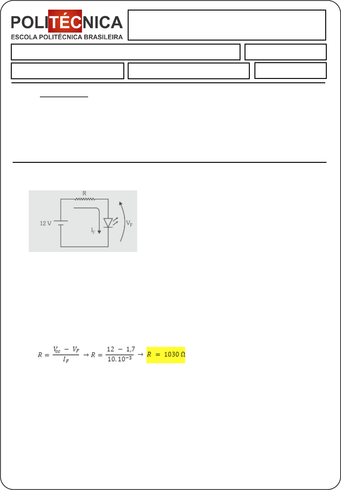 Avaliação de Pesquisa 02: Princípios de Eletrônica Analógica- CT 1) Determine o resistor R para polarizar o LED, conforme o circuito em seguida. Especificações do LED: Cor: vermelha Diâmetro: 5 mm Operação: VF = 1,7v IF = 10mA IF max = 50 mA VR max = 5V 2) Um diodo de silício apresenta, à temperatura de 25 °C, uma queda de tensão no sentido direto de VF1 = 0,6 V com uma corrente de 12 mA. Se a corrente se mantiver constante, qual será a tensão direta resultante na temperatura 115°C? Princípios de Eletrônica Analógica - CT Aluno (a): ALCIDES DIAS SOUTO JUNIOR Data: 12/11/2023 Avaliação de Pesquisa 02 NOTA: INSTRUÇÕES: ❖ Esta Avaliação de pesquisa contém 05 questões, totalizando 10 (dez) pontos. ❖ Você deve preencher dos dados no Cabeçalho para sua identificação o Nome / Data de entrega ❖ Utilize o espaço abaixo destinado para realizar a atividade. ❖ Ao terminar grave o arquivo com o nome Avaliação de Pesquisa 02 (nome do aluno). ❖ Envie o arquivo pelo sistema. Avaliação de Pesquisa 02: Princípios de Eletrônica Analógica- CT 3) Considere um circuito retificador de meia-onda ligado a uma carga resistiva com um transformador 220 V x 15 V – 60 VA operando em sua potência máxima. Determine: A máxima potência que pode ser transferida à carga; A tensão média e a corrente média máxima na carga; As especificações dos diodos. Avaliação de Pesquisa 02: Princípios de Eletrônica Analógica- CT 4) Especifique utilizando a tabela abaixo os capacitores a seguir conforme os dados dos seus encapsulamentos: a) Capacitor cerâmico com a inscrição 104. b) Capacitor de poliéster metalizado com as cores: laranja, laranja, amarelo, branco, vermelho 5) Considere o circuito RC dado na figura abaixo, no qual o capacitor encontra-se totalmente descarregado. Dados: R = 100 kΩ; C = 10 µF; E = 10 V a) Determine a constante de tempo t do circuito; t = 0,9s → 1s b) Após o fechamento da chave S, em que tempo se pode considerar o capacitor completamente carregado? t = 0,9s → 1s