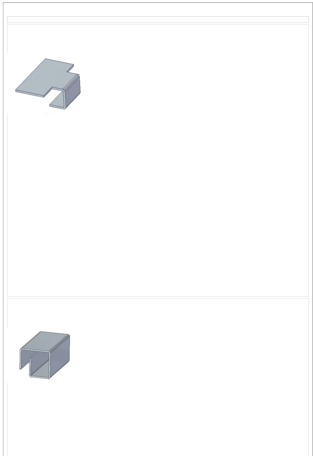 Exercício 1: Observe a figura abaixo. Quais as features, em em que ordem, devem ser aplicadas: A) Flange, Flange e Contour flange B) Flange, Contour flange e tab C) Tab, flange e flange D) Flange, tab e flange E) Flange, flange e Tab O aluno respondeu e acertou. Alternativa(C) Comentários: Essa disciplina não é ED ou você não o fez comentários Exercício 2: Observe a figura abaixo. A chapa foi criada com várias features, mas poderia ter sido criada apenas com: A) Tab B) Flange C) 2 bend corner D) Contour flange E) Não é possível criar esta chapa com uma única feature O aluno respondeu e acertou. Alternativa(D) Comentários: Essa disciplina não é ED ou você não o fez comentários Exercício 3: Observe a figura abaixo. Quais as features, em em que ordem, devem ser aplicadas para obter a chapa: A) Contour flange, dimple e hole cut B) Contour flange, hole cut e dimple C) Flange, dimple e hole cut D) Flange, hole cut e dimple E) Dimple, flange e hole cut O aluno respondeu e acertou. Alternativa(A) Comentários: Essa disciplina não é ED ou você não o fez comentários Exercício 4: Qual o número mínimo de features para obter a peça abaixo: A) 2 B) 3 C) 4 D) 5 E) 6 O aluno respondeu e acertou. Alternativa(D) Comentários: Essa disciplina não é ED ou você não o fez comentários Exercício 5: Observe a figura abaixo. A parte superior foi criada com a feature tab. Qual a outra feature que complementou o processo? A) Contour flange B) Flange C) 2 corner bend D) Tab E) Hole cut O aluno respondeu e acertou. Alternativa(B) Comentários: Essa disciplina não é ED ou você não o fez comentários Exercício 6: Leia as sentenças abaixo e indique quais as corretas: I-O modelagem de uma chapa precisa da especificação da espessura da chapa e de um raio mínimo de dobra. II-A feature dimple tem suas dimensões alteradas dinamicamete até a ruptura do material III- Flanges sucessivas geram uma chapa fechada A) Somente a I B) Somente a I e II C) Somente a I e III D) Somente a II E) Somente a II e III O aluno respondeu e acertou. Alternativa(A) Comentários: Essa disciplina não é ED ou você não o fez comentários Exercício 7: Leia as sentenças abaixo e indique quais as corretas: I-A feature que cria chapa a partir de contorno fechado é a “contour flange” II- A feature que cria chapa a partir de contorno aberto é a “tab” III- A grande vantagem da modelagem de chapas é o cálculo do blank que prevê o esmagamento do material na dobra. A) Somente a I B) Somente a I e II C) Somente a I e III D) Somente a III E) Somente a II e III O aluno respondeu e acertou. Alternativa(D) Comentários: Essa disciplina não é ED ou você não o fez comentários Exercício 8: Qual o número mínimo de features para obter a peça abaixo: A) 2 B) 3 C) 4 D) 5 E) 6 O aluno respondeu e acertou. Alternativa(C) Comentários: Essa disciplina não é ED ou você não o fez comentários
