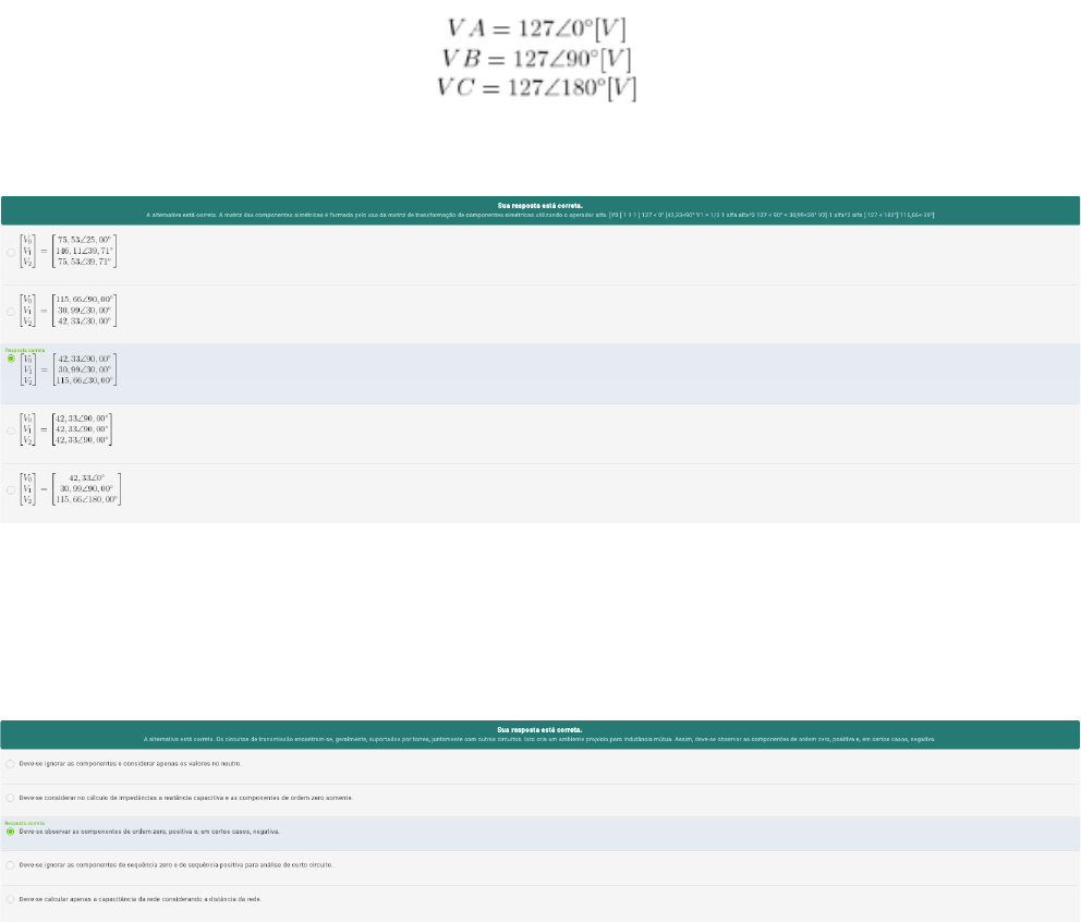 1/7 UNIDADE 04 Atividade 4 – Prova 01 - O cálculo das componentes simétricas é utilizado em sistemas trifásicos para análise dos circuitos, especialmente re- ferente ao sistema elétrico de potência. Assim sendo, considere o sistema elétrico trifásico, que possui as tensões abaixo, nas suas fases. Assinale a alternativa que indica corretamente as componentes simétricas. 02 - As linhas de transmissão, geralmente, encontram-se instaladas em torres, juntamente com outras linhas. Em muitos casos de faltas em linhas de transmissão deve-se considerar a indutância mútua ao analisar as faltas. Desta forma, assinale a alternativa correta. 2/7 03 - Para o cálculo de faltas em circuitos de sistemas elétricos de potência, é necessário verificar as correntes de defeito. Nestes, devem ser representados os principais elementos do circuito por meio de suas impedâncias para que, ao se traba- lhar com matrizes, o resultado parta da tensão e apresente a matriz de correntes. Com base no excerto apresentado, avalie as afirmações a seguir. I. Para análise de curto-circuito, precisamos considerar o circuito elétrico que representa a parte que analisamos do SEP com as indutâncias mútuas. Assim, deve-se conhecer a indutância mútua mediante a construção de uma matriz de admi- tância. II. No cálculo de análise de SEP, não se pode considerar o teorema de substituição e fontes, pois as fontes de tensão em um SEP não podem ser consideradas uma chave aberta. III. Matrizes de admitância são simétricas, complexas e quadradas de dimensão n × m, formadas por admitâncias. IV. Somente Norton pode ser considerado nas análises de redes em SEP, pois não se pode considerar fontes de corrente, apenas fontes de tensão. É correto o que se afirma em: 04 - A análise de um sistema elétrico de potência (SEP) inclui a criação de uma matriz que representa a impedância do sistema elétrico denominada . Esta matriz pode ser criada utilizando-se diversos métodos. Assinale, abaixo, a alternativa que indica corretamente um meio de se obter a matriz de impedância de barra Zbus. 3/7 05 - Veja a imagem a seguir: Figura 2 - Diagrama unifilar Fonte: Elaborada pelo autor. #PraCegoVer: o diagrama unifilar apresenta um gerador V1, a impedância Z2, a impedância Z2 e o gerador V2, ligados em série, nesta ordem. No meio, entre Z1 e Z2, há um ponto P aterrado à terra, representando um curto-circuito fase/terra. Com base no apresentado, analise as asserções a seguir e a relação proposta entre elas. I. Considerando um sistema formado por dois geradores e , que conectam duas cargas e , na ocorrência de uma falta à terra representada pelo ponto P, equidistante das fontes, duas correntes distintas são verificadas no sis- tema, quais sejam, e . PORQUE: II. e são parcelas de corrente de falta e ocorrem devido à contribuição de em relação de e em rela- ção à Assinale a alternativa correta acerca destas correntes e . 4/7 06 - Considera-se o método de matriz de admitâncias uma forma simples de se analisar a falta no circuito de um sistema elétrico de potência. Isto porque, uma vez obtendo-se os valores de admitância, regras simples são seguidas para se criar a matriz. Analise o circuito abaixo, no qual houve uma falta na barra 5, representando as Impedâncias. Figura 5 - Diagrama unifilar Fonte: Elaborada pelo autor. #PraCegoVer: tratam-se de duas fontes geradoras, cada uma com impedância j0,12. Cada uma está conectada a uma barra. Uma fonte está conectada à barra 1, e, após esta barra, uma impedância de j0,10 entre as barras 1 e 2. A outra fonte está conectada à barra 3. Após, uma impedância de j0,10 conectada entre as barras 3 e 4. As barras 2 e 4 estão interconectadas por uma impedância j0,15. A barra 2 está conectada com uma barra 5 por uma outra impedância j0,25, e a barra 4 também está conectada com a barra 5 com outra impedância j,013. Na barra 5 houve uma falta. Assinale a alternativa que apresenta a matriz de admitância Y corretamente. Obs.: Correta é a primeira alternativa. 5/7 07 - O sistema trifásico é a forma mais usual de geração e utilização de energia elétrica. A formação de suas três fases é possível graças a uma defasagem entre elas em 120°. Tomando um sistema trifásico simétrico, com sequência de fase ne- gativa CBA, tem-se as seguintes tensões: Vab, Vbc e Vca, com a tensão VAB = 380 L 195°, assinale a alternativa correta, que representa as tensões de fase. 08 - Os sistemas trifásicos são formados por três fases distintas, as quais atuam em conjunto no sistema elétrico de potên- cia. Para um sistema trifásico simétrico, com sequência de fase negativa CBA, tem-se as seguintes tensões: Vab, Vbc e Vca. Considerando a tensão , assinale a alternativa correta que representa as tensões de fase. 09 - O cálculo das componentes simétricas é utilizado em sistemas trifásicos para análise dos circuitos, especialmente re- ferente ao sistema elétrico de potência. Assim sendo, considere o sistema elétrico trifásico, que possui as tensões abaixo, nas suas fases. Assinale a alternativa que indica corretamente as componentes simétricas. 6/7 10 - O sistema elétrico de potência, abaixo descrito, sofreu falta na barra 5. Figura 3 - Diagrama unifilar Fonte: Elaborada pelo autor. #PraCegoVer: tratam-se de duas fontes geradoras conectadas em estrela. Cada uma está conectada a uma barra. Uma fonte está conectada à barra 1, e, após esta barra, um transformador fechado em estrela-triângulo está conectado entre as barras 1 e 2. A outra fonte está conectada à barra 3. Após, um transformador fechado em estrela-estrela está conectado entre as barras 3 e 4. As barras 2 e 4 estão interconectadas por uma reatância indutiva. A barra 2 está conectada com a barra 5 por uma outra reatância indutiva, e a barra 4 também está conectada com a barra 5 com outra reatância indu- tiva. Na barra 5 houve uma falta. O primeiro pa
