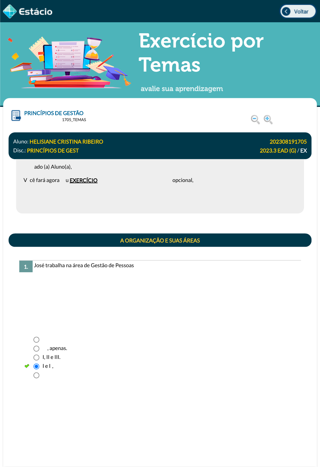 15/11/2023, 12:08 Estácio: Alunos https://simulado.estacio.br/alunos/ 1/5 Exercício por Temas avalie sua aprendizagem José trabalha na área de Gestão de Pessoas da empresa SERVIÇOS LTDA. Entre suas atividades, encontra(m)-se: I - Determinar as necessidades de recursos humanos; II - Avaliar o impacto das novas tecnologias e de novas formas de organização do trabalho; III - Coordenar, monitorar e avaliar todas as atividades e os �uxos �nanceiros internos. Está correto o que é a�rmado em: PRINCÍPIOS DE GESTÃO Lupa DGT0005_202308191705_TEMAS Aluno: HELISIANE CRISTINA RIBEIRO Matr.: 202308191705 Disc.: PRINCÍPIOS DE GEST 2023.3 EAD (G) / EX Prezado (a) Aluno(a), Você fará agora seu EXERCÍCIO! Lembre-se que este exercício é opcional, mas não valerá ponto para sua avaliação. O mesmo será composto de questões de múltipla escolha. Após responde cada questão, você terá acesso ao gabarito comentado e/ou à explicação da mesma. Aproveite para se familiarizar com este modelo de questões que será usado na sua AV e AVS. A ORGANIZAÇÃO E SUAS ÁREAS 1. I, apenas. III, apenas. I, II e III. I e II, apenas. II e III, apenas. Data Resp.: 15/11/2023 11:55:56 Explicação: I - Determinar as necessidades de recursos humanos. Correto. II - Avaliar o impacto das novas tecnologias e de novas formas de organização do trabalho. Correto. III - Coordenar, monitorar e avaliar todas as atividades e os �uxos �nanceiros internos. Incorreto. As atividades e �uxos �nanceiros são responsabilidade da área de Finanças da organização e não de Gestão de Pessoas. javascript:voltar(); javascript:voltar(); javascript:voltar(); javascript:voltar(); javascript:diminui(); javascript:diminui(); javascript:aumenta(); javascript:aumenta(); 15/11/2023, 12:08 Estácio: Alunos https://simulado.estacio.br/alunos/ 2/5 As políticas e práticas da gestão de pessoas têm impacto positivo no desempenho de uma organização, pois contribuem para: I- mediar os interesses entre empregados e organização; II- ampliar as competências desejáveis para o exercício das atividades; III- consolidar os valores organizacionais. É correto o que se a�rma em: Todas as rotinas �nanceiras são importantes para as organizações, mas algumas merecem destaque. São elas: I. Fluxo de caixa II. Controle de estoque III. Orçamento empresarial IV. Gestão de cargos e salários Assinale a alternativa que indica os itens corretos. A área de Gestão de Pessoas visa criar ações que atraiam e retenham talentos de alto desempenho. O que se espera alcançar ao criar ações relacionadas ao desempenho e remuneração? 2. II, apenas. I, apenas. I, II e III. III, apenas. I e II, apenas. Data Resp.: 15/11/2023 11:56:40 Explicação: A respsota correta é: I, II e III. 3. I, II e IV, apenas. I, II e III, apenas. II, III e IV, apenas. I e III, apenas. I, II, III e IV. Data Resp.: 15/11/2023 11:57:38 Explicação: QUAIS SÃO AS ROTINAS FINANCEIRAS MAIS IMPORTANTES? Todas são importantes, mas as que se destacam são: �uxo de caixa, controle de contas a pagar e a receber, orçamento empresarial e controle de estoque. 4. Reduzir a pegada de carbono da empresa. Atração e retenção de colaboradores de alto desempenho. Aumentar a margem de lucro. Satisfazer os clientes externos. 15/11/2023, 12:08 Estácio: Alunos https://simulado.estacio.br/alunos/ 3/5 Katmandu é retrato do sincretismo religioso do Nepal. Encalacrado entre a Índia e a China, o Nepal parece um ponto intermediário entre essas regiões, com sua capital, Katmandu, historicamente um ponto nevrálgico da rota de comércio entre as potências vizinhas. Uma das características mais notáveis é como o hinduísmo (que engloba 80% da população) e o budismo (10%) se misturam. As duas religiões celebram festivais em conjunto e muitos nepaleses seguem ambas. O Nepal é um local importante para os budistas. Em Katmandu, duas das principais atrações são ligadas ao budismo. Swayambhu, também conhecido como "templo dos macacos", por conta da quantidade desses animais que vivem por lá, é um dos locais religiosos mais antigos do Nepal - sua origem remonta ao séc. 6º-, também reverenciado por hindus. Prepare-se para subir escadarias e caminhar um tanto para visitar as estruturas do local, espalhadas por um morro, de onde se tem uma vista privilegiada da cidade. (Fonte: http://www1.folha.uol.com.br/turismo) Uma empresa que quer entrar nesse mercado é recomendável que o pro�ssional de marketing estude o ambiente Produtos e serviços são diferenciações importantes na área de Gestão de Produção e Operações. Qual é uma das principais características que diferencia produtos de serviços? Expandir a presença global da organização. Data Resp.: 15/11/2023 12:00:00 Explicação: A resposta correta é: "Atração e retenção de colaboradores de alto desempenho". Criar ações relacionadas ao desempenho e remuneração visa atrair, reter e afetar o processo motivacional dos colaboradores de alto desempenho. Faz parte da atividade de retenção de talentos. 5. Demográ�co Econômico Geográ�co Sociocultural Populacional Data Resp.: 15/11/2023 12:01:07 Explicação: As crenças e os valores culturais são importantes fatores de in�uência do hábito de consumo e à medida que se modi�cam, de certa forma, também modi�cam o que as pessoas passam a comprar. No estudo de fatores socioculturais pesquisa-se sobre a cultura do público alvo da empresa, observando-se os fatores que in�uenciam os valores básicos, as crenças, as percepções, as preferências e os comportamentos da sociedade, a �m de traçar estratégias que con�uam com as necessidades dos consumidores, no caso, em especial, aos que tem por hábito viajar para o exterior. 6. Produtos são mais caros do que serviços. Produtos podem ser estocados, mas serviços não. Produtos são altamente personalizáveis, enquanto serviços não são. Produtos envolvem maior interaç