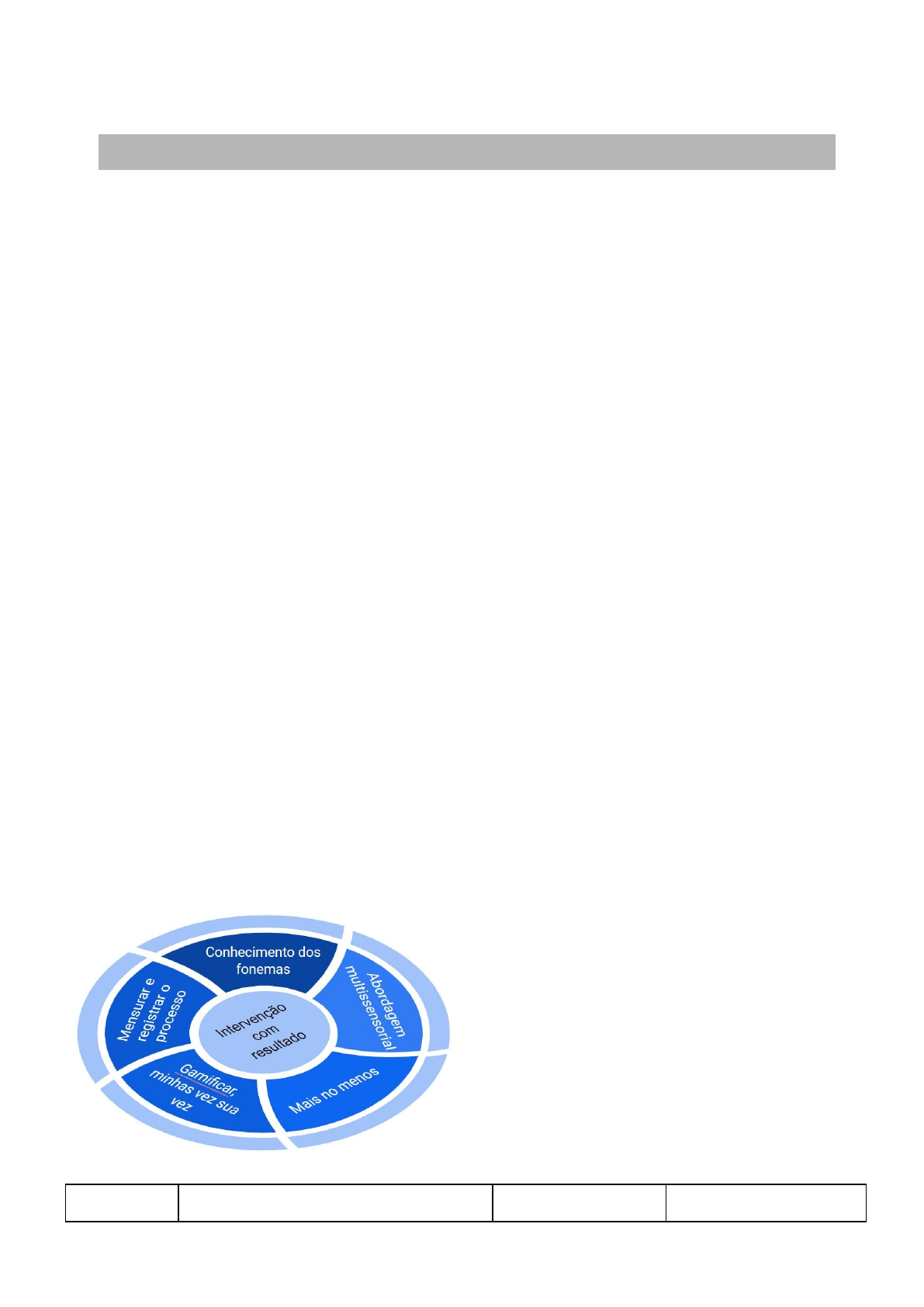 Apostila inicial de Alfabetização Baseada em Evidência Elaborado pela Professora Catia Regina Gianesini Ramos - junho/2023 Disciplina: Fundamentos neuropsicopedagógicos das dificuldades de linguagem oral, leitura e escrita Público alvo : Pedagogos que atuam em sala de aula, sala de recurso multifuncional e clínica. Objetivo : Sistematizar as intervenções na habilitação da alfabetização, para crianças que não conseguiram se alfabetizar com a metodologia aplicada no Ensino Regular. Justificativa Segundo Shaywitz, 2023, a leitura, e consequentemente o processo de alfabetização, não é um processo natural ou instintivo, trata-se um uma capacidade que necessita de instrução explícita. A leitura representa um código, mais especificamente, um código alfabético. Em meus 15 anos de experiência na clínica, compartilhei com vários pais, que pela minha observação empírica, cerca de 80% das crianças eram capazes de aprender com qualquer metodologia. Qual foi a minha surpresa ao encontrar a seguinte citação em Shaywitz, 2023, p.9, “cerca de 70 a 80% das crianças são capazes de entender esse código após um ano de ensino escolar, quase independente do método de instrução utilizado para ensinar a ler.” E isso se deve ao fato de uma parte das crianças pode apresentar complicações neurológicas que interferem no processo de alfabetização, como no caso de dislexia, TDAH, TEA, deficiência intelectual, entre outros. Como podemos ajudar essas crianças? Em minha experiência elaborei uma forma de “re-alfabetizar”, com base no método fonoavisuoarticulatório (Boquinhas), abordagem multissensorial e outras metodologias baseadas em evidência. Consegui extrair o que há de melhor nelas e os resultados se mostraram rápidos e consistentes. Muitas crianças chegam lendo através da nomeação das letras da seguinte forma: P U PU, L O LO, PU…LO, sem compreensão da palavra, outras leem PA,PE,PI,PO,PU… LA,LE,LI,LO… … PULO, essa maneira de ensinar sobrecarrega a memória operacional fonológica daquelas crianças que apresentam prejuízos nessa área, desfavorecendo significativamente o processo. É necessário que seja realizado um trabalho de desconstrução desse hábito, através da instrução explícita. Metodologia CONCEITOS QUE DEVEM PERMEAR TODO O PROCESSO DE INTERVENÇÃO: Para re-alfabetizar precisamos organizar a INTERVENÇÃO NEUROPSICOPEDAGÓGICA, tendo como base a estimulação de 4 aspectos, que são considerados pelos estudos mais atuais na área, como os preditores da alfabetização. Após uma avaliação inicial é necessário priorizar aqueles que a criança apresentou maiores dificuldades e organizar o tempo dentro da sessão. Habilidade Conceito Avaliação Intervenção preditora Habilidade Metafonológ ica = Consciência Fonológica Capacidade de pensar e manipular os sons. Quanto maior for o domínio dos sons da língua, maior será a facilidade com que essas relações entre fonemas e grafemas se estabelecerão e isso facilitará a decodificação e a compreensão da nossa ortografia. Teste CF (Capovila*) ● Utilizar a sequência abaixo para desenvolver atividades com imagens+palavras; ● Pedro no parque de diversões-CTS ● LInce ● Jogos diversos, para jogar a criança deve falar quantas sílabas têm determinada palavras, etc; ● Jogos de rima ● Consciência fonêmica ABAIXO; Vocabulário Refere-se ao número de palavras que nós reconhecemos e compreendemos o significado e funcionalidade. Quanto maior e melhor meu vocabulário, melhor será minha capacidade de compreensão textual e automaticamente de produção textual. Teste de Nomeação Infantil IAR ● Leitura de livros; Memória Operacional Fonológica É a memória de trabalho específica para as informações fonológicas, ou seja, informações sonoras da nossa língua. Enquanto nosso cérebro relaciona os estímulos visuais (letras), com os sons da fala (fonemas), dando sonoridade às palavras enquanto lemos, quem manipula essas informações é a Memória Operacional Fonológica. Cubos de Corsi (7-10 anos) Teste de palavras e pseudopalavras (3 a 14) Testes de audibilização (5,6,7 anos) App Afinando o Cérebro Memória auditiva através de atividades com o LINCE Velocidade de acesso ao léxico mental É a velocidade com que acessamos a informação no nosso cérebro. Refere-se à nossa capacidade de nomear rapidamente figuras, números, letras, cores, palavras, sem perder a fluência e qualidade de nomeação. Teste de nomeação automática rápida (artigo*) Teste TENA Montar suas próprias pranchas de nomeação, cores, palavras e pseudopalavras monossílabas, dissílabas, trissílabas e polissílabas. PRONAR-LE Organize o tempo da intervenção mais ou menos assim: 60% FONEMAS COM FIGURAS 20% NOMEAÇÃO AUTOMÁTICA RÁPIDA 20% LINCE ou Memória com as figuras, ora rima, ora aliteração, formação de frases, etc. Organizando as intervenção: Primeiras intervenções: cada TÓPICO abaixo pode levar mais de uma sessão, deve-se permanecer nele até que a criança se sinta segura; ● Explicar que a diferença entre vogal e consoantes: as vogais tem nome e som igual, enquanto as consoantes têm nome e som diferentes; para ler utilizamos o som das letras; utilizar o nome da criança como exemplo; VOGAIS ● Apresentar as boquinhas de vogais : através do uso de um espelho a criança deve perceber que a boca dela fica igual da imagem quando ela faz o som da letra; montar palavras com encontros vocálicos para ela ler (AI trocando de lugar fica IA, OI, EU, UI, UAU); ● Fazer brincadeiras com massinha, enquanto constrói falar o som; ● Colocar as vogais (letras móveis vazadas, como aquelas de EVA) dentro de um saco escuro. A criança deve colocar a mão, falar o nome da letra e o som; ● Apresentar o ditongo nasal ÃO , falando da história do til como sendo o nariz de uma bruxa que está confusa e faz ãmmm?? (imagem da Bruxa) ● Apresentar os sons secu