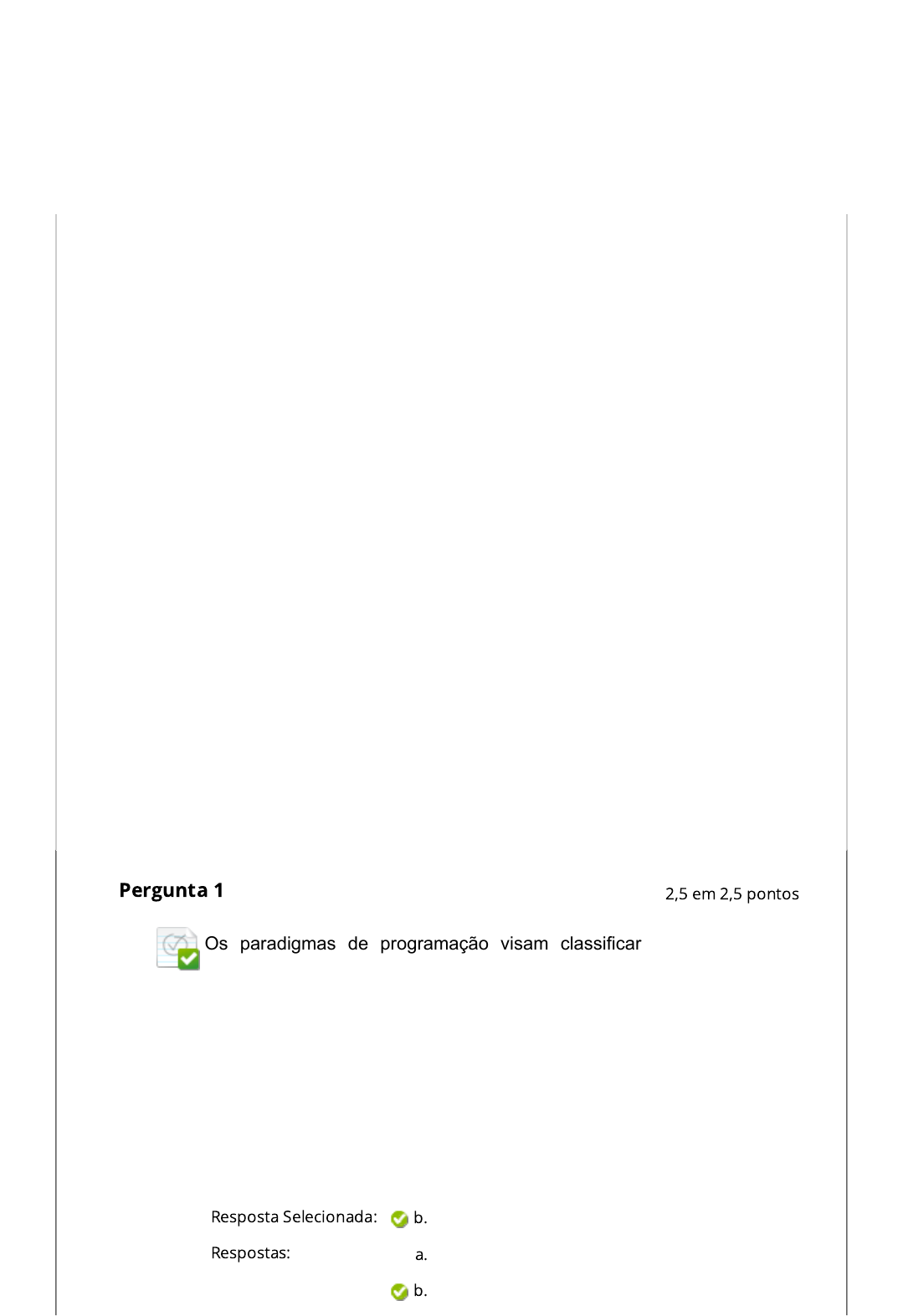 Pergunta 1 Resposta Selecionada: b. Respostas: a. b. Os paradigmas de programação visam classificar as linguagens de programação de acordo com suas funcionalidades. Nesse sentido, um paradigma fornece e determina a visão que o programador tem sobre a estruturação e a execução do programa. Qual o paradigma em que o programador modela o problema, por meio de classes que representam objetos e situações do mundo real utilizando um encapsulamento de funcionalidades? Assinale a alternativa correta. Programação orientada a objetos. Programação funcional. Programação orientada a objetos. 2,5 em 2,5 pontos c. d. e. Comentário da resposta: Programação procedural. Programação de baixo nível. Programação declarativa. JUSTIFICATIVA A programação declarativa utiliza palavras-chave, também conhecidas como tags ou assertivas, e é muito utilizada como linguagens de marcação e para a busca de dados em bancos de dados, como a linguagem SQL. A programação funcional é organizada em funções e utiliza a lógica tradicional de programação, sem usar assertivas. A programação orientada a objetos trabalha com classes que funcionam como moldes para os objetos existentes no mundo real. Na programação procedural o foco está na execução de procedimentos. Pergunta 2 Resposta Selecionada: b. Respostas: a. b. c. d. e. Comentário da resposta: A maioria das declarações de atributos possuem a palavra-chave private como modificador de acesso. Membros privados (atributos e métodos) são acessíveis apenas dentro da classe em que são declarados ou dentro de classes internas. Assinale a seguir a alternativa que apresenta a utilização correta do modificador e sua função: private int nome_variavel01 private int nome_variavel 01 private int nome_variavel01 int private nome_variavel01 private nome_variavel int 01 public private int nome_variavel JUSTIFICATIVA A declaração de variável na linguagem Java obedece à seguinte ordem: modificador de acesso, tipo de variável, nome da variável. Além disso, não se pode utilizar espaços nem palavras reservadas na nomenclatura de variáveis. Pergunta 3 2,5 em 2,5 pontos 2,5 em 2,5 pontos Resposta Selecionada: a. Respostas: a. b. c. d. e. Comentário da resposta: A programação multiplataforma significa criar um software que será implementado e executado em várias plataformas. Esse aplicativo pode rodar em Android e iOS, por exemplo. Para que o software seja considerado multiplataforma, ele deve ser executado em mais de uma arquitetura de computador ou sistema operacional. Em relação à linguagem Java e suas características, assinale a alternativa correta a seguir. Os binários são executados em uma máquina virtual Java (JVM), reconhecida pela maior parte dos dispositivos existentes Os binários são executados em uma máquina virtual Java (JVM), reconhecida pela maior parte dos dispositivos existentes O Java é a linguagem mais popular que existe; por esse motivo, é capaz de executar em qualquer plataforma, seja desktop ou mobile. O Java é uma linguagem de programação de propósito geral, com base em classes, de alto nível e procedural, portanto, multiplataforma. O Java não é multiplataforma, ou seja, é preciso instalar o Java “certo” para cada plataforma e programar pensando nos recursos de hardware disponíveis O Java é executado em um kit de desenvolvimento Java (JDK), reconhecido pela maior parte dos dispositivos existentes JUSTIFICATIVA O bytecode em Java é a razão pela qual o Java é independente de plataforma; assim que um programa Java é compilado, o bytecode é gerado. Para ser mais preciso, um bytecode Java é o código de máquina na forma de um arquivo .class. Um bytecode em Java é o conjunto de instruções para Java Virtual Machine (JVM) e age de forma semelhante a um compilador. Daí o fato de essa linguagem ser portátil. Pergunta 4 2,5 em 2,5 pontos Resposta Selecionada: a. Respostas: a. b. c. d. e. Comentário da resposta: A programação orientada a objetos diz respeito a linguagens que utilizam objetos na programação como uma fonte primária para implementar o que deve ocorrer no código. Os objetos são vistos pelo usuário ao realizar tarefas atribuídas pelo programador/desenvolvedor. A programação orientada a objetos tem por finalidade a introdução de características como herança, ocultação, polimorfismo, dentre outras, na programação. Dessa forma, a intenção é relacionar dados e funções que operacionalizam, prevenindo os acessos indevidos, mas mantendo os acessos essenciais à função em questão. Com relação aos conceitos de programação orientada a objetos, no âmbito da linguagem de programação Java, assinale a alternativa correta a seguir. Métodos construtores atuam sobre um objeto quando ele é criado. Em Java, eles têm o mesmo nome da classe ao qual pertencem Métodos construtores atuam sobre um objeto quando ele é criado. Em Java, eles têm o mesmo nome da classe ao qual pertencem Métodos sempre vão requerer parâmetros de entrada, uma vez que é a partir desses parâmetros que uma execução é realizada Métodos abstratos não devem ser redefinidos em classes derivadas, mas sim herdados como definidos Métodos de classe/estáticos são aqueles que pertencem a uma instância específica, e não a uma classe como um todo Métodos estáticos, ao serem executados, deixam de acessar os atributos de instância de uma classe a que pertencem JUSTIFICATIVA Os modificadores de acesso public, private e protected possuem como função o controle do acesso aos métodos e atributos de uma classe. É possível a criação de múltiplos construtores caracterizando uma sobrecarga, em que sua inicialização será diferente de acordo com seus parâmetros. Os métodos, além disso, não necessitam de parâmetros para seu funcionamento, pois podem precisar realizar algum procedimento que não altere o estado de uma variável.