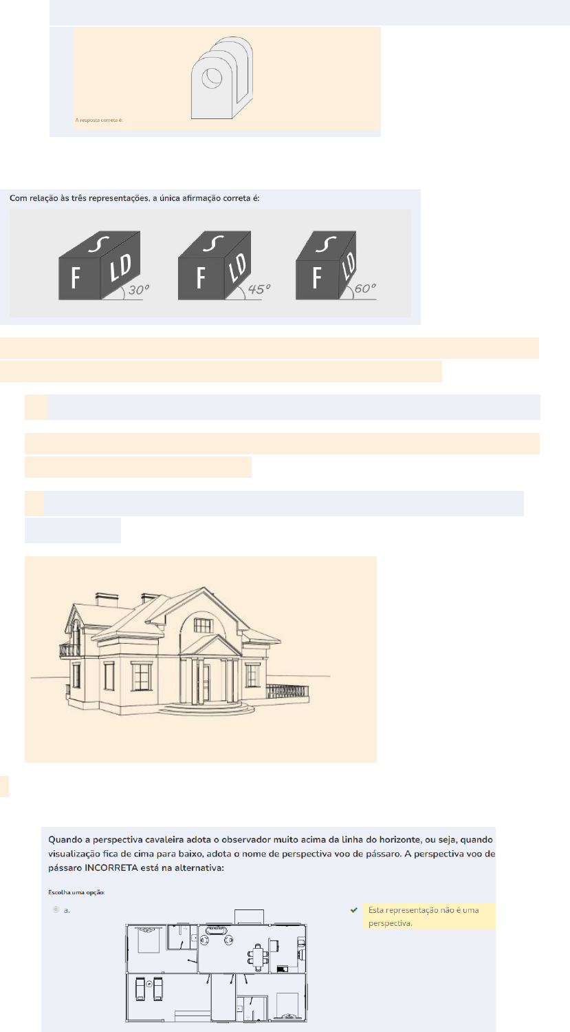 1. A perspectiva cavaleira correta do objeto a seguir, em vistas, é: 2. O terceiro exemplo é o de maior distorção, pois, na perspectiva cavaleira, quanto maior o ângulo, maior é a distorção da imagem real. 3 -Sobre a perspectiva cavaleira, é INCORRETO afirmar que: R: A face frontal da perspectiva cavaleira mantém o seu tamanho real, porém, sofre leve deformação. 4- A única alternativa que não representa uma perspectiva cavaleira é: 5 O que são cotas supérfluas? São cotas repetidas ou que fornecem a mesma informação de duas maneiras diferentes. O posicionamento das linhas de cota deve seguir regras que possibilitem a compreensão das informações do desenho de modo claro e conciso. Qual das situações a seguir está INCORRETA? No sistema unidirecional, todas as cotas e anotações são escritas horizontalmente e lidas com base no lado inferior da folha. No sistema alinhado, todas as cotas estão ordenadas com as linhas da cota, de modo que possam ser lidas do lado inferior ou do lado direito da folha. Como é feita a cota em arcos de circunferência? ão cotados por grupos de raios utilizando linha de chamada, a letra R, e, em certos casos, raios inacessíveis podem ser deslocados ao longo da linha de centro, sendo indicados como uma linha em zigue-zague. O que é a decomposição geométrica de uma peça? É um método que auxilia na seleção das cotas a serem utilizadas. Pela imagem, apresentada a seguir, é possível afirmar que: b. as dimensões de tamanho referem-se a uma folha A0. Qual é a função da margem esquerda da folha? Serve para ser perfurada e utilizada no arquivamento. Qual é a posição do selo? Lado inferior direito. Sabendo que a dimensão da folha A0 é 841 x 1.189 e que a relação entre os demais tamanhos é de y=x√2, assinale a resposta CORRETA: A folha A2 possui dimensões iguais a 420 x 594. Qual é o objetivo da dobra no canto superior esquerdo da folha utilizada nos formatos A0, A1 e A2? Para permitir o correto arquivamento, no caso de perfuração das folhas. Em construções geométricas, o que é um ponto? Um lugar concebido e assumido como posição, porém sem extensão no espaço. O que é um ângulo agudo? Ângulo menor que 90°. O que é segmento de reta? É a distância delimitada entre dois pontos de uma reta. O que são linhas paralelas? São retas equidistantes em toda a extensão O que é um triângulo isósceles? O triângulo isósceles apresenta um eixo de simetria que é perpendicular à base e contém o vértice. Circunferências concêntricas são: Circunferências com o mesmo centro. O que é uma circunferência? É o lugar geométrico dos pontos de um plano, equidistantes de um ponto fixo chamado centro. O que é corda máxima de uma circunferência? É igual ao segmento de reta formado pelos pontos A e B, em que o O pertence ao segmento AB. Dada uma circunferência inscrita em um quadrado de lado 2, a diferença de área entre um e outro é de: 4 - π. Dada uma corda AB, conforme a figura, podemos afirmar que: A mediatriz da corda AB passa por O, obrigatoriamente. Como podemos encontrar o maior número de triângulos retângulos iguais em um polígono regular? Desenhando retas de cada vértice e mediatriz dos lados ao centro. Na palavra hexágono o significado do prefixo "hexa" e do sufixo "gono" são, respectivamente: Seis e ângulo. Com relação ao número de diagonais inscritas em um polígono, podemos afirmar que: É sempre igual ao número de lados menos dois. O que é um polígono inscrito? Um polígono é dito inscrito em uma circunferência se o lugar geométrico de todos os seus vértices é uma circunferência. Dados um triângulo equilátero e um hexágono, podemos afirmar CORRETAMENTE que: Sendo os dois inscritos à mesma circunferência, terão vértices em pontos idênticos, mas limitados pelo número de vértices do triângulo. Porque o dodecaedro é assim chamado? a) Por ser um poliedro regular com 12 faces Qual a forma da face do hexaedro? a) Quadrado. Dada a figura, podemos nomeá-la como: a) Um tetraedro. Qual destes poliedros possui o maior número de vértices? d) Dodecaedro. Qual a relação de faces, arestas e vértices está CORRETA? a) Octaedro F=8, A=12 e V=6. Qual a forma da face do prisma hexagonal reto? a) Retângulo. Como definimos um prisma? Bases formadas por polígonos iguais e paralelos e três ou mais faces, as quais são paralelogramos. Quando o prisma tem uma base não paralela à outra dizemos que se trata de um prisma: Truncado. Dada a figura podemos nomeá-la como: a) Prisma hexagonal oblíquo. O hexaedro é primeiramente: a) Um poliedro regular. O elipsoide de revolução é assim chamado porque: