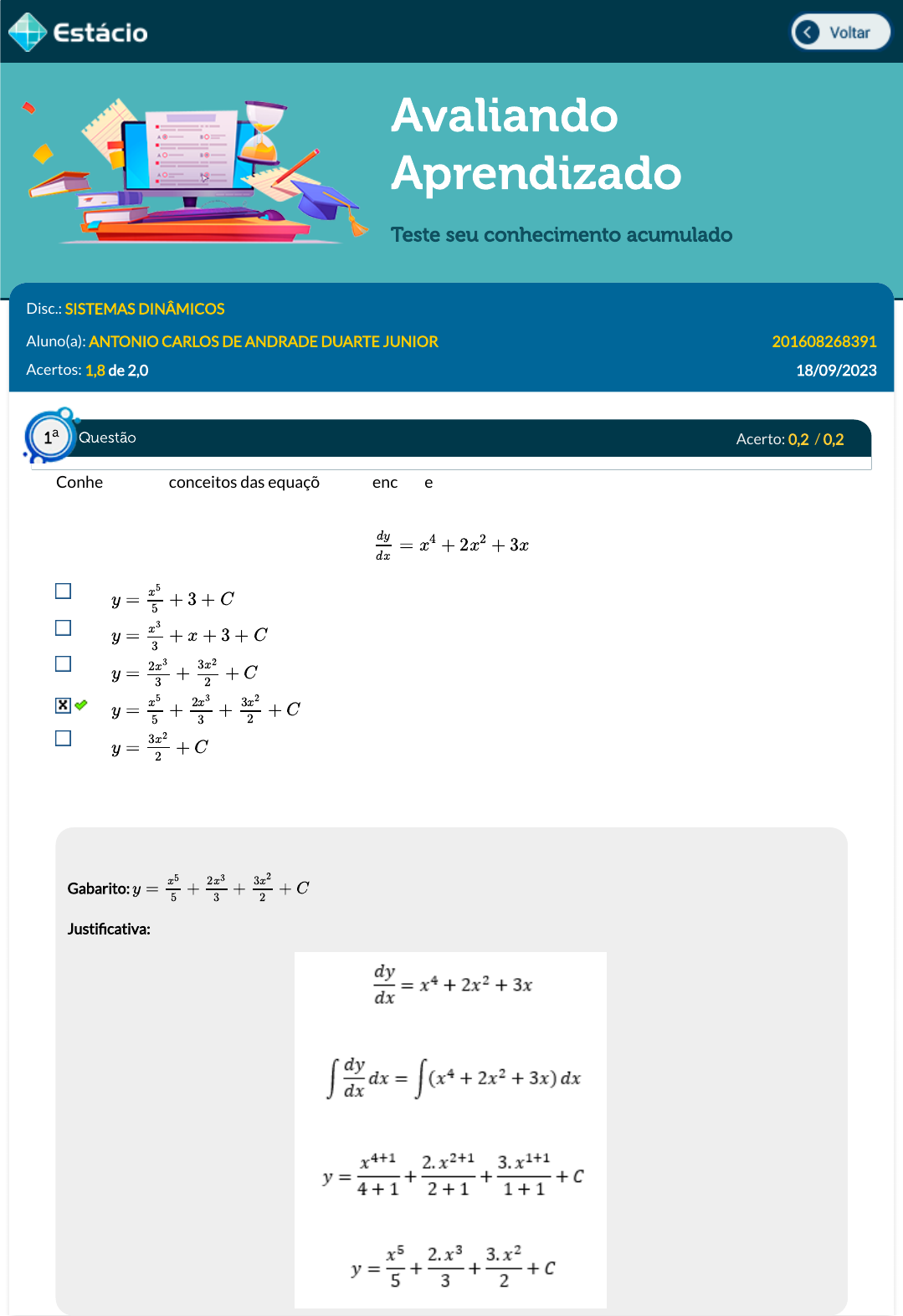 31/10/2023, 17:47 Estácio: Alunos https://simulado.estacio.br/alunos/ 1/7 Avaliando Aprendizado Teste seu conhecimento acumulado Disc.: SISTEMAS DINÂMICOS Aluno(a): ANTONIO CARLOS DE ANDRADE DUARTE JUNIOR 201608268391 Acertos: 1,8 de 2,0 18/09/2023 Acerto: 0,2 / 0,2 Conhecendo os conceitos das equações diferenciais e aplicando-se o Teorema do Valor Inicial, encontre a solução geral para a seguinte equação: Respondido em 18/09/2023 21:42:34 Explicação: Gabarito: Justi�cativa: = x4 + 2x2 + 3x dy dx y = + 3 + Cx 5 5 y = + x + 3 + Cx 3 3 y = + + C2x 3 3 3x2 2 y = + + + Cx 5 5 2x3 3 3x2 2 y = + C 3x2 2 y = + + + C x5 5 2x3 3 3x2 2 Questão1 a https://simulado.estacio.br/alunos/inicio.asp https://simulado.estacio.br/alunos/inicio.asp javascript:voltar(); javascript:voltar(); anton Lápis anton Lápis 31/10/2023, 17:47 Estácio: Alunos https://simulado.estacio.br/alunos/ 2/7 Acerto: 0,2 / 0,2 A representação matemática de um sistema físico que relaciona a sua entrada com a sua saída é de�nida como função de transferência. Observando a conexão entre as engrenagens do sistema mecânico abaixo, é possível a�rmar que o torque transmitido para o corpo inercial , sendo a relação e , é igual a: Fonte: YDUQS - Estácio - 2021 Respondido em 18/09/2023 21:44:15 Explicação: Gabarito: Justi�cativa: A relação entre as engrenagens é de�nida pela equação: Sendo assim, com os parâmetros da questão: Acerto: 0,2 / 0,2 Representar um sistema no espaço de estado apresenta uma grande importância no desenvolvimento de sistemas físicos sendo fundamental para a elaboração de estratégias de controle. Abaixo é possível observar um exemplo de função de transferência de um sistema físico. O vetor de variáveis de estado que de�ne esses sistemas é igual a: (T2) (N1 : N2 = 1 : 2) T1 = 10N .m T2 = 20N .m T2 = 25N .m T2 = 5N .m T2 = 4N .m T2 = 10N .m T2 = 20N .m Questão2 a Questão3 a 31/10/2023, 17:47 Estácio: Alunos https://simulado.estacio.br/alunos/ 3/7 Respondido em 18/09/2023 21:45:57 Explicação: Gabarito: Justi�cativa: A seleção das variáveis de estado é baseada na equação diferencial: Acerto: 0,2 / 0,2 A análise de um sistema pode ser realizada se o modelo matemático que de�ne seu sistema físico, por meio de uma função de transferência, for conhecido. Dessa forma, seu desempenho pode ser avaliado em função do estimulo recebido, ou seja, resposta a entrada. Considerando as especi�cações e estimativas da resposta transitória em sistemas, é possível estimar o tempo de acomodação, em segundos, de um sistema com coe�ciente de amortecimento e frequência natural iguais a 2 e 4rad/s, respectivamente: 1s 0,5s 4s 2s 8s Respondido em 18/09/2023 21:56:06 Explicação: Acerto: 0,2 / 0,2 G(s) = =80 s3+12s2+20s C(s) R(s) x = [ċ c̈ ... c ] x = [ċ ċ ... c ] x = [ċ c̈ ċ ] x = [c ċ c̈ ] x = [c c̈ ... c ] x = [c ċ c̈ ] G(s) = = 80 s3+12s2+20s C(s) R(s) (s3 + 12s2 + 20s)C(s) = 80R(s) s3C(s) + 12s2C(s) + 20sC(s) = 80R(s) ... c + 12c̈ + 20ċ = 80r ... c + 12c̈ + 20ċ = 80r Variáveis de fase = ⎧ ⎨⎩ x1 = c x2 = ċ x3 = c̈ Questão4 a Questão 5 a 31/10/2023, 17:47 Estácio: Alunos https://simulado.estacio.br/alunos/ 4/7 Uma função de transferência é de�nida como a razão entre a transformada de Laplace da saída para a entrada com todas as condições iniciais iguais a zero. Observe a função de transferência abaixo, é possível considerar, adotando-se o princípio fundamental da estabilidade com relação à posição das raízes do sistema, que o sistema é: instável pois possui raízes no semi-plano direito. estável pois apenas possui raízes no semi-plano esquerdo. estável pois possui raízes no semi-plano direito. estável pois possui raízes sobre o eixo imaginário. instável pois apenas possui raízes no semi-plano esquerdo. Respondido em 18/09/2023 21:48:59 Explicação: Gabarito: estável pois apenas possui raízes no semi-plano esquerdo. Justi�cativa: Pela função de transferência é possível observar que: As raízes desse sistema são apenas pólos e podem ser de�nidas por: Acerto: 0,2 / 0,2 A representação de sistemas físicos através de modelos matemáticos é uma ferramenta de grande importância. Considerando o sistema elétrico da �gura abaixo, é possível dizer que o número de variáveis de estado que o mesmo apresenta é igual a: 1 3 5 4 2 Respondido em 18/09/2023 21:53:00 Explicação: Gabarito: 2 Justi�cativa: Como o sistema apresenta dois elementos passivos armazenadores de energia (um capacitor e um indutor) é seguro a�rmar que a representação no espaço de estado possuirá 2 variáveis de estado. G(s) = 80 (s+2)(s+6) G(s) = 80 (s+2)(s+6) s + 2 = 0 → s = −2 s + 6 = 0 → s = −6 Questão6 a 31/10/2023, 17:47 Estácio: Alunos https://simulado.estacio.br/alunos/ 5/7 Acerto: 0,2 / 0,2 A representação matemática de um sistema físico que relaciona a sua entrada com a sua saída é de�nida como função de transferência. Considere um sistema que possua um zero localizado na posição e um pólo localizado em . A função de transferência desse sistema é de�nida como: Respondido em 18/09/2023 22:15:14 Explicação: Gabarito: Justi�cativa: Como a função de transferência é de�nida pelos valores de s capazes de levarem a função para zero (numerador) ou in�nito (denominador), pode-se desenvolver: Acerto: 0,0 / 0,2 O desenvolvimento de sistemas de automação e controles de processos físicos depende de sua representação no espaço de estado por meio do conhecimento de todas as variáveis envolvidas. Para que a conversão de espaço de estado em função de transferência seja possível, é fundamental a determinação do termo . O determinante da matriz é dado por: Respondido em 18/09/2023 22:20:58 Explicação: Gabarito: −1 −4 (s+4) (s+1) (s−4) (s−1) 1 (s+1)(s+4) (s−1) (s−4) (s+1) (s+4) (s+1) (s+4) (sI − A)−1 sI − A s + 2s + 2 s2 + 2s s