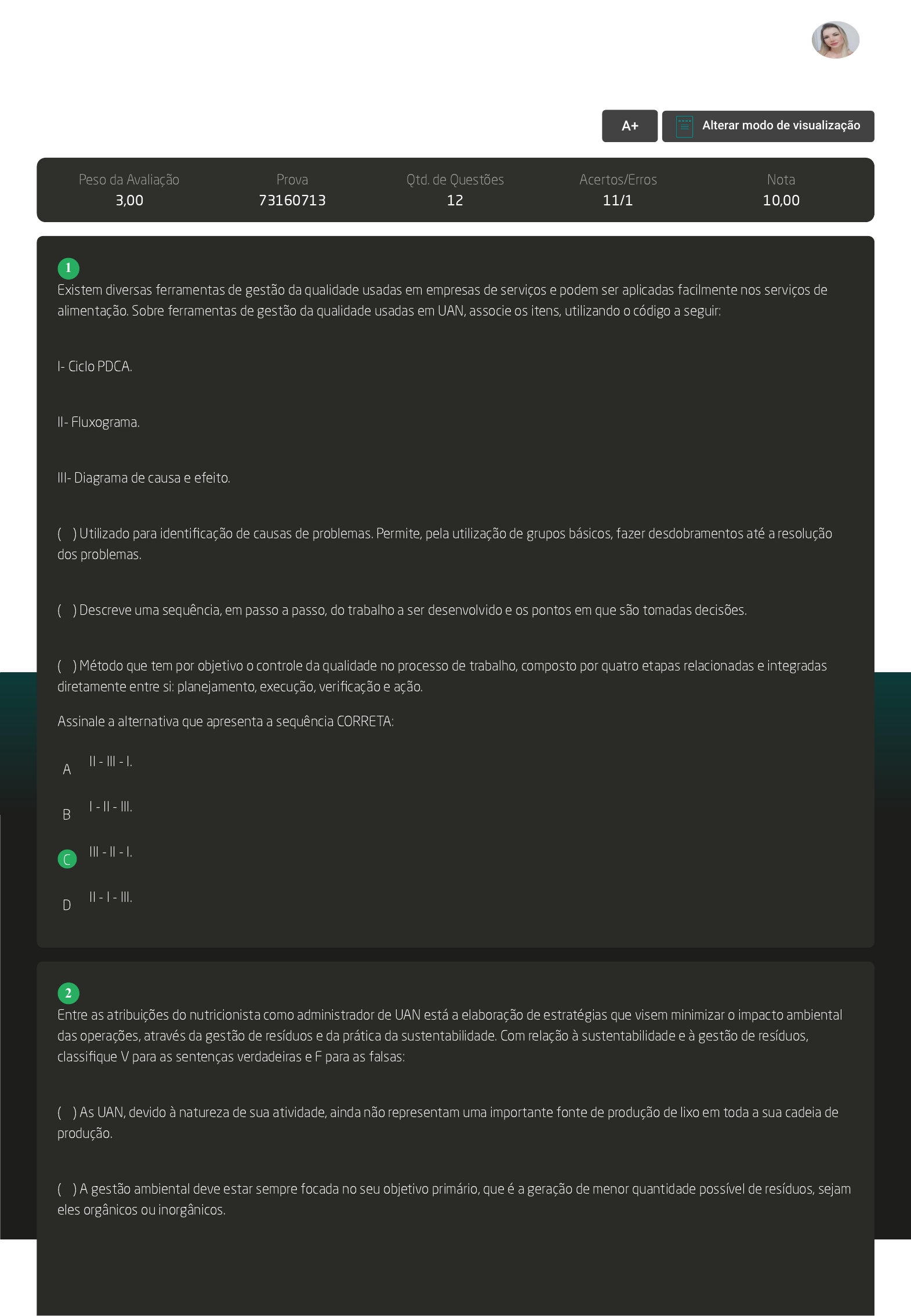 18/11/23, 09:14 AVA https://ava2.uniasselvi.com.br/subject/grades-and-tests/answer-book/eyJ0ZXN0Ijp7InRlc3RDb2RlIjoiODg0NTU1IiwiZGVzY3JpcHRpb24iOiJBdmFsaWHDp8OjbyBGaW5hbCAoT2JqZXRpdmEpIC0gSW5kaXZpZHVh… 1/7 GABARITO | Avaliação Final (Objetiva) - Individual (Cod.:884555) Peso da Avaliação 3,00 Prova 73160713 Qtd. de Questões 12 Acertos/Erros 11/1 Nota 10,00 Existem diversas ferramentas de gestão da qualidade usadas em empresas de serviços e podem ser aplicadas facilmente nos serviços de alimentação. Sobre ferramentas de gestão da qualidade usadas em UAN, associe os itens, utilizando o código a seguir: I- Ciclo PDCA. II- Fluxograma. III- Diagrama de causa e efeito. ( ) Utilizado para identificação de causas de problemas. Permite, pela utilização de grupos básicos, fazer desdobramentos até a resolução dos problemas. ( ) Descreve uma sequência, em passo a passo, do trabalho a ser desenvolvido e os pontos em que são tomadas decisões. ( ) Método que tem por objetivo o controle da qualidade no processo de trabalho, composto por quatro etapas relacionadas e integradas diretamente entre si: planejamento, execução, verificação e ação. Assinale a alternativa que apresenta a sequência CORRETA: A II - III - I. B I - II - III. C III - II - I. D II - I - III. Entre as atribuições do nutricionista como administrador de UAN está a elaboração de estratégias que visem minimizar o impacto ambiental das operações, através da gestão de resíduos e da prática da sustentabilidade. Com relação à sustentabilidade e à gestão de resíduos, classifique V para as sentenças verdadeiras e F para as falsas: ( ) As UAN, devido à natureza de sua atividade, ainda não representam uma importante fonte de produção de lixo em toda a sua cadeia de produção. ( ) A gestão ambiental deve estar sempre focada no seu objetivo primário, que é a geração de menor quantidade possível de resíduos, sejam eles orgânicos ou inorgânicos. VOLTAR A+ Alterar modo de visualização 1 2 Diana Maria Pitt Nutrição (3356946) 18/11/23, 09:14 AVA https://ava2.uniasselvi.com.br/subject/grades-and-tests/answer-book/eyJ0ZXN0Ijp7InRlc3RDb2RlIjoiODg0NTU1IiwiZGVzY3JpcHRpb24iOiJBdmFsaWHDp8OjbyBGaW5hbCAoT2JqZXRpdmEpIC0gSW5kaXZpZHVh… 2/7 ( ) O lixo gerado em uma UAN é predominantemente inorgânico e corresponde a 60% do resíduo total. Assinale a alternativa que apresenta a sequência CORRETA: A V - F - V. B F - F - V. C F - V - F. D V - V - F. Unidades de Alimentação e Nutrição (UAN), também chamadas de Unidade Produtoras de Refeições (UPR), podem ser de dois segmentos distintos: alimentação coletiva e alimentação comercial. Sobre o exposto, avalie as asserções a seguir e a relação proposta entre elas: I- A principal diferenciação entre as duas categorias é o grau de autonomia dos clientes com relação à unidade. PORQUE II- As unidades de alimentação hospitalares devem conquistar os seus consumidores todos os dias, pois eles não apresentam obrigatoriedade e dependência nenhuma com relação à unidade. Assinale a alternativa CORRETA: A As asserções I e II são proposições falsas. B As asserções I e II são proposições verdadeiras, e a II é uma justificativa da I. C A asserção I é uma proposição verdadeira, e a II é uma proposição falsa. D As asserções I e II são proposições verdadeiras, mas a II não é uma justificativa da I. O termo qualidade é muito abrangente e pode ter diversas definições. Com relação aos grandes estudiosos da qualidade e suas teorias, associe os itens, utilizando o código a seguir: I- Feigenbaum. II- Garvin. III- Juran. IV- Crosby. V - Deming ( ) O foco dos seus estudos se direciona para a qualidade representada pela conformidade com as especificações e com as exigências do cliente. 3 4 Diana Maria Pitt Nutrição (3356946) 18/11/23, 09:14 AVA https://ava2.uniasselvi.com.br/subject/grades-and-tests/answer-book/eyJ0ZXN0Ijp7InRlc3RDb2RlIjoiODg0NTU1IiwiZGVzY3JpcHRpb24iOiJBdmFsaWHDp8OjbyBGaW5hbCAoT2JqZXRpdmEpIC0gSW5kaXZpZHVh… 3/7 ( ) As cinco dimensões da qualidade: aspecto transcendental, adição de bons componentes, satisfação do cliente, conformidade às especificações e valor. ( ) A qualidade é enfocada como um valor medido através do nível de organização da empresa. ( ) Para ele, a qualidade se baseia na defesa de que a boa execução do trabalho propicia o aumento da produtividade das empresas. A produtividade empresarial está intimamente ligada ao aprimoramento da qualidade. ( ) A qualidade consiste nas características do produto que vão de encontro às necessidades dos clientes e dessa forma proporcionam a satisfação com relação ao produto. Assinale a alternativa que apresenta a sequência CORRETA: A IV - II - I - V - III. B V - I - II - IV - III. C II - IV - III - V - I. D III - V - IV - II - I. Para redução dos acidentes decorrentes dos riscos ambientais em UAN, a utilização de equipamentos de proteção é fundamental. Sobre e exposto, avalie as asserções a seguir e a relação proposta entre elas: I- Nos ambientes de produção de refeições devem existir medidas de proteção coletiva, e nos casos em que estas medidas não puderem eliminar/minimizar os riscos, os equipamentos de proteção individual devem ser adotados. PORQUE II- São equipamentos destinados a fornecer segurança adicional ao trabalhador, protegendo sua saúde e garantindo integridade física, evitando lesões ou atenuando sua gravidade, ao proteger o corpo. Assinale a alternativa CORRETA: A As asserções I e II são proposições verdadeiras, mas a II não é uma justificativa da I. B As asserções I e II são proposições falsas. C As asserções I e II são proposições verdadeiras, e a II é uma justificativa da I. D A asserção I é uma proposição falsa, e a II é uma proposição verdadeira. A Norma Regulamentadora nº 15 do Ministério do Trabalho indica que um indivíduo não pode ficar exposto po