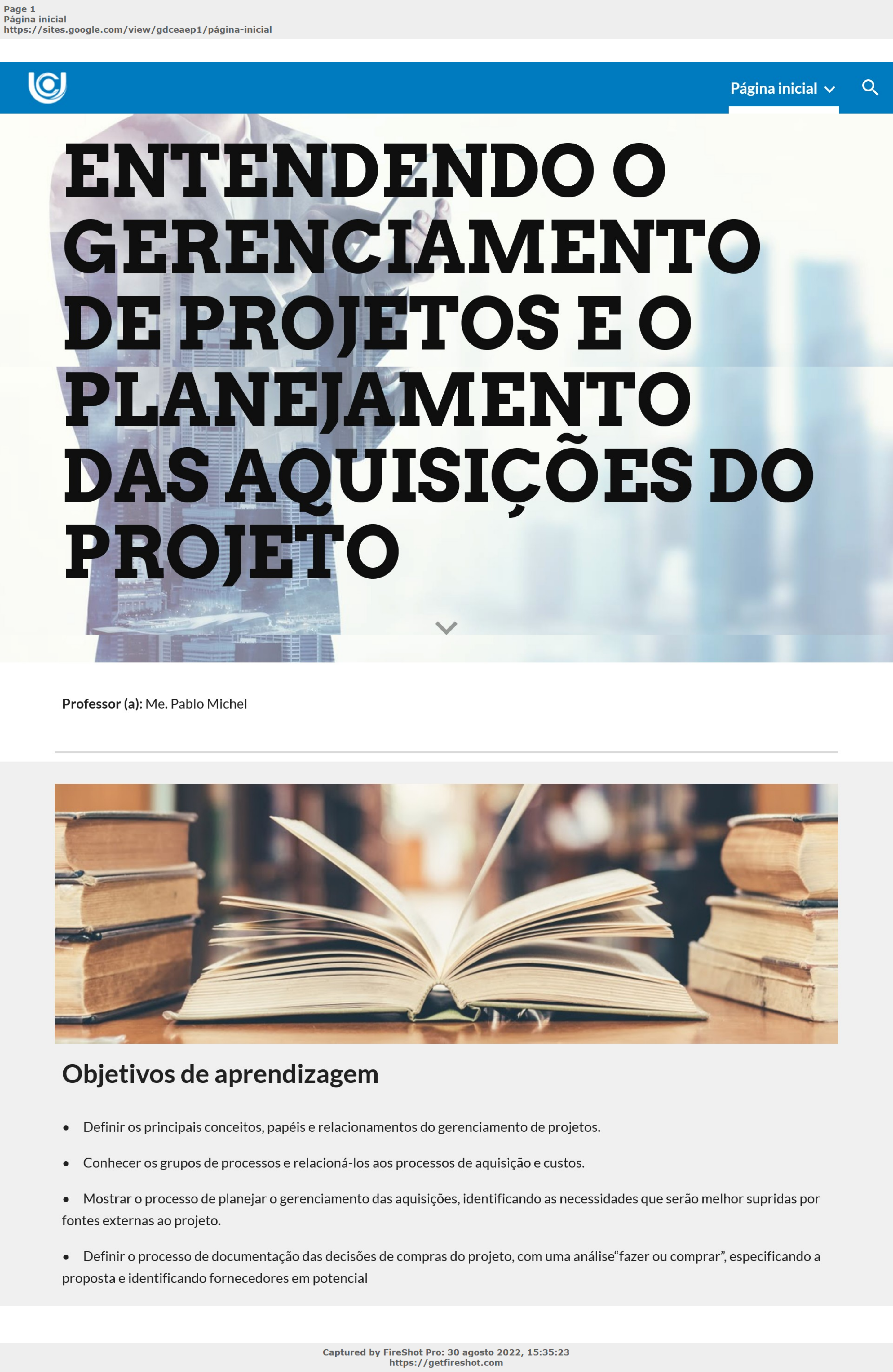 Página inicial Pular para o conteúdo principal Pular para a navegação ENTENDENDO O GERENCIAMENTO DE PROJETOS E O PLANEJAMENTO DAS AQUISIÇÕES DO PROJETO Professor (a) : Me. Pablo Michel Objetivos de aprendizagem • Definir os principais conceitos, papéis e relacionamentos do gerenciamento de projetos. • Conhecer os grupos de processos e relacioná-los aos processos de aquisição e custos. • Mostrar o processo de planejar o gerenciamento das aquisições, identificando as necessidades que serão melhor supridas por fontes externas ao projeto. • Definir o processo de documentação das decisões de compras do projeto, com uma análise“fazer ou comprar”, especificando a proposta e identificando fornecedores em potencial https://sites.google.com/view/gdceaep1/p�gina-inicial https://getfireshot.com https://sites.google.com/view/gdceaep1/p%C3%A1gina-inicial https://sites.google.com/view/gdceaep1/p%C3%A1gina-inicial • Expor a declaração do trabalho de aquisição, apresentando os tipos de contratos e formas de seleção. • Apresentar os documentos para a solicitação de proposta. Plano de estudo A seguir, apresentam-se os tópicos que você estudará nesta unidade: • Fundamentos de gerenciamentos de projetos, custos e aquisições • Planejar o gerenciamento das aquisições • Plano de gestão de contratos Introdução Caro(a) aluno(a), Nesta primeira unidade, discutiremos um pouco sobre o Guia do Conhecimento em Gerenciamento de Projetos (Guia PMBOK®) – Quinta Edição. O PMBOK® Guide (Project Management Body of Knowledge) contém o padrão globalmente reconhecido para a profissão de gerenciamento de projetos, contendo boas práticas confirmadas por profissionais de gerenciamento de projetos que contribuíram para o seu desenvolvimento. Paralelamente, abordaremos conceitos fundamentais para o entendimento da matéria como, por exemplo, o que é um projeto, o que é o gerenciamento de projetos, os relacionamentos entre gerenciamento de portfólios, programas e projetos. Ademais, é importante salientar que neste contexto deve-se frisar a importância de alguns papéis como o de gerente de projetos e os conhecimentos e habilidades que ele deve possuir. Também será explanado sobre o ciclo de vida do projeto. A compreensão desse contexto ajuda a garantir que o trabalho seja conduzido em alinhamento com as metas e gerenciado de acordo com as práticas estabelecidas pela organização. Todas essas definições e conceitos são importantes para podermos introduzir o conteúdo relacionado às aquisições e custos em projetos, assuntos a serem debatidos e detalhados em tópicos subsequentes. Conheceremos os grupos de processos de gerenciamento de projetos: iniciação, planejamento, execução, monitoramento e controle e encerramento. Mas se existem grupos de processos, onde estão os processos? Bem, os processos são agrupados nessas cinco categorias citadas e, como são muitos, abordaremos apenas aqueles que fazem parte do escopo de nossa disciplina: gerenciamento de custos e gerenciamento de aquisições. https://sites.google.com/view/gdceaep1/p�gina-inicial https://getfireshot.com E, para finalizar, apresentaremos o processo de documentação das decisões de compras do projeto, com uma análise fazer ou comprar, especificando a proposta e identificando fornecedores em potencial. Além disso, exploraremos a declaração do trabalho de aquisição, apresentando os tipos de contratos e formas de seleção. Os processos de gerenciamento das aquisições do projeto envolvem acordos, incluindo contratos, que são documentos legais entre comprador e fornecedor. Tais contratos de aquisição incluem termos e condições e podem incorporar outros itens relacionando o que o fornecedor deve realizar ou fornecer. Os tipos de contratos utilizados podem influenciar e contribuir de forma decisiva para a contenção dos riscos envolvidos no projeto, prevendo diferentes graus de responsabilidade de custo e lucro, dependendo do nível de desempenho. Avançar DOWNLOAD PDF UNICESUMAR | UNIVERSO EAD https://sites.google.com/view/gdceaep1/p�gina-inicial https://getfireshot.com https://sites.google.com/view/gdceaep1/p%C3%A1gina-inicial/unidade-1 https://drive.google.com/file/d/1sJ60tpv_1ZFUQnS1U-8EQfyURDgu3kxH/view?usp=sharing Página inicial Pular para o conteúdo principal Pular para a navegação Fundamentos de Gerenciamento de Projetos, Custos e Aquisições Este capítulo aborda as principais considerações sobre gerenciamento de projetos e outros aspectos relacionados, com foco no Guia PMBOK® Quinta Edição – guia do conhecimento que fornece diretrizes para o gerenciamento de projetos –, que serão aprofundados nos capítulos seguintes. Sugerimos essa pequena revisão pois esses conceitos são a base do gerenciamento de projetos e permitem um melhor entendimento e assimilação do que veremos a seguir. Relembrarmos aspectos basilares servirão para discutirmos os múltiplos aspectos da gestão de projetos, fundamental para que as empresas encontrem mecanismos capazes de acelerar o lançamento de produtos, reduzir os custos e melhorar os controles, independentemente do valor investido ou do porte do projeto. Seja qual for a área de atuação, conhecer técnicas de Gestão de Projetos é um diferencial importante ao profissional que pretende destacar-se em sua carreira. Muitas vezes, organizar datas e informações de uma única tarefa a ser realizada a longo prazo já é complicado, imagine então quando existe a necessidade de gerenciar diversos projetos simultaneamente? Por isso, esse tópico nos ajudará no aprofundamento de informações pertinentes no dia-a-dia do gerente de projetos. Vamos em frente, reforçar e memorizar tais conceitos para uma melhor compreensão do tema de custos e aquisições que veremos posteriormente. Mas professor, por que devemos rever esses conceitos? Essa contextualização é importante para termos em mente em que momento os ass