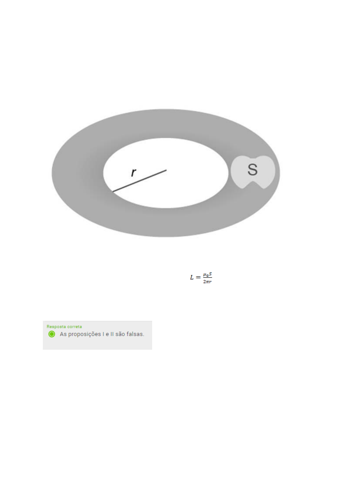 ELETROMAGNETISMO - ATIVIDADE A4 - UNIRITTER Os núcleos toroidais, de diferentes tipos de seção transversal, são utilizados para fazer indutores e até mesmo transformadores elétricos. Dessa forma, compreender como calcular a indutância e entender como estabelecem as diversas possíveis relações eletromagnéticas é fundamental. Assim, considere o núcleo toroidal da imagem a seguir, de seção transversal circular, de raio r: Fonte: Edminister e Nahvi-Dekhordi, 2013, p. 161. Analise as asserções a seguir e a relação proposta entre elas. I) A indutância, nesse caso, será dada pela relação Porque II) A densidade de fluxo magnético média é zero. Assinale a alternativa correta: Diversos tipos de situações práticas podem ser modelados a partir de uma bobina simples, circular, composta por N espiras. Nessa bobina, é possível estabelecer um dado fluxo magnético, variável no tempo, que percorre cada uma das espiras e gera, como podemos perceber pela Lei de Faraday, uma tensão induzida nos terminais dessa bobina: Fonte: Edminister e Nahvi-Dekhordi, 2013, p. 160. A respeito desse circuito, é correto afirmar que: Sabe-se, na prática, que várias situações podem ser compreendidas e analisadas pelas relações de Maxwell, considerando as conformidades com as demais leis e relações eletromagnéticas e a capacidade de síntese das equações propostas. Assim, lembre-se de que existem as formas sintéticas do tipo pontuais, que se baseiam na definição pela derivada e nas relações a partir de formas genéricas de leis, como a Lei de Ampère, permitindo obter a forma integral. Considerando essas informações e seu conhecimento a respeito das equações de Maxwell, analise as afirmativas a seguir e julgue se são verdadeiras (V) ou falsas (F). I) Considerando que a força eletromotriz é dada por , é possível obter , uma das equações de Maxwell. II) Aplicando-se o teorema de Stokes no cálculo da corrente induzida, é possível obter . III) Considerando que é válido quando há fonte de circulação de campo magnético, é possível analisar a corrente. IV) Podemos utilizar a relação para analisar o movimento de cargas livres, gerando corrente. A sequência correta é: Como você pode imaginar ou já viu, um campo magnético (de intensidade H e também expresso em função da densidade do fluxo magnético, B) pode promover o armazenamento de energia magnética (por um indutor, por exemplo). Dessa forma, considerando mais especificamente as relações magnéticas desse importante elemento, sabe-se que a própria indutância apresentada por ele pode ser dada em função da energia magnética apresentada. Então, como podemos calcular a indutância a partir da energia, de forma geral, para qualquer tipo de indutor? Como você sabe, muitas análises acerca dos efeitos magnéticos e eletromagnéticos podem ser feitas a partir das situações práticas; isso inclui, independentemente da análise, aproximar essas situações a outras mais simples, por exemplo. Dessa forma, suponha que um dado sistema real é aproximado como mostra a figura a seguir, para o qual deseja-se calcular o fluxo que atravessa a porção do plano dado por , sendo ainda que e e que há uma corrente de 2,5 A ao longo do eixo z. Fonte: Adaptada de Edminister e Nahvi-Dekhordi, 2013, p. 134. Considerando essas informações, é correto afirmar que: Leia o excerto a seguir: “Cada espira do condutor ou circuito tem alguma indutância (autoindutância), geralmente como um efeito colateral indesejável, o que muitas vezes pode ser desprezado. Em aplicações práticas, no entanto, com frequência concebemos e usamos condutores que são arranjados e formatados (como um fio condutor em forma de bobina) e às vezes enrolados em núcleos magnéticos, para suprimir uma quantidade (grande) de indutância.” (NOTAROS, 2012, p. 225-226) NOTAROS, B. Eletromagnetismo. São Paulo: Pearson Prentice Hall, 2012. Assim, com base no exposto e em seu conhecimento acerca da autoindutância e dos indutores, analise as afirmativas a seguir. I) O indutor, diferentemente do capacitor, dispersa a energia magnética. II) O dispositivo descrito é chamado de indutor. III) A tensão no indutor é a mesma em módulo da induzida. IV) A tensão induzida pode ser dada pela derivada da tensão no indutor. Estão corretas as afirmações: A indutância mútua é estabelecida, basicamente, devido ao acoplamento de bobinas distintas ou iguais. É de fundamental importância então compreendermos essas relações, bem como possíveis propriedades, uma vez que muitos equipamentos utilizam esse acoplamento como base de seu funcionamento, como é o caso dos transformadores elétricos. Trata-se, basicamente, de uma relação de influência, que dependerá também dos materiais envolvidos. Com base no exposto acerca do cálculo da indutância mútua e de suas propriedades, é correto afirmar que: Situações práticas (um sistema de transmissão ou de distribuição, por exemplo), especificamente com relação à disposição dos condutores e efeitos aos quais estes estão sujeitos, como a indutância, podem ser representados por fios condutores finos. Eles devem ter um raio considerável, a uma dada distância, tal como é apresentado no desenho a seguir, no qual cada condutor possui um dado raio a há a uma distância d entre eles: Fonte: Edminister e Nahvi-Dekhordi, 2013, p. 162. Agora, julgue os itens a seguir em verdadeiros (V) ou falsos (F). I) Sendo o comprimento de base 5 m, o raio 1 mm e a distância 5 m, a indutância é 0,17 mH/m. II) A razão indutância em função do comprimento é d >> a: . III) Para l = 5 m, a = 1 mm e d = 5 m, a indutância será correspondente a aproximadamente 170 H/m. IV) A relação entre indutância (L) em função do comprimento ( ) é dada por . A sequência correta é: Leia o excerto a seguir: “Heinrich Friedrich Emil Lenz (1804-1865), físico russo, foi professor de física na Universidade de S