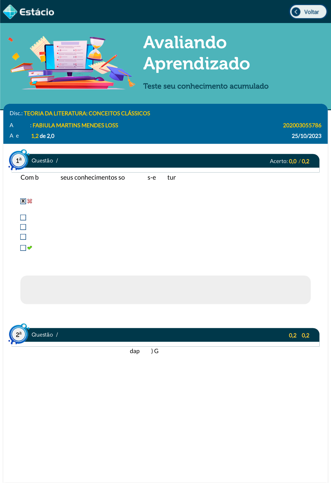 22/11/2023, 16:23 Estácio: Alunos https://simulado.estacio.br/alunos/ 1/5 Avaliando Aprendizado Teste seu conhecimento acumulado Disc.: TEORIA DA LITERATURA: CONCEITOS CLÁSSICOS Aluno(a): FABIULA MARTINS MENDES LOSS 202003055786 Acertos: 1,2 de 2,0 25/10/2023 Acerto: 0,0 / 0,2 Com base nos seus conhecimentos sobre o pós-estruturalismo, assinale a alternativa que representa uma característica distinta desse movimento. O trabalho de Jacques Derrida concebia uma crítica ao que ele chamava de "fonologocentrismo" e "falogocrentrismo". Tinha como representantes teóricos como Gilles Deleuze e Michel Foucault. Utilizava como in�uência pensadores como Freud, Nietzsche e Heidegger. In�uenciou a criação de um movimento teórico chamado ¿desconstrucionismo¿. Criticava e rejeitava o caráter pulsional e imaginário da escrita literária. Respondido em 25/10/2023 23:46:39 Explicação: A resposta correta é: Criticava e rejeitava o caráter pulsional e imaginário da escrita literária. Acerto: 0,2 / 0,2 (Prefeitura de Santa Helena - SC/ 2021 - Adaptada) Gênero literário é expressão utilizada nas diferentes formas de arte, para denominar um conjunto de obras que apresentam características semelhantes de forma e conteúdo. Sobre Gêneros literários analise as assertivas com (V) verdadeiro ou (F) falso: (__) O gênero épico é um texto literário que apresenta aventuras heroicas e eloquentes baseadas na história cultural dos povos, o narrador épico pode construir a narrativa tanto em versos (chama-se versos épicos) quanto em prosa (denominada de narrativa épica). (__) O gênero lírico se refere ao tipo de texto literário onde predomina a expressão de sentimentos e emoções subjetivas do sujeito lírico - o eu lírico. São maioritariamente escritos em verso, sendo textos breves por não apresentarem enredo, mas sim a exteriorização do mundo interior do eu lírico. (__) Dentre os subgêneros líricos, temos: Ode: Poema lírico de exaltação, entusiasmo e alegria, Elegia: Poema lírico melancólico sobre a morte e a tristeza, Idílio: Poema lírico sobre a vida pastoril e bucólica. (__) O gênero dramático é representado apenas por ações, rubricas, cenas e atos, tem por �nalidade expor os atores e atrizes para causar emoção no público assistente de teatro, centrando-se na tragicomédia. Após análise, assinale a alternativa que apresenta a sequência CORRETA dos itens acima, de cima para baixo: Questão / 1 a Questão / 2 a https://simulado.estacio.br/alunos/inicio.asp https://simulado.estacio.br/alunos/inicio.asp javascript:voltar(); javascript:voltar(); 22/11/2023, 16:23 Estácio: Alunos https://simulado.estacio.br/alunos/ 2/5 F, V, F, F. F, V, F, V. V, V, V, V. V, V, V, F. F, F, V, V. Respondido em 25/10/2023 23:48:15 Explicação: Dois grandes modelos estão presentes no teatro: a tragédia e a comédia, não estando centrado na tragicomédia, apenas. O teórico Emil Staiger (1977) defende que a tensão é a essência do gênero dramático, pois a atenção do espectador precisa ser plena e nunca desviada. Nesse sentido, a tensão teria de ser composta por um phatos (um sentimento exacerbado, uma paixão grandiosa formada pelo prazer ou pela dor) e o problema (a di�culdade a ser resolvida no enredo). Acerto: 0,0 / 0,2 Elementos estruturais são partes diferenciadas que, juntas, formam uma estrutura. Sobre os elementos estruturais dos poemas, analise as a�rmativas, abaixo atribuindo V pra verdadeiro e F pra falso. (__) Metro é a unidade rítmica do verso, é de�nida pelo número de sílabas. (__) Estância e Estrofes são o mesmo elemento. (__) Verso é uma linha escrita no poema. (__) Verso deve sempre ter seu sentido completo. (__) Rima não é de�nida como a concordância dos sons, e/ou letras ao �nal do verso. Assinale a alternativa que apresenta a sequência correta, de cima para baixo. V F V F V F F V V F V V F V V F V F V F V V V F F Respondido em 25/10/2023 23:50:34 Explicação: Verso constitui uma linha escrita, seu sentido pode ser completo ou incompleto. Metro é a unidade rítmica do Verso, repetida ou combinada, ele é de�nido pelo número de sílabas que o compõem. A Estrofe, ou estância, é de�nida por um conjunto de versos antecedida e seguida de uma linha em branco. Rima é a concordância de sons, �nais ou interiores, entre um verso e outro, ou no interior do mesmo verso. Acerto: 0,0 / 0,2 Desde os tempos imemoriais as sociedades costumam se reunir em grupos e narrar acontecimentos, histórias, fatos da vida e memórias. Estas narrativas, apresentam um ponto em comum, em termos técnicos, que podemos chamar Questão / 3 a Questão / 4 a 22/11/2023, 16:23 Estácio: Alunos https://simulado.estacio.br/alunos/ 3/5 Elementos de�nitivos. Moral e lição. Elementos de narrativa. Personagens principais. Elementos estruturantes. Respondido em 26/10/2023 00:21:27 Explicação: Todas essas narrativas têm pontos em comum, ou o que se poderia chamar, em termos mais técnicos, de elementos estruturantes. Acerto: 0,2 / 0,2 Monólogo é uma apresentação conduzida e interpretada por apenas um ator, ou atriz, que também é narrador de sua história, levando o público a entender ações e pensamentos deste personagem. Assinale a alternativa que apresenta um dos recursos que pode ser utilizado durante o monólogo. Diálogos com outros personagens. Coros. Farsa. Sottie. Quebra da Quarta Parede. Respondido em 26/10/2023 00:03:10 Explicação: No monólogo, pode acontecer o "rompimento da quarta parede", uma parede imaginária que se encontra entre o lado do palco voltado para o público (as outras paredes reais são as laterais e o fundo do palco). Romper a quarta parede é estabelecer, ainda que a representação dramatúrgica continue, uma relação mais estreita de diálogo, efetivo ou imaginário, com o público. Acerto: 0,2 / 0,2 Há diversas teorias e concepções que buscam de�nir o que é literatura. Pensando nas possíveis de