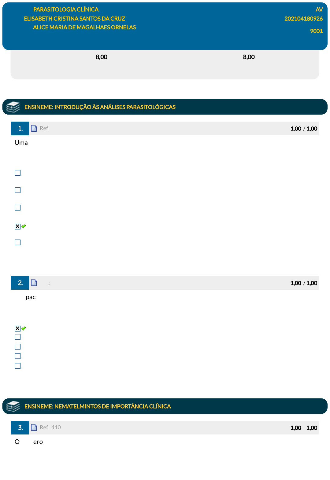 Disciplina: PARASITOLOGIA CLÍNICA AV
