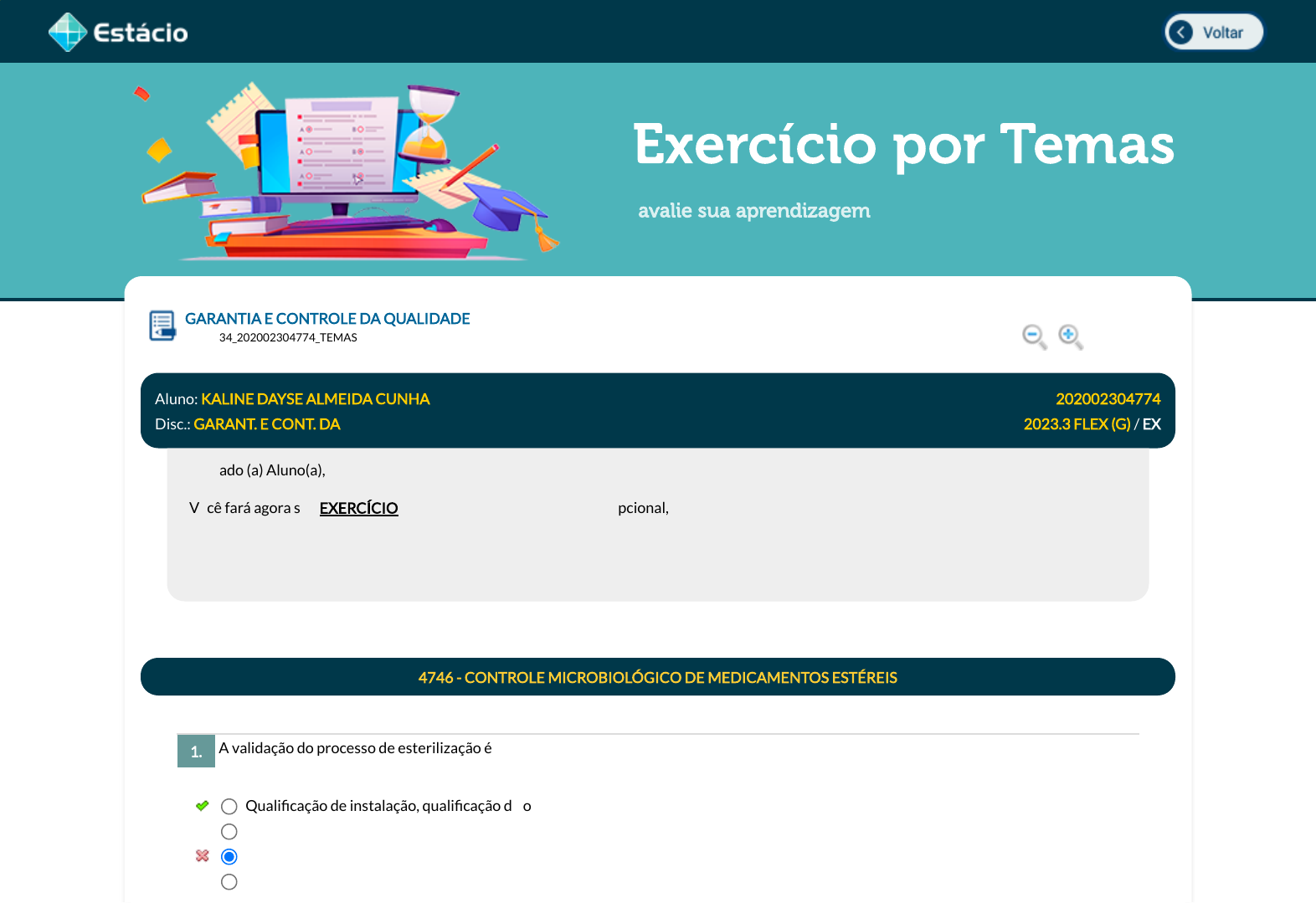Exercício por Temas avalie sua aprendizagem A validação do processo de esterilização é um procedimento que deve ser realizado para comprovar que o método aplicado fornecerá produtos com o nível de garantia de esterilidade exigido na legislação. Os principais elementos dessa validação são: GARANTIA E CONTROLE DA QUALIDADE Lupa SDE4534_202002304774_TEMAS Aluno: KALINE DAYSE ALMEIDA CUNHA Matr.: 202002304774 Disc.: GARANT. E CONT. DA 2023.3 FLEX (G) / EX Prezado (a) Aluno(a), Você fará agora seu EXERCÍCIO! Lembre-se que este exercício é opcional, mas não valerá ponto para sua avaliação. O mesmo será composto de questões de múltipla escolha. Após responde cada questão, você terá acesso ao gabarito comentado e/ou à explicação da mesma. Aproveite para se familiarizar com este modelo de questões que será usado na sua AV e AVS. 4746 - CONTROLE MICROBIOLÓGICO DE MEDICAMENTOS ESTÉREIS 1. Quali�cação de instalação, quali�cação de operação e quali�cação de desempenho Quali�cação de fornecedor, quali�cação de operação e quali�cação de desempenho Quali�cação de instalação, quali�cação de operação e quali�cação de certi�cação Quali�cação de certi�cação, quali�cação de operação e quali�cação de desempenho javascript:voltar(); javascript:voltar(); javascript:voltar(); javascript:voltar(); javascript:diminui(); javascript:diminui(); javascript:aumenta(); javascript:aumenta(); (IBADE/2020) O termo esterilização, conforme aplicado aos diversos tipos de materiais de uso laboratorial, signi�ca a destruição completa de todos os organismos vivos e seus esporos ou sua remoção total da preparação. ANSEL, Howard C.; POPOVICH, Nicholas G.; ALLEN JUNIOR, Loyd V. Formas farmacêuticas e sistemas de liberação de fármacos. 9. ed. Porto Alegre: Artmed, 2013. A partir do conhecimento sobre as técnicas de esterilização observe as a�rmativas abaixo: I. O calor úmido tende a ser menos e�caz do que o calor seco para esterilização, portanto, temperaturas mais altas e períodos mais longos de exposição são necessários. II. O mecanismo de destruição microbiana pelo calor úmido ocorre por desnaturação e coagulação de proteínas essenciais ao microrganismo. III. As células bacterianas com grande quantidade de água são mortas com mais facilidade, os esporos, que contém uma menor quantidade de água são, em termos comparativos, mais difíceis de destruir. IV. A esterilização correta de um produto é assegurada pela escolha do método de esterilização adequado, pela realização correta do método e pela validação de todo o processo. Dos itens acima mencionados, estão corretos apenas: Quali�cação de instalação, quali�cação de fornecedor e quali�cação de desempenho Data Resp.: 24/11/2023 10:17:40 Explicação: Durante a validação de um processo, é necessário proceder as quali�cações de instalação, operação e desempenho, de forma a garantir que os equipamentos utilizados estão instalados e funcionando da maneira correta, e são capazes de esterilizar o produto ou os materiais necessários. 2. I e II I e IV III e IV II, III e IV I, II e III Data Resp.: 24/11/2023 10:17:43 Explicação: O calor úmido é, em geral, mais e�ciente que o calor seco, e utiliza temperaturas e tempos menores para esterilizar o material. Ao passo que o calor seco necessita de temperaturas acima de 160°C e períodos de pelo menos duas horas, o ciclo padrão de calor úmido utiliza a temperatura de 121°C por 15 minutos. Já as outras a�rmativas estão todas corretas. 3. (COPEVE/2012 - adaptada) Os indicadores biológicos procuram demonstrar se as condições foram adequadas para se alcançar a esterilização. Esta é a vantagem dos indicadores biológicos sobre os indicadores químicos, que somente medem um conjunto especí�co de condições projetadas arti�cialmente. Portanto, o controle biológico utilizado para indicar a certi�cação da e�cácia do processo de esterilização é feito mediante: Os produtos injetáveis devem estar livres de pirogênio, uma vez que serão administrados diretamente na corrente sanguínea do paciente e não deseja-se que este desenvolva febre. Existem dois métodos farmacopeicos para a detecção da contaminação pirogênica: o teste em __________ e o teste do lisado de amebócitos do limulus também chamado como ensaio de __________. Marque a alternativa que preenche as lacunas. Esporos de cepas de microrganismos Níveis de coagulação Fita teste Bowie & Dick Parâmetros frontais da autoclave Data Resp.: 24/11/2023 10:17:46 Explicação: Os indicadores biológicos são microrganismos de referência especí�cos, que se saiba que possui uma resistência conhecida e estável a um determinado processo de esterilização. Em geral, são utilizados os esporos destes microrganismos, de forma a indicar que o procedimento de esterilização ocorreu da maneira adequada. Os parâmetros frontais da autoclave são as con�gurações estabelecidas para o ciclo ocorrer. Já a �ta teste e o teste de Bowie e Dick são indicadores químicos utilizados para garantir que a autoclave atingiu a temperatura e a pressão desejadas. Os níveis de coagulação já são ligados ao teste de endotoxina bacteriana in vitro, o LAL. 4. Ratos, esterilidade Ratos, endotoxina bacteriana Hamsters, endotoxina bacteriana Coelhos, esterilidade Coelhos, endotoxina bacteriana Data Resp.: 24/11/2023 10:17:49 Explicação: Os animais utilizados para o teste de pirogênio in vivo são os coelhos, não sendo possível a realização do ensaio com hamsters ou ratos. O teste de esterilidade não veri�ca a presença de pirogênios, mas sim de microrganismos viáveis. (COMPERVE/2016 - Adaptada) Um teste de pirogênios foi realizado em uma solução injetável com o seguinte resultado: De acordo com o resultado apresentado, o produto em análise: (Escola de Saúde do Exército (