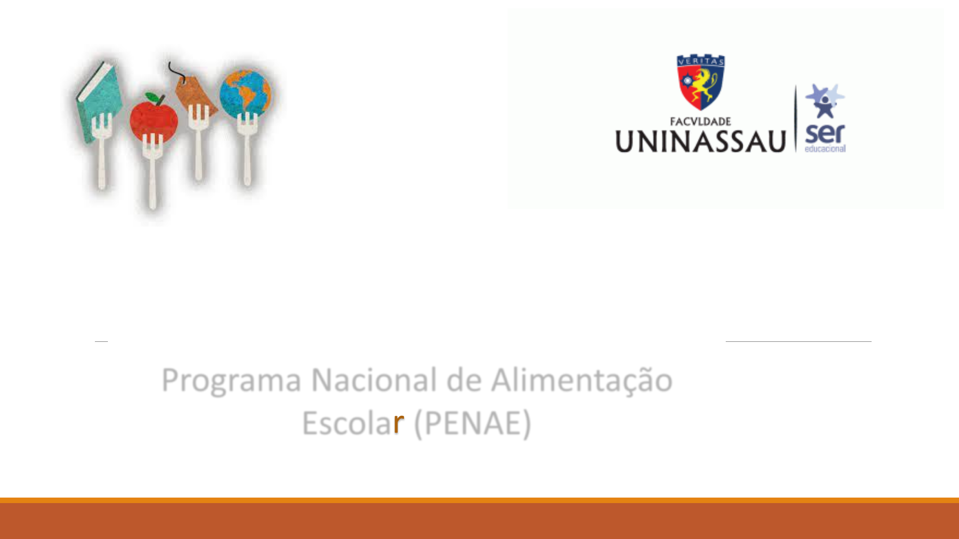 Educação Nutricional PROFA . DR A . K A R LA K A L I GIA S . BOR BA Programa Nacional de Alimentação Escolar (PENAE) Programa Nacional de Alimentação Escolar (PENAE) O PNAE consiste na transferência de recursos financeiros do Governo Federal, em caráter suplementar, aos estados, Distrito Federal e municípios, para a aquisição de gêneros alimentícios destinados à merenda escolar. Origem O PNAE teve sua origem na década de 40. Mas foi em 1988, com a promulgação da nova Constituição Federal, que o direito à alimentação escolar para todos os alunos do Ensino Fundamental foi assegurada. Objetivos Contribuir para o crescimento, desenvolvimento, rendimento escolar e formação de hábitos alimentares saudáveis dos alunos da rede pública de ensino. Princípios ▪Universalidade ▪Equidade ▪Participação social ▪Respeito aos hábitos alimentares locais ▪Descentralização das ações Diretrizes ▪Emprego de alimentação saudável e adequada ▪Aplicação de educação alimentar e nutricional no processo de ensino-aprendizagem ▪Apoio ao desenvolvimento sustentável – incentivo a aquisição de gêneros da agricultura familiar. Formas de execução ▪Centralizada ▪Descentralizada ▪Mista Co-responsabilidades PNAE FNDE CAE Nutricionis ta RT Entidades Executoras Alunos da educação básica pública Fundo Nacional de Desenvolvimento da Educação Autarquia vinculada ao Ministério da Educação. Normatização, Assistência financeira Coordenação Acompanhamento, Monitoramento, Cooperação técnica e Fiscalização da execução do programa. Beneficiários •Alunos da educação infantil ✓Creches ✓ Pré-escolas •Ensino fundamental •EJA •Comunidades indígenas •Áreas remanescentes de quilombos •Escolas federais •Escolas filantrópicas Nutricionista RT ▪Planejar os cardápios ▪Coordenar o diagnóstico e monitoramento do estado nutricional dos estudantes ▪ Acompanhar a aquisição dos gêneros alimentícios, produção e distribuição da alimentação ▪Promover e avaliar ações de educação alimentar ▪Capacitação do RH ▪Realizar controle higiênico-sanitário e da qualidade dos alimentos. Cardápios Hábitos alimentares regionais Explorar os gêneros alimentícios encontrados na agricultura familiar Cobertura das necessidades nutricionais: ✓ 30% das necessidades nutricionais dos escolares indígenas e de áreas remanescentes quilombolas; ✓15% das necessidades dos demais escolares.