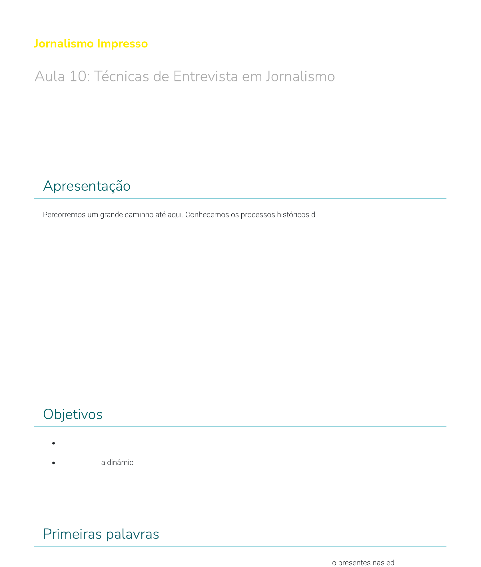 Jornalismo Impresso Aula 10: Técnicas de Entrevista em Jornalismo Apresentação Percorremos um grande caminho até aqui. Conhecemos os processos históricos de evolução da comunicação impressa. Re�etimos sobre a diferença entre informação e notícia, bem como os critérios de noticiabilidade que orientam a produção da notícia. Trabalhamos algumas das técnicas de construção da notícia e aprofundamos o conhecimento sobre os gêneros e formatos jornalísticos, além, de entender como funciona a produção no jornalismo impresso e algumas das técnicas usadas nas redações. Nesta última aula, continuaremos a estudar sobre as técnicas de produção e redação jornalística, como foco para o uso de entrevistas no jornalismo. Vamos conhecer os tipos de entrevistas que são utilizados no jornalismo impresso e quais técnicas são usadas pelos jornalistas neste processo. As entrevistas são elementos que quali�cam e enriquecem muito os produtos jornalísticos. Por isso, encerraremos nossa disciplina com esse conteúdo de grande importância para a vida pro�ssional de todo jornalista. Objetivos Identi�car os tipos de entrevistas usados no jornalismo impresso; Reconhecer a dinâmica e as técnicas usadas pelos jornalistas no processo das entrevistas. Primeiras palavras Em aulas anteriores, conhecemos os diversos gêneros e formatos jornalísticos que estão presentes nas edições dos jornais. Temos, dentre os formatos jornalísticos, a entrevista, que compõem o quadro dos formatos do gênero informativo, segundo a classi�cação de José Marques de Melo que estudamos na disciplina. Ao olharmos para a história dos processos de comunicação, podemos identi�car que as origens da entrevista remontam a 1836, quando James Gordon Bennet fez perguntas a Rosina Townsend, proprietária de um prostíbulo de Nova York no qual teria ocorrido um assassinato. Segundo registros de Mário Erbolato no livro Técnicas de codi�cação em jornalismo- redação, captação e edição do jornal diário. Neste sentido, a entrevista ocupa um importante papel na construção e na legitimação da prática do jornalismo informativo em diferentes países do mundo. A técnica de entrevista usada pelos jornalistas ajudou na a�rmação da identidade pro�ssional do grupo. Nesta que é a nossa última aula, buscaremos compreender como os principais autores do jornalismo classi�cam e conceituam entrevista, identi�cando assim os tipos de entrevistas usados no jornalismo impresso, bem como conhecer a dinâmica e as técnicas usadas pelos pro�ssionais neste processo. Vamos lá? O conceito de entrevista Diversos autores já se dedicaram a re�etir sobre a função, os tipos e as interpretações em torno do conceito de entrevista. Alguns brasileiros se destacam neste quadro de autores, dentre eles três já apresentados em outras aulas da disciplina: Luiz Beltrão, José Marques de Melo e Nilson Lage. Em seu livro A imprensa informativa, Luiz Beltrão (1969) de�ne a entrevista como a técnica de obter matérias de interesse jornalístico por meio de perguntas e respostas. José Marques de Melo de�ne entrevista, em sua obra Gêneros de Comunicação Massiva como um relato que privilegia a versão de um ou mais protagonistas dos acontecimentos. Nilson Lage (2001), em seu clássico livro A reportagem: teoria e técnica de entrevista e pesquisa jornalística, argumenta que a palavra entrevista é ambígua, pois signi�ca tanto diálogo com a fonte, como matéria publicada. Partindo dos conceitos apresentados acima e da re�exão sobre os principais usos de entrevistas no jornalismo, Luiz Amaral (1987), a�rma em seu livro Técnicas de jornal e periódico que é possível distinguir dois tipos de entrevistas: A entrevista é um dos principais instrumentos usados pelos jornalistas para exercer a apuração das informações que são indispensáveis para a sua produção jornalística. É através dos dados obtidos nas entrevistas que o repórter constrói seu texto, seja com declarações citadas entre aspas ou em formato pingue-pongue, também conhecida como perguntas e respostas. Luiz Amaral (1987) comenta que nos dois tipos de entrevista o jornalista funciona como um intermediário do leitor que tem interesse em ambas as abordagens. Diante do entrevistado, o jornalista é a própria representação do seu leitor, ou receptor, isso signi�ca que o bom jornalista deve conhecer o seu público para que em ocasiões como a de realizar entrevistas faça perguntas que realmente representem o interesse da maioria. Segundo Luiz Amaral (1997), o ato de entrevistar não é somente fazer perguntas, esperar uma resposta e juntar à resposta outra pergunta. Trata-se de um exercício pro�ssional trabalhoso. A relação entre o interesse do jornal e do entrevistado nem sempre está em sintonia. Muitas vezes, quanto maior é o interesse do jornal em conseguir a entrevista, menor o do entrevistado em concedê-la, e vice-versa., como matéria publicada. As tipologias da entrevista É muito importante compreender as principais classi�cações dos tipos de entrevistas. Diversos autores estruturaram propostas de tipologias para classi�car entrevistas. Apresentaremos a seguir as principais. A primeira tipologia que vamos estudar é a proposta por Edgar Morin (1986), que de�ne a entrevista como uma comunicação pessoal, realizada com objetivo de informação e propõe a seguinte classi�cação: CLASSIFICAÇÃO TIPO Espetacularização – Entrevista-rito – Entrevista anedótica Compreensão – Entrevista diálogo – Neoconfissões Atenção! Para visualização completa da tabela utilize a rolagem horizontal Classificação de entrevista por Edgar Morin. (Fonte: Autor). Outra proposta de classi�cação é a desenvolvida por Cremilda Medina (1986), que entende a entrevista como uma técnica de obtenção de informações que recorre ao particular. CLASSIFICAÇÃO TIPO Espetacularização 