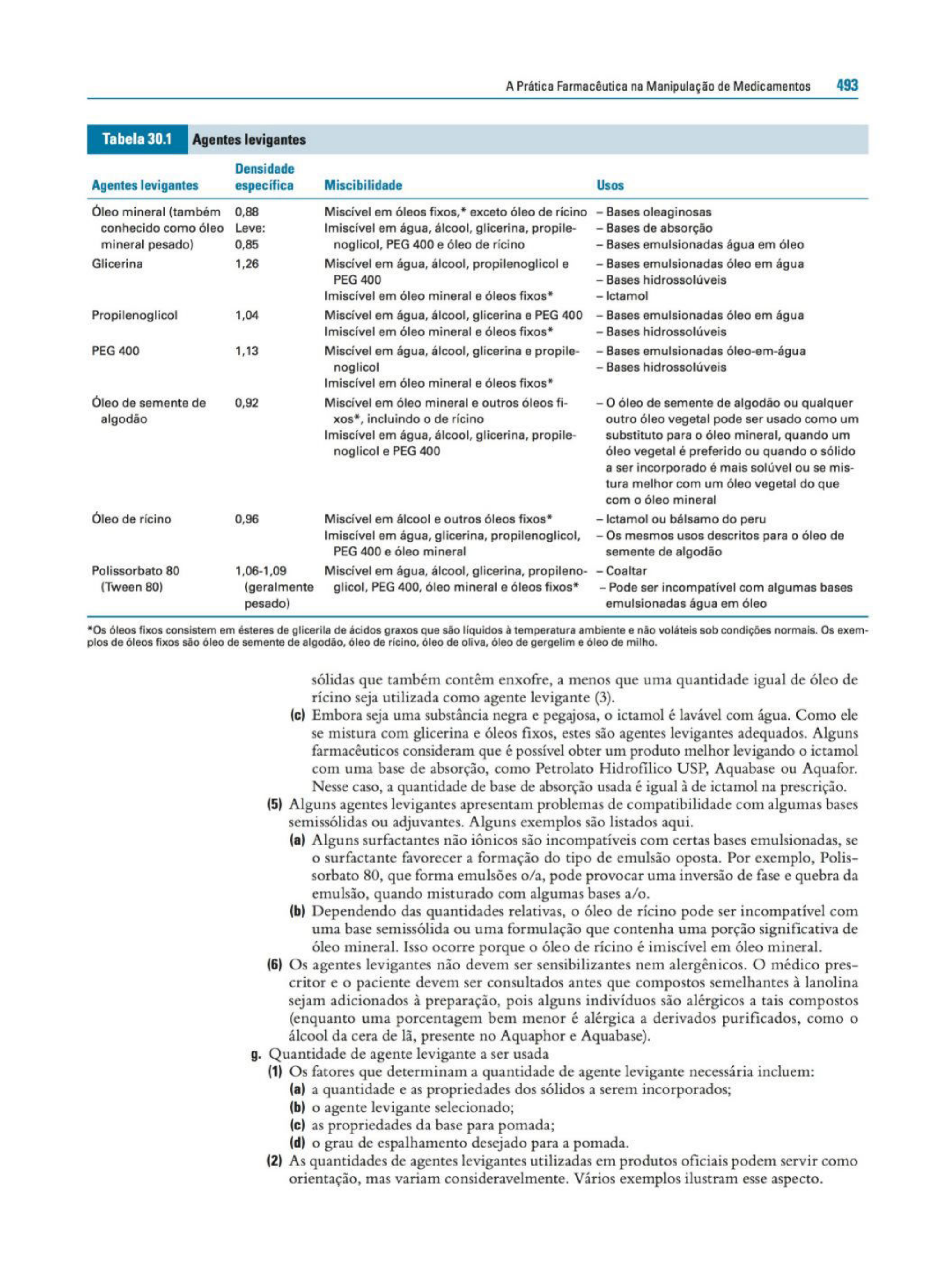 A Prática Farmacêutica na Manipulação de Medicamentos 493 Tabela 30.1 Agentes levigantes Agentes levigantes Óleo mineral (também conhecido como óleo mineral pesado) Glicerina Propilenoglicol PEG 400 Óleo de semente de algodão Óleo de rícino Polissorbato 80 (Tween 80) Densidade específica 0,88 Leve: 0,85 1,26 1,04 1, 13 0,92 0,96 1,06-1,09 (geralmente pesado) Miscibilidade Miscivel em óleos fixos,* exceto óleo de rícino !miscível em água, álcool, glicerina, propile· nogliool, PEG 400 e óleo de ricino Miscível em água, álcool, propilenoglicol e PEG400 lmiscivel em óleo mineral e óleos fixos* Miscível em água, álcool, glicerina e PEG 400 !miscível em óleo mineral e óleos fixos* Miscivel em água, álcool, glicerina e propile· noglicol !miscível em óleo mineral e óleos fixos* Miscível em óleo mineral e outros óleos fi. xos•, incluindo o de ricino !miscível em água, álcool, glicerina, propile- noglicol e PEG 400 Miscível em álcool e outros óleos fixos• !miscível em água, glicerina, propilenoglicol, PEG 400 e óleo mineral Miscível em água, álcool, glicerina, propileno- glícol, PEG 400, óleo mineral e óleos fixos• Usos - Bases oleaginosas - Bases de absorção - Bases emulsionadas água em óleo - Bases emulsionadas óleo em água - Bases hidrossolúveis - lctamol - Bases emulsionadas óleo em água - Bases hidrossolúveis - Bases emulsionadas óleo-em-água - Bases hidrossolúveis - O óleo de semente de algodão ou qualquer outro óleo vegetal pode ser usado como um substituto para o óleo mineral, quando um óleo vegetal é preferido ou quando o sólido a ser incorporado é mais solúvel ou se mis- tura melhor com um óleo vegetal do que com o óleo mineral - lctamol ou bálsamo do peru - Os mesmos usos descritos para o óleo de semente de algodão - Coaltar - Pode ser incompatível com algumas bases emulsionadas água em óleo •os óleos fixos consistem em êsteres de gllcerila de ãcidos graxos que slio llquldos à temperatura ambiente e nào volãtels sob condições normais. Os exem- plos de óleos fixos são óleo de semente de algodão. óleo de ricino, óleo de oliva, óleo de gergelim e óleo de milho. sólidas que tan1bém contêm enxofre, a 1nenos que urna quantidade igual de óleo de rícino seja util izada como agente levigante (3). (e) Embora seja un1a substância negra e pegajosa, o ictamol é lavável co1n água. Como ele se mistura com glicerina e óleos fixos, estes são agentes levigantes adequados. Alguns farmacêuticos considerarn que é possível obter um produto melhor levigando o ictamol com uma base de absorção, con10 Petrolato Hidrofilico USP, Aquabase ou Aquafor. Nesse caso, a quantidade de base de absorção usada é igual à de ictamol na prescrição. (5) Alguns agentes levigantes apresentan1 proble1nas de co1nparibilidade com algun1as bases semissólidas ou adjuvantes. Alguns exemplos são listados aqui. (a) Alguns surfa.ctantes não iônicos são incompatíveis com certas bases emulsionadas, se o surfactante favorecer a formação do tipo de emulsão oposta. Por exemplo, Polis- sorbato 80, que forma emulsões o/a, pode provocar uma inversão de fase e quebra da emulsão, quando 1nisturado com algumas bases a/o. (b) Dependendo das quantidades relativas, o óleo de rícino pode ser incompatível com u111a base semissólida ou uma forn1ulação que contenha un1a porção significativa de óleo mineral. Isso ocorre porque o óleo de rícino é imiscível em óleo mineral (6) Os agentes levigantes não devem ser sensibilizantes nem alergênicos. O médico pres- critor e o paciente devern ser consultados antes que con1postos semelhantes à lanolina. sejan1 adicionados à preparação, pois alguns indivíduos são alérgicos a tais co1npostos (enquanto un1a porcentagem ben1 nlenor é alérgica a derivados purificados, como o álcool da cera de lã, presente no Aquaphor e Aquabase). g. Quantidade de agente levigante a ser usada (1) Os fatores que determinam a quantidade de agente levigante necessária incluen1: (a) a quantidade e as propriedades dos sólidos a serem incorporados; (b) o agente levigante selecionado; (e) as propriedades da base para pomada; (d) o grau de espalhamento desejado para a po1nada. (2) As quantidades de agentes levigantes utilizadas en1 produtos oficiais podem servir como orientação, mas variam consideravelmente. Vários exemplos ilustram esse aspecto.
