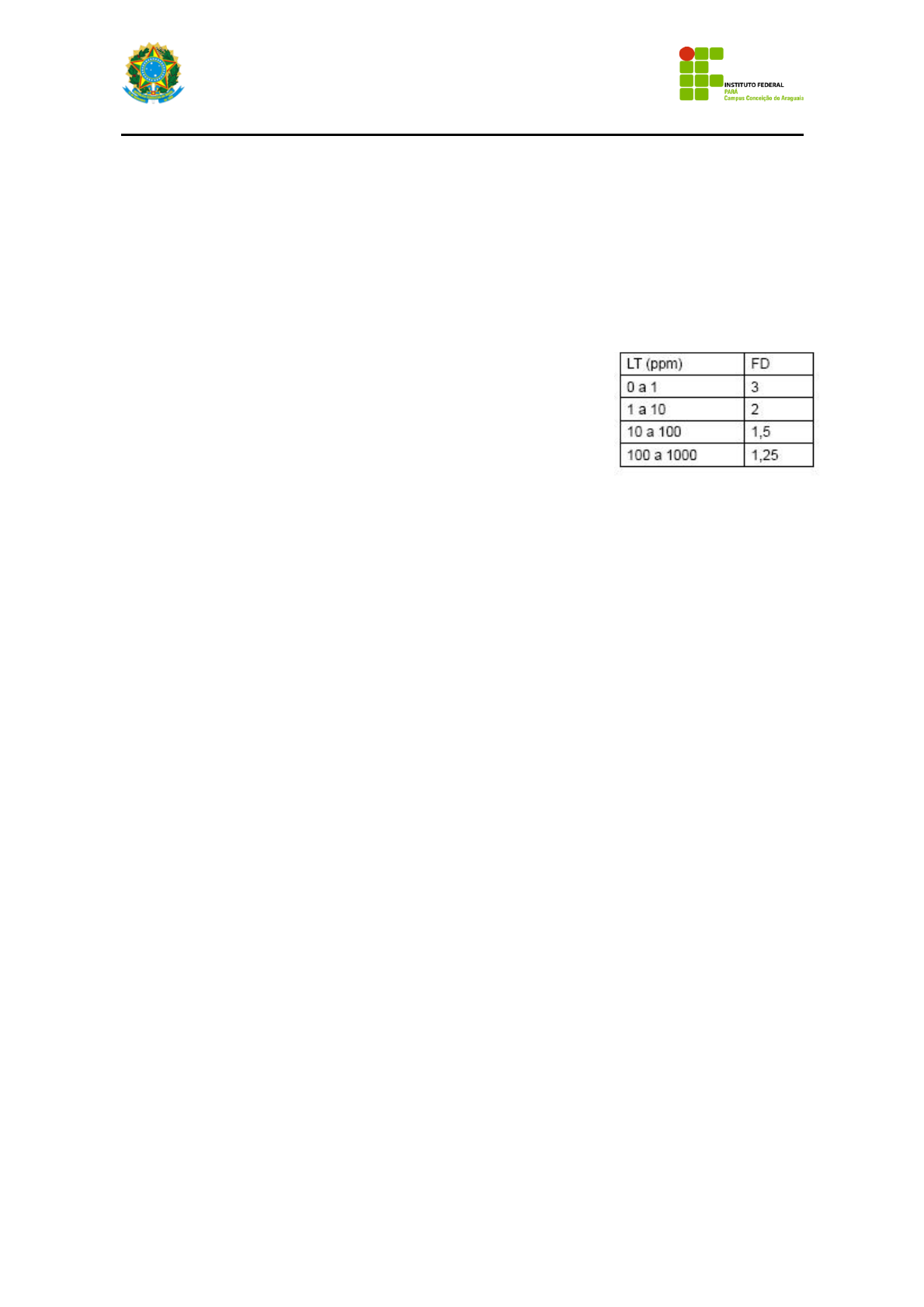 INSTITUTO FEDERAL DE EDUCAÇÃO, CIÊNCIA E TECNOLOGIA DO PARÁ CAMPUS CONCEIÇÃO DO ARAGUAIA TÉCNICO EM SEGURANÇA DO TRABALHO Professor: Alessandro dos S. Vieira Disciplina: Higiene do Trabalho II – 60hs Aluno: Data: Exercícios 1. Verifique se o Valor Máximo foi ultrapassado? Uma avaliação ambiental do ácido clorídrico numa jornada de trabalho de 8 horas, tomada em intervalos de 40 minutos, apresentou as seguintes concentrações: 1ª e 5ª avaliação = 7ppm ; 4ª, 9ª e 8ª avaliação = 4ppm; 2ª e 7ª avaliação = 2ppm; 3ª, 6ª e 10ª avaliação = 3ppm. Informações complementares ácido clorídrico Limite de tolerância (LT) = 4ppm* Absorção também pela pele = Não Valor Teto = Sim *Partes de vapor ou gás por milhão de partes de ar contaminado. 2. Em relação a gases e vapores, a NR 15, Anexo-11 (Tabela de limites de tolerância), considera que a) a absorção de agentes químicos pelas vias respiratória e cutânea tem todos os valores fixados válidos. b) a concentração de um produto químico que não possua valor teto pode exceder o limite de tolerância, desde que não ultrapasse o valor máximo, e a concentração média fique abaixo do limite de tolerância. c) o manuseio de substâncias químicas classificadas como asfixiantes simples apresenta insalubridade no grau máximo. d) o valor teto de uma substância não pode ultrapassar o produto do limite de tolerância pelo fator de desvio estabelecido. e) um risco grave e iminente ocorre com substâncias que não possuem valor teto, quando qualquer uma das concentrações obtidas nas amostragens ultrapassar os valores fixados. 3. A Tabela constante no Quadro 1 do Anexo 11 da NR 15 apresenta os limites de tolerância para agentes químicos. Qual é a via de absorção considerada pela Tabela, que deve ser, portanto, a prioritária para a proteção, e qual o critério utilizado para caracterizar a insalubridade, respectivamente? a) Dermatológica; ultrapassar o valor teto. b) Dermatológica; ultrapassar o limite de tolerância. c) Respiratória; ultrapassar o limite de tolerância. d) Respiratória; ultrapassar o valor teto. e) Respiratória; ultrapassar o nível de ação. 4. Em relação a gases e vapores, a NR 15, Anexo-11 (Tabela de limites de tolerância), considera que a) a absorção de agentes químicos pelas vias respiratória e cutânea tem todos os valores fixados válidos. b) a concentração de um produto químico que não possua valor teto pode exceder o limite de tolerância, desde que não ultrapasse o valor máximo, e a concentração média fique abaixo do limite de tolerância. c) o manuseio de substâncias químicas classificadas como asfixiantes simples apresenta insalubridade no grau máximo. Quadro de Fator de Desvio (FD) INSTITUTO FEDERAL DE EDUCAÇÃO, CIÊNCIA E TECNOLOGIA DO PARÁ CAMPUS CONCEIÇÃO DO ARAGUAIA TÉCNICO EM SEGURANÇA DO TRABALHO Professor: Alessandro dos S. Vieira Disciplina: Higiene do Trabalho II – 60hs d) o valor teto de uma substância não pode ultrapassar o produto do limite de tolerância pelo fator de desvio estabelecido. e) um risco grave e iminente ocorre com substâncias que não possuem valor teto, quando qualquer uma das concentrações obtidas nas amostragens ultrapassar os valores fixados. 5. O gráfico abaixo mostra o resultado de 10 amostragens instantâneas realizadas com aparelho de leitura direta, conforme metodologia estabelecida na NR-15, anexo 11. As amostragens têm o objetivo de avaliar as condições de segurança e saúde no trabalho de um operador de uma unidade de processo em uma indústria petroquímica. Sabendo-se que a substância química possui limite de tolerância de 20 ppm, não possui valor teto e pode ser absorvida pela pele, constata-se que o(a) a) valor máximo é de 40 ppm. b) concentração média é de 20 ppm. c) atividade é considerada de risco grave e iminente. d) atividade é considerada insalubre. e) atividade não é considerada insalubre.