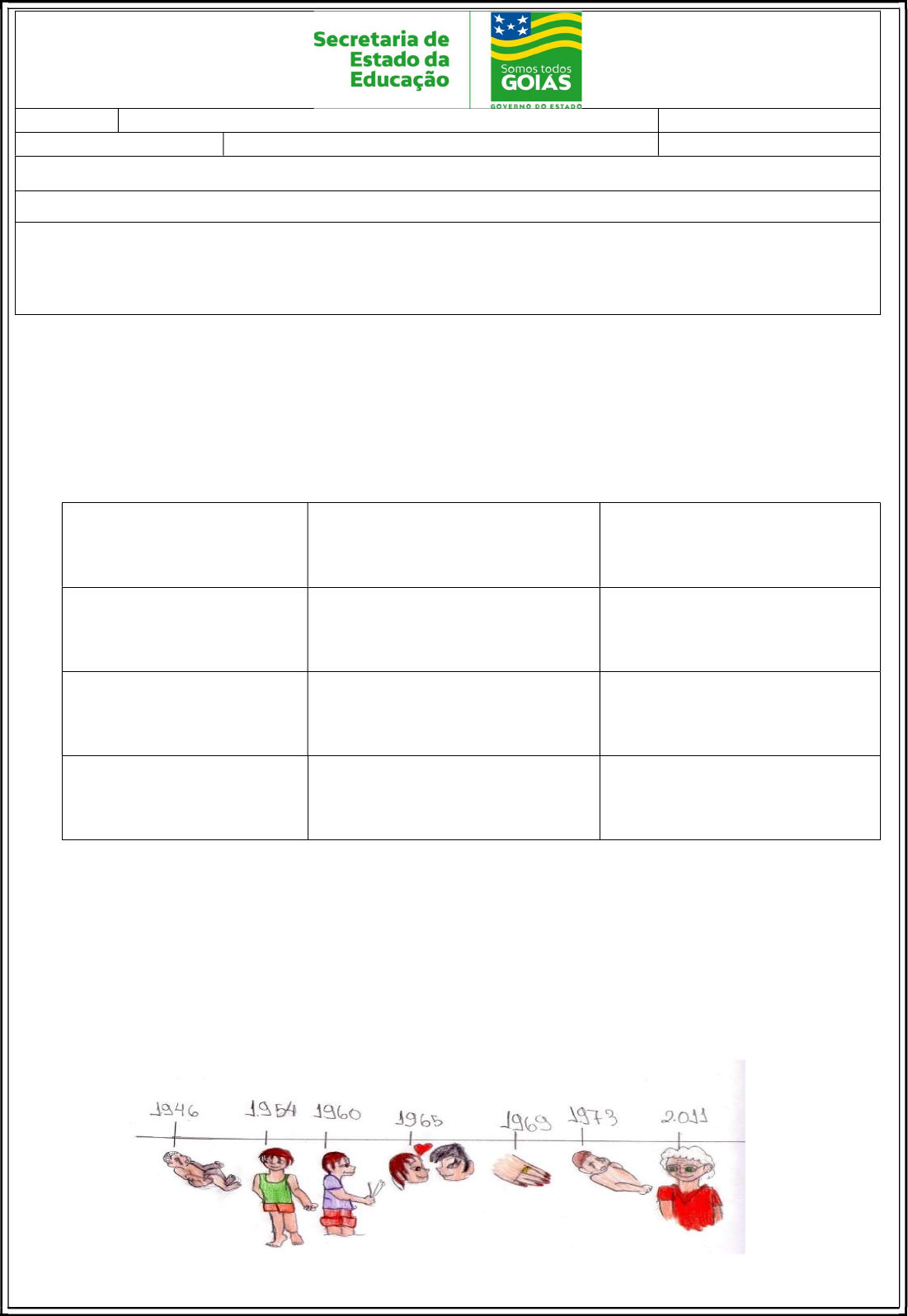 Nome: Data: ___/___/2020 Unidade Escolar: Ano: 6 º Componente Curricular: História Tema/ Conhecimento: Tempo, espaço e formas de registros. Habilidade: EF06HI01) Identificar diferentes formas de compreensão da noção de tempo e de periodização dos processos históricos (continuidades e rupturas). (GO-EF06HI01-A) Identificar as diferentes concepções da História, compreendendo que esta é a ciência que estuda as ações dos homens no tempo e que o espaço concebido pelos historiadores deve ser entendido como uma construção social. ATIVIDADES 01. Pesquise em livros, internet ou entreviste seus familiares e preencha o calendário a seguir com as datas comemorativas e o início de cada estação do ano: CALENDÁRIO DATAS COMEMORATIVAS E ESTAÇÕES DO ANO JANEIRO FEVEREIRO MARÇO ABRIL MAIO JUNHO JULHO AGOSTO SETEMBRO OUTUBRO NOVEMBRO DEZEMBRO 02. Agora responda no seu caderno: a) Esses eventos se repetem? b) De quanto em quanto tempo esses eventos se repetem? 03. A imagem a seguir retrata a linha de tempo de uma determinada pessoa. Do nascimento até o dia ela a elaborou. Perceba que as datas elas estão em ordem crescente. Agora faça uma linha do tempo de sua vida até a presente data, registrando os marcos importantes de sua história. Coloque em cada um dos quadros indicados pelas setas o ano e evento, como: data de nascimento, início da escolarização, e assim por diante, aquilo que você acha interessante e que julgar ser marco importante para sua história. Pode desenhar como o exemplo ou colocar o nome do evento e a data do seu acontecimento. a) Que elementos vocês destacaram sobre vocês? b) Você colocou tudo sobre a sua vida ou teve que fazer uma seleção? c) Porque você colocou estes acontecimentos? Quais critérios utilizou para selecionar? d) Os eventos seguem uma sequência cronológica formando uma reta crescente? e) Entreviste pelo menos uma pessoa de seu convívio sobre as datas e os eventos que marcaram suas vidas, compare com a sua linha de tempo. As datas e os eventos são os mesmos? f) Por que você pensa que eles diferem? 04. Agora leia o texto do quadro a seguir. A perspectiva linear de tempo nasceu com a tradição judaico- cristã. O tempo linear é uma sucessão contínua de eventos irrepetíveis e irreversíveis. O seu movimento é retilíneo – reta ininterrupta de registros históricos singulares. Como traço histórico perpétuo, o tempo linear é uma série evolutiva de fatos históricos inéditos. Trata-se do curso progressivo de acontecimentos únicos em direção ao futuro. Por fim, o tempo linear é dotado de significado. O seu desdobramento de momentos inalteráveis é orientado por um propósito final (télos). Ou seja, todos os eventos possuem sentido na medida em que ocorrem em vista de uma finalidade última. Em contraposição ao conceito temporal linear, os gregos primitivos propunham uma ideia cíclica de tempo. Sem começo nem fim, o tempo cíclico é um eterno retorno. Uma vez que nenhum evento é absoluto, o tempo cíclico repousa na permanente sequência de ciclos repetitivos. O seu movimento circular contínuo é caracterizado pelo perpétuo retorno de momentos. Isso significa que a história não comporta nenhum fato singular. Pelo contrário, a história é marcada pela reedição de acontecimentos passados. Portanto, o tempo para os gregos antigos não passa de um círculo inexorável – sem saída e sem fim. Tudo está condenado a girar eternamente na roda da história. Disponível em: https://serurbano.wordpress.com/2010/02/28/o-tempo-linear-e-o-tempo-ciclico/acesso 20/03/2020. (adaptado) Na China e muitas comunidades chinesas em todo o mundo, usam o calendário chinês, que antecede o calendário gregoriano. O calendário chinês é um calendário lunissolar, que é usado para determinar datas em festivais importantes, como o Ano Novo Chinês. Ele é baseado em observações astronômicas exatas de longitude do Sol e as fases da lua. Ele tenta ter seus anos coincidindo com o ano tropical e compartilha algumas semelhanças com o calendário judaico. Estas semelhanças são que: um ano comum tem 12 meses e um ano bissexto tem 13 meses; e um ano comum tem 353-355 dias, enquanto um ano bissexto tem 383-385 dias. Embora o calendário chinês originasse da China, o calendário gregoriano é usado na China para fins civis em tempos modernos. No entanto, o calendário chinês ainda é usado entre várias comunidades chinesas em todo o mundo. Ele é usado para determinar datas festivas, como o Ano Novo Chinês, assim como datas auspiciosas, como datas de casamento. É também usado para determinar as fases da lua. Cada ano é atribuído um nome composto por dois componentes dentro de cada ciclo de 60 anos. Disponível em:https://www.portalsaofrancisco.com.br/historia-geral/calendario-chines acesso 20/03/2020. (adaptado) Os povos indígenas também têm uma maneira própria de marcar a passagem do tempo. Para alguns desses povos, a passagem do tempo está relacionada à agricultura e aos fenômenos naturais, como a chuva e o frio. Os índios brasileiros não tinham mais que rudimentos mínimos de um calendário, sem qualquer teorização ou padronização. Conheciam apenas as quatro fases da lua e sua repetição cíclica, e notavam algumas mudanças, como as épocas de calor, chuva, frio, cheias dos rios, piracema, amadurecimento dos frutos. Não dividiam o dia em horas. O povo Amondawa que vive nas profundezas das florestas tropicais da Amazônia do Brasil não têm relógios ou calendários e vive suas vidas com os padrões de dia e de noite e as estações chuvosa e seca. Eles também não têm idade – e marca a transição da infância para a idade adulta até a velhice, mudando seu nome. Eles mudam seus nomes para refletir o estágio de vida e posição dentro da sociedade. Disponível em:https://www.portalsaofrancisco.com.br/historia-geral/calendario-indigena acesso 20/03/2020. (adaptado) Calendário Indígena Disponív